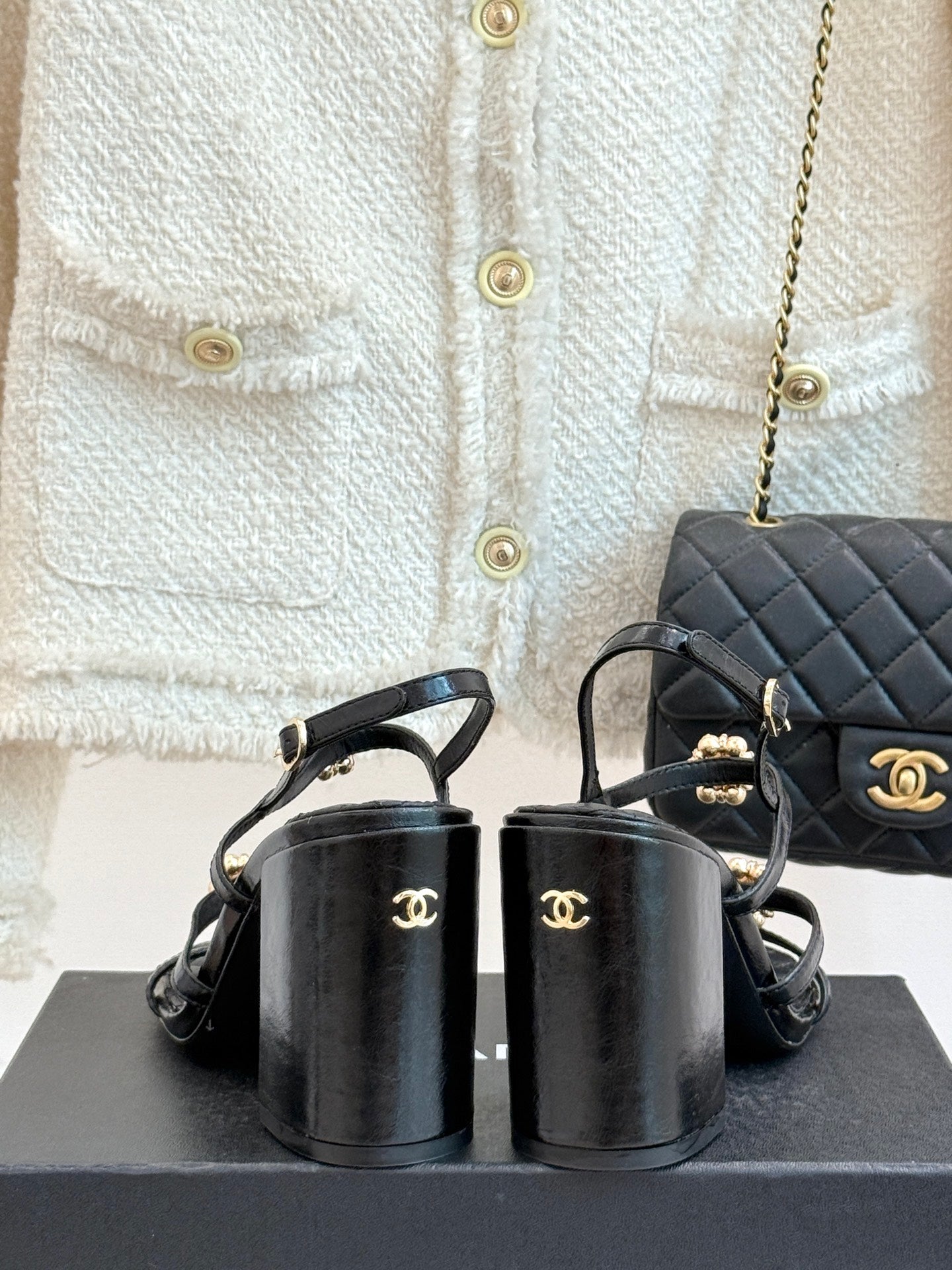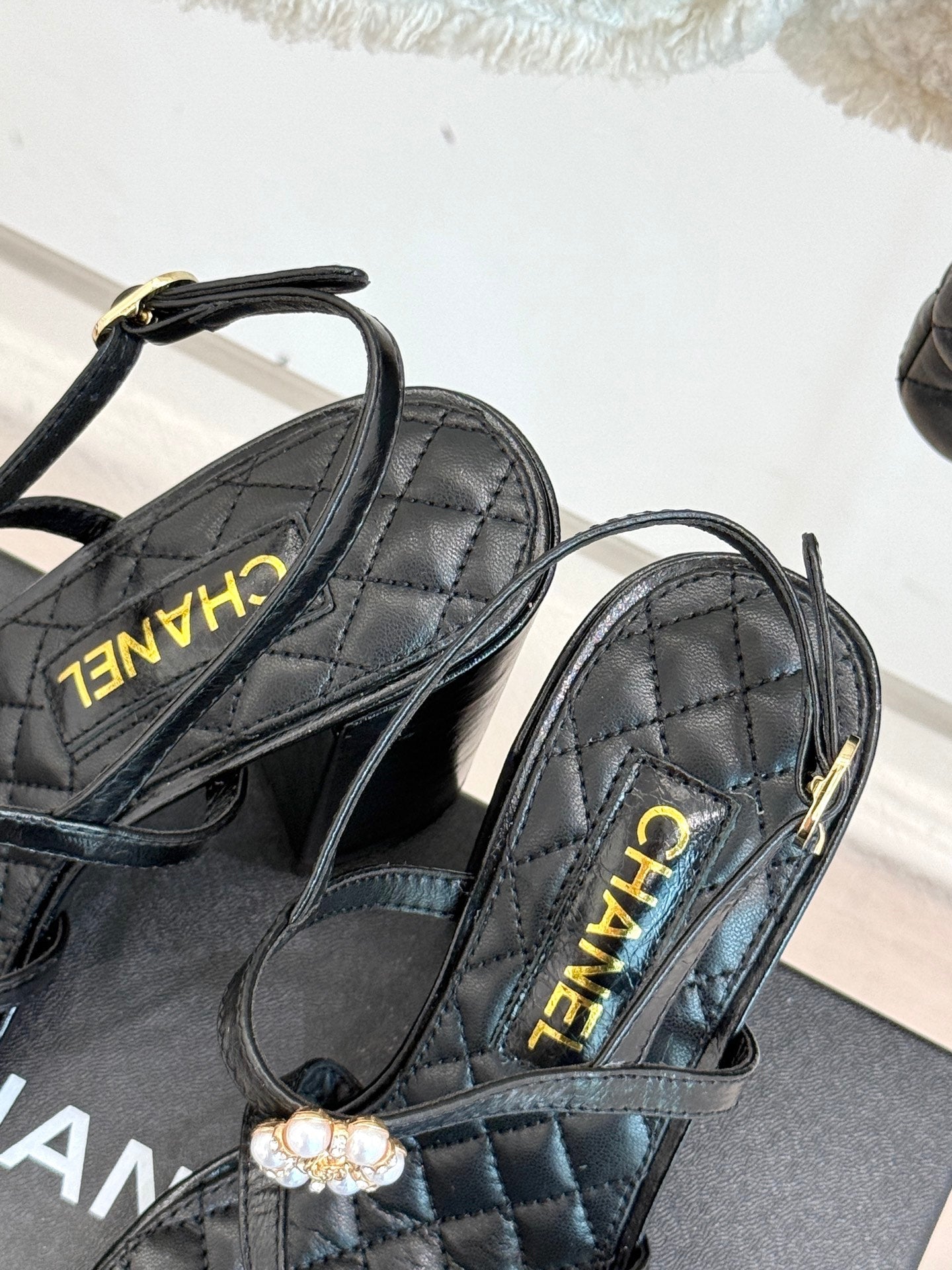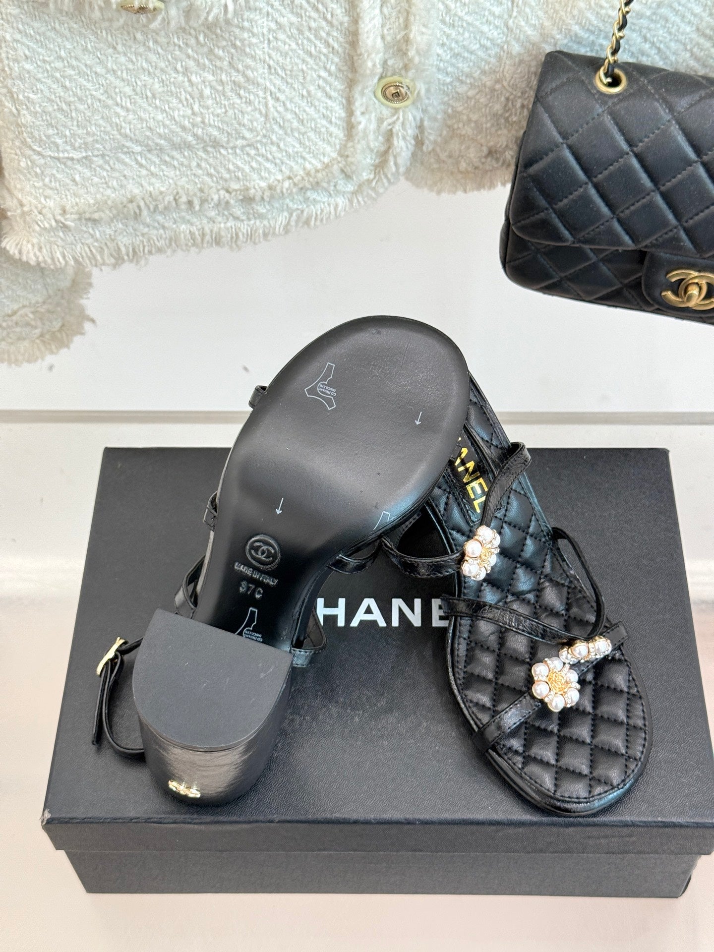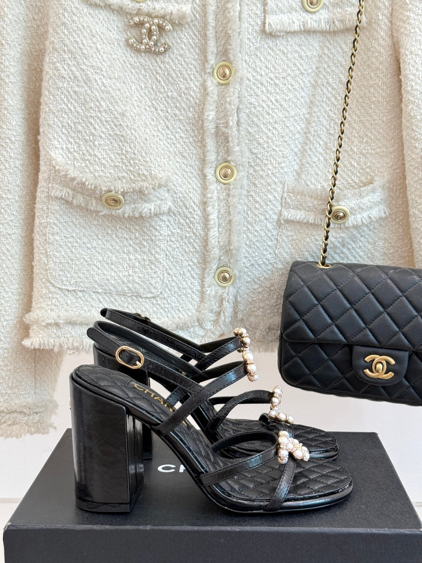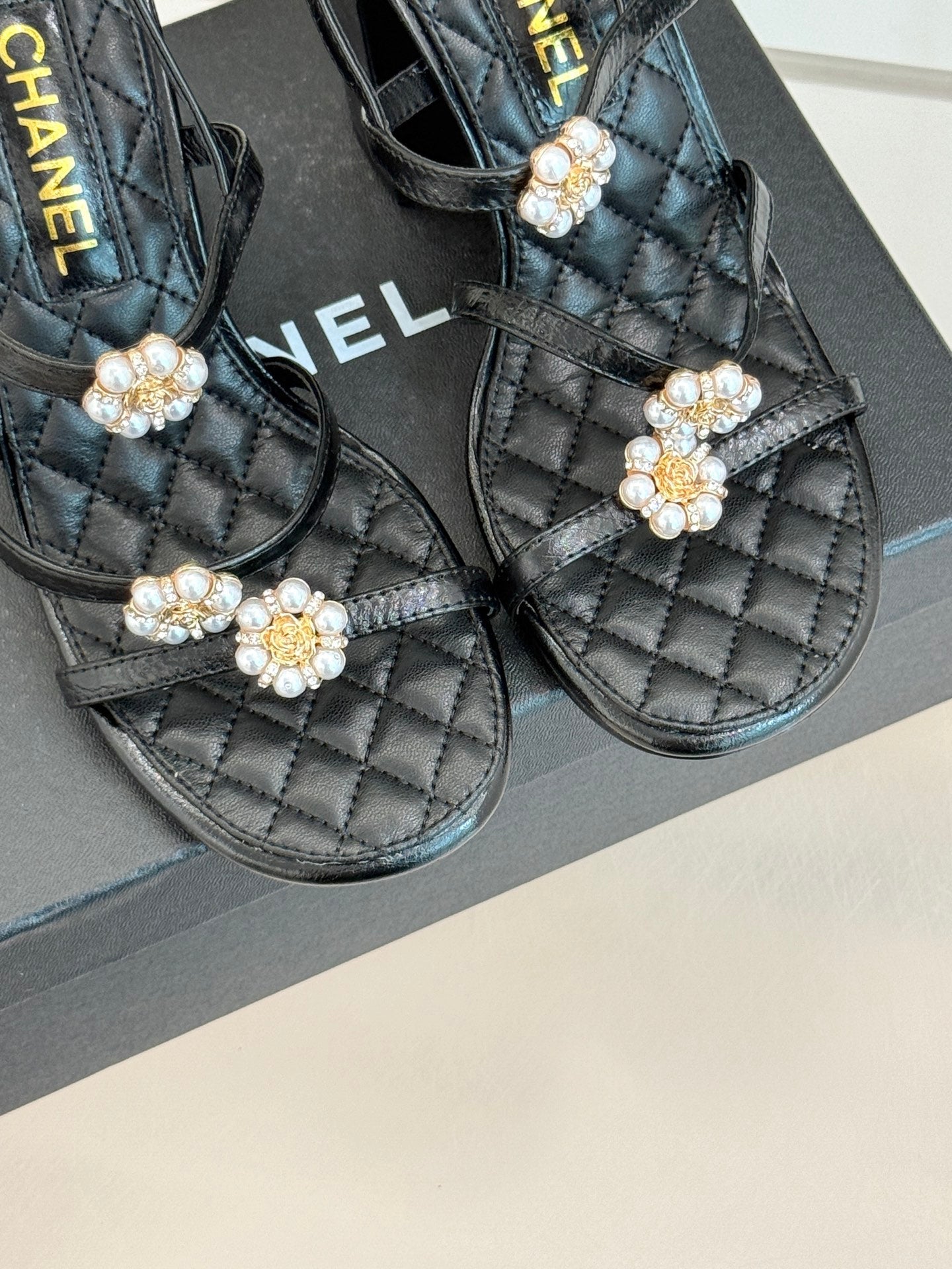 HIGH HEELS SANDAL IN BLACK LAMBSKIN PEARL FLOWERS