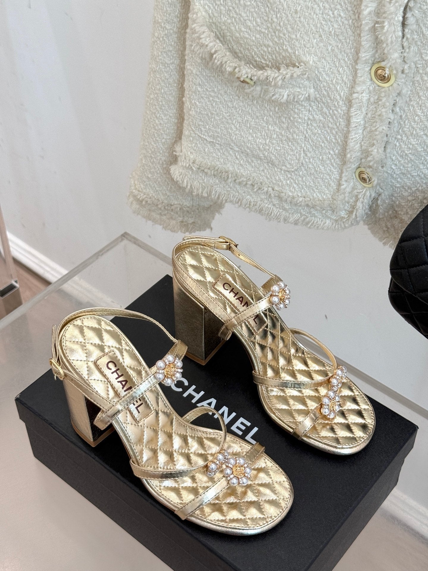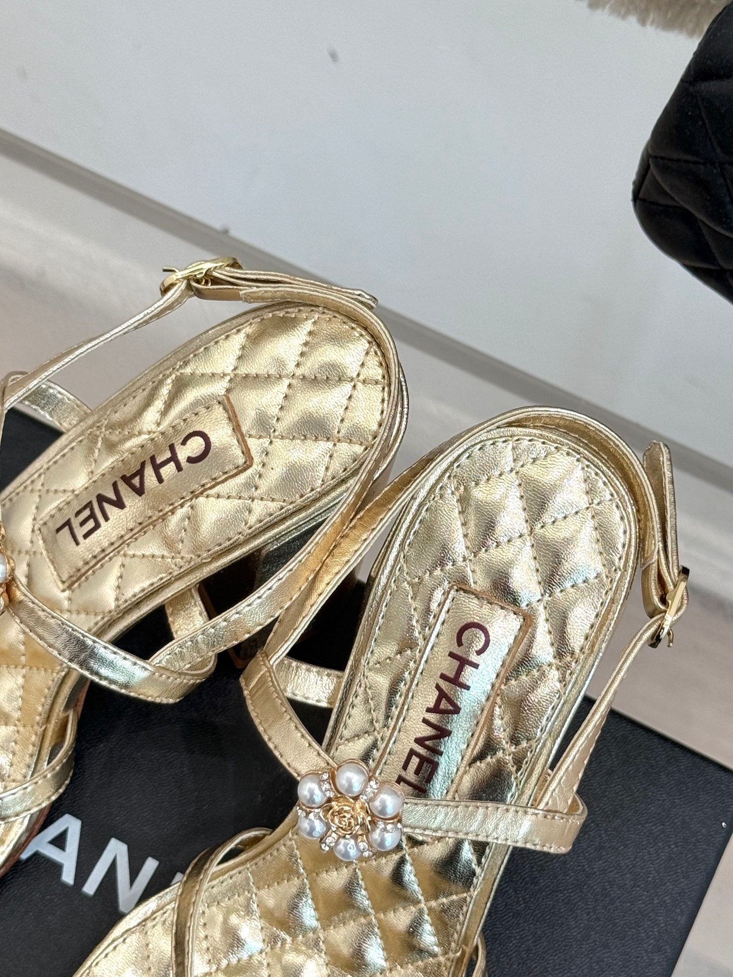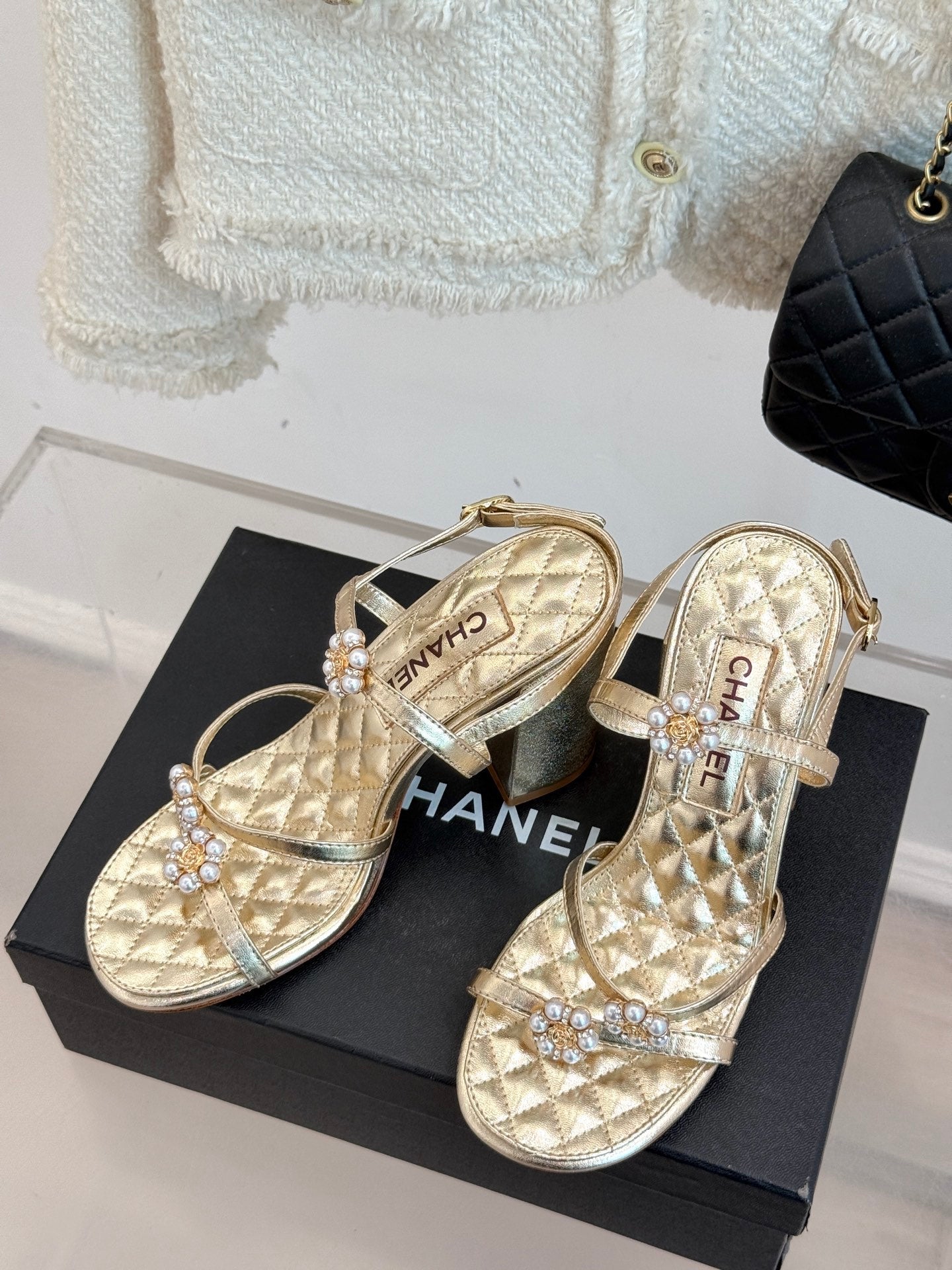 HIGH HEELS SANDAL IN GOLD LAMBSKIN PEARL FLOWERS