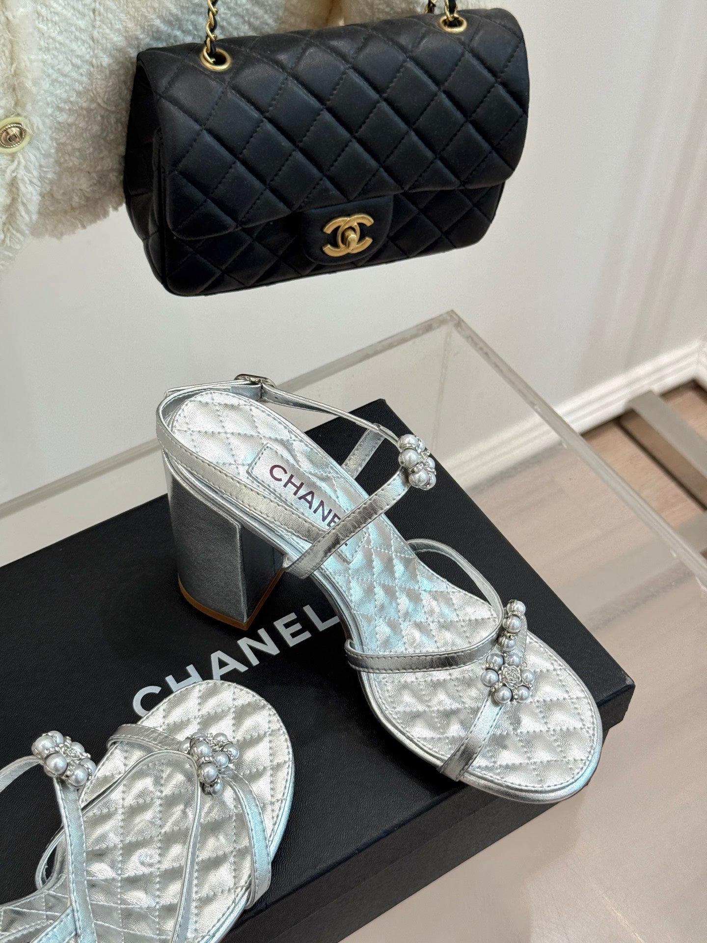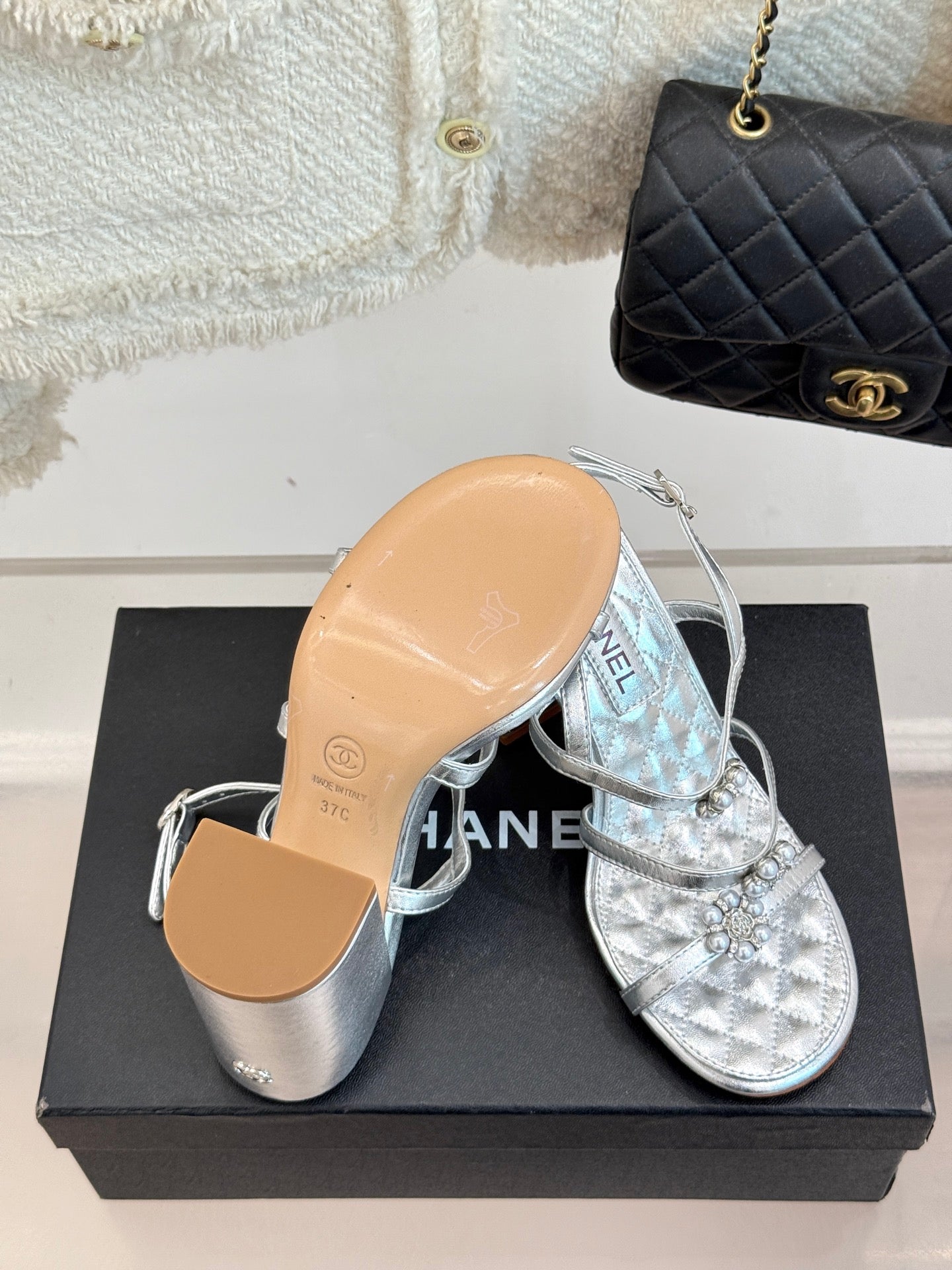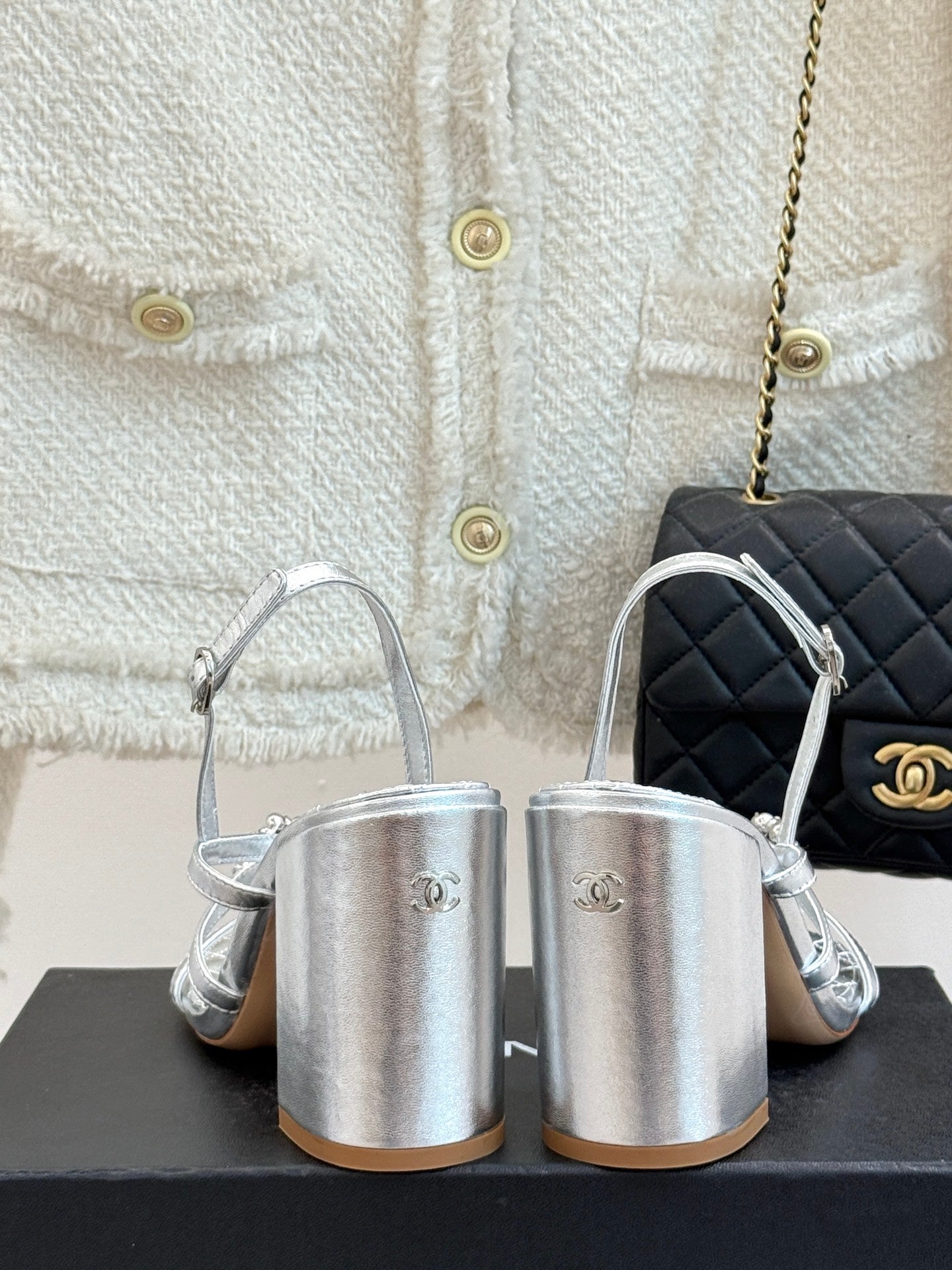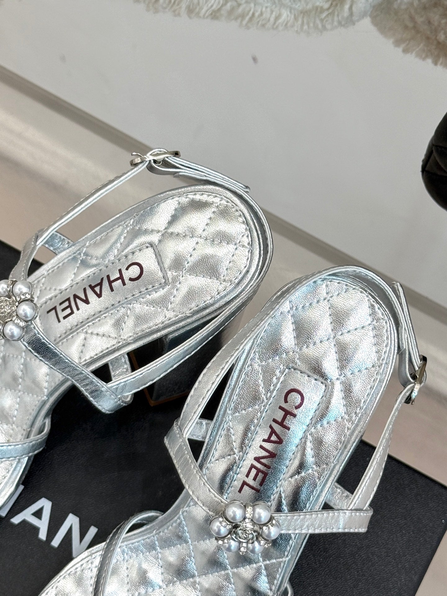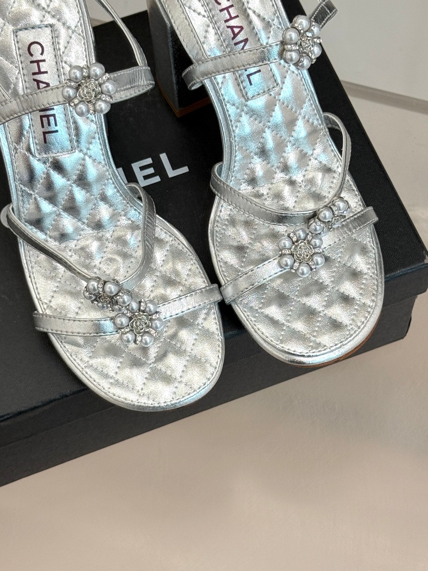 HIGH HEELS SANDAL IN SILVER LAMBSKIN PEARL FLOWERS