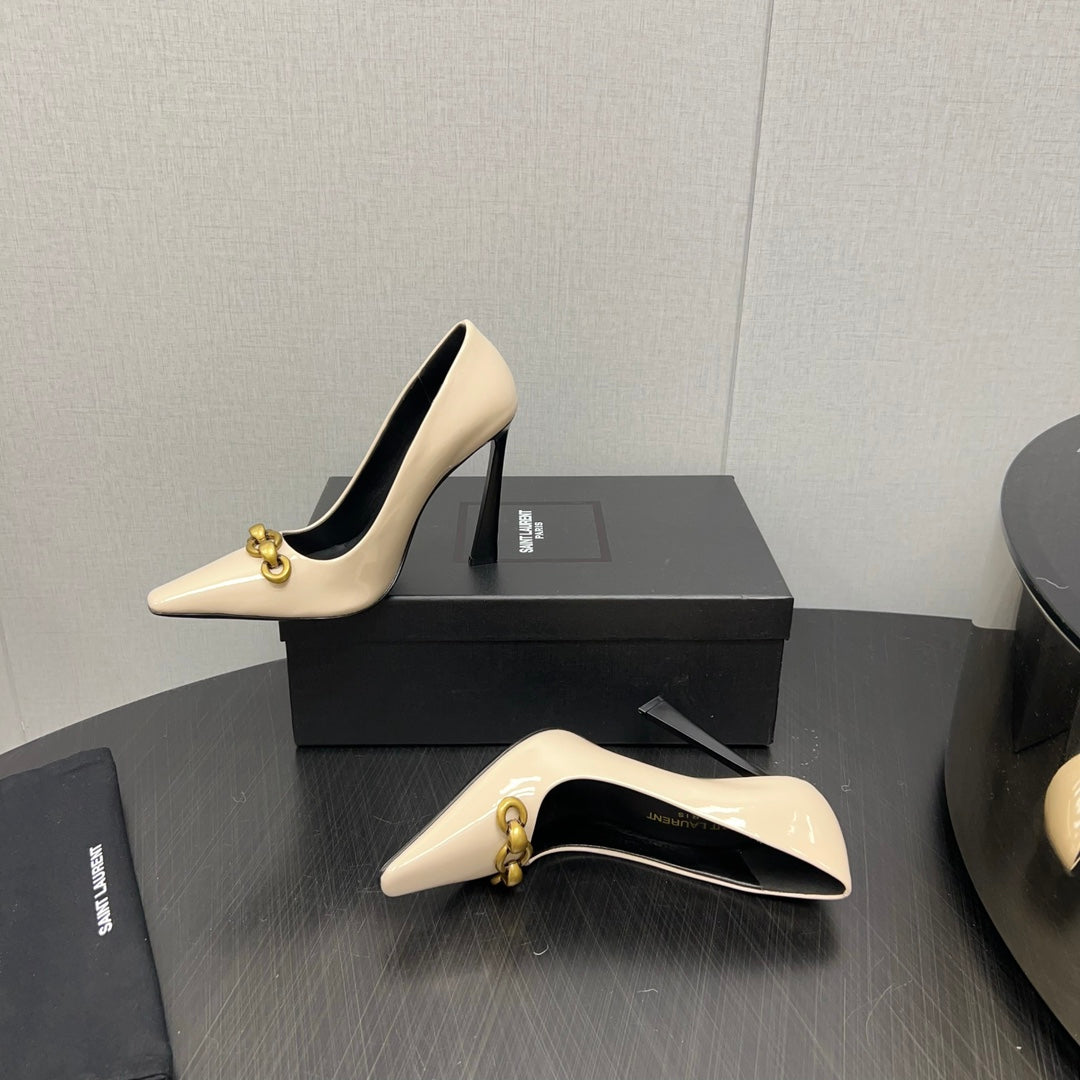 HIGH PUMPS IN CREAM GLOSSY CALFSKIN ATTACHED GOLD CHAIN