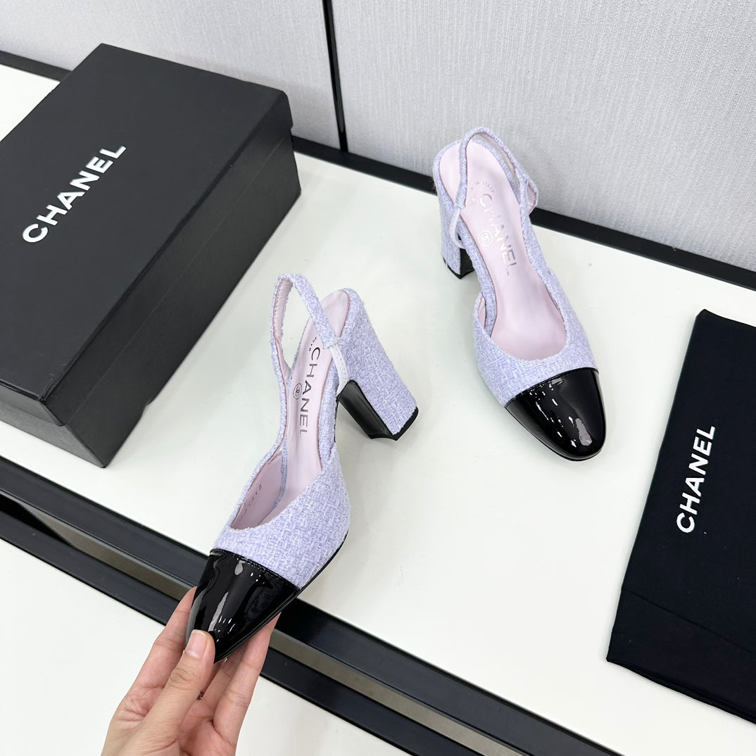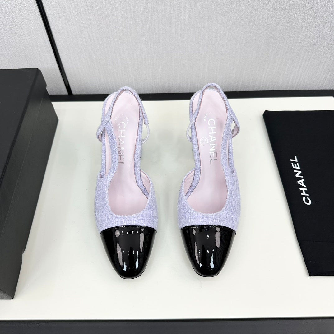 HIGH SLINGBACK LIGHT BLUE TWEED AND BLACK CALFSKIN