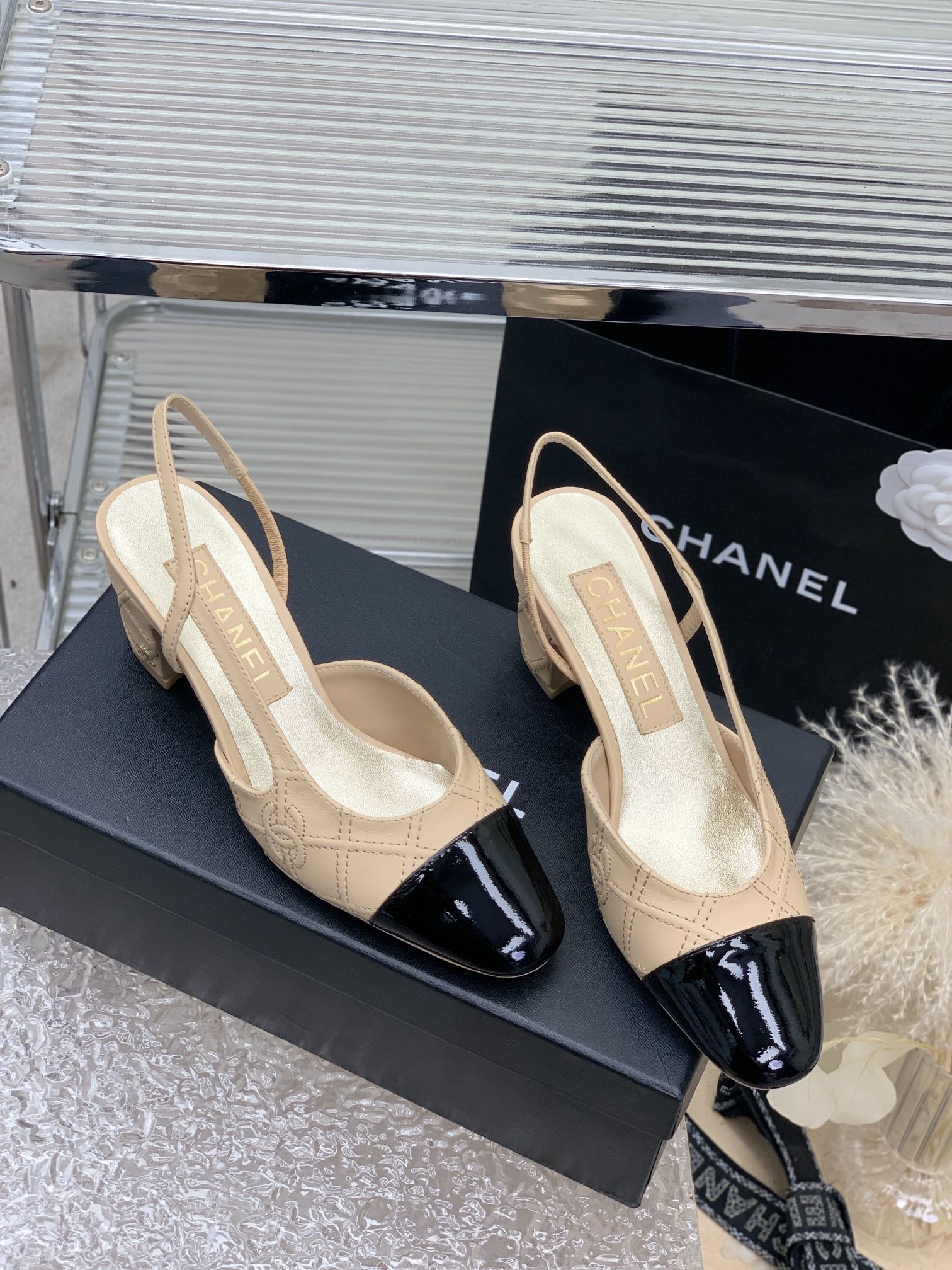 HIGH SLINGBACKS 65 BEIGE CREAM MIX BLACK CALFSKIN