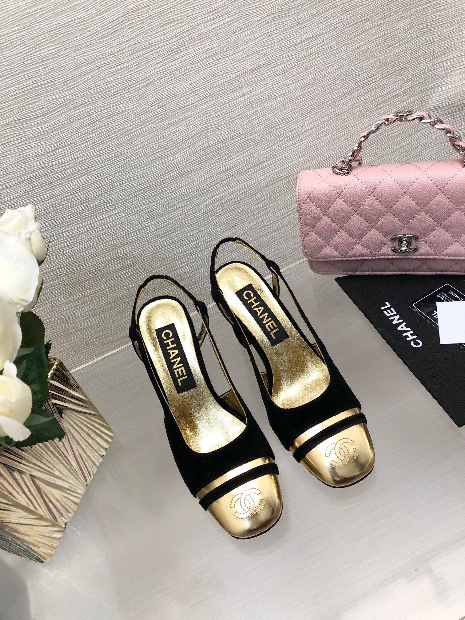 HIGH SLINGBACKS IN BLACK SUEDE AND GOLDEN LAMBSKIN