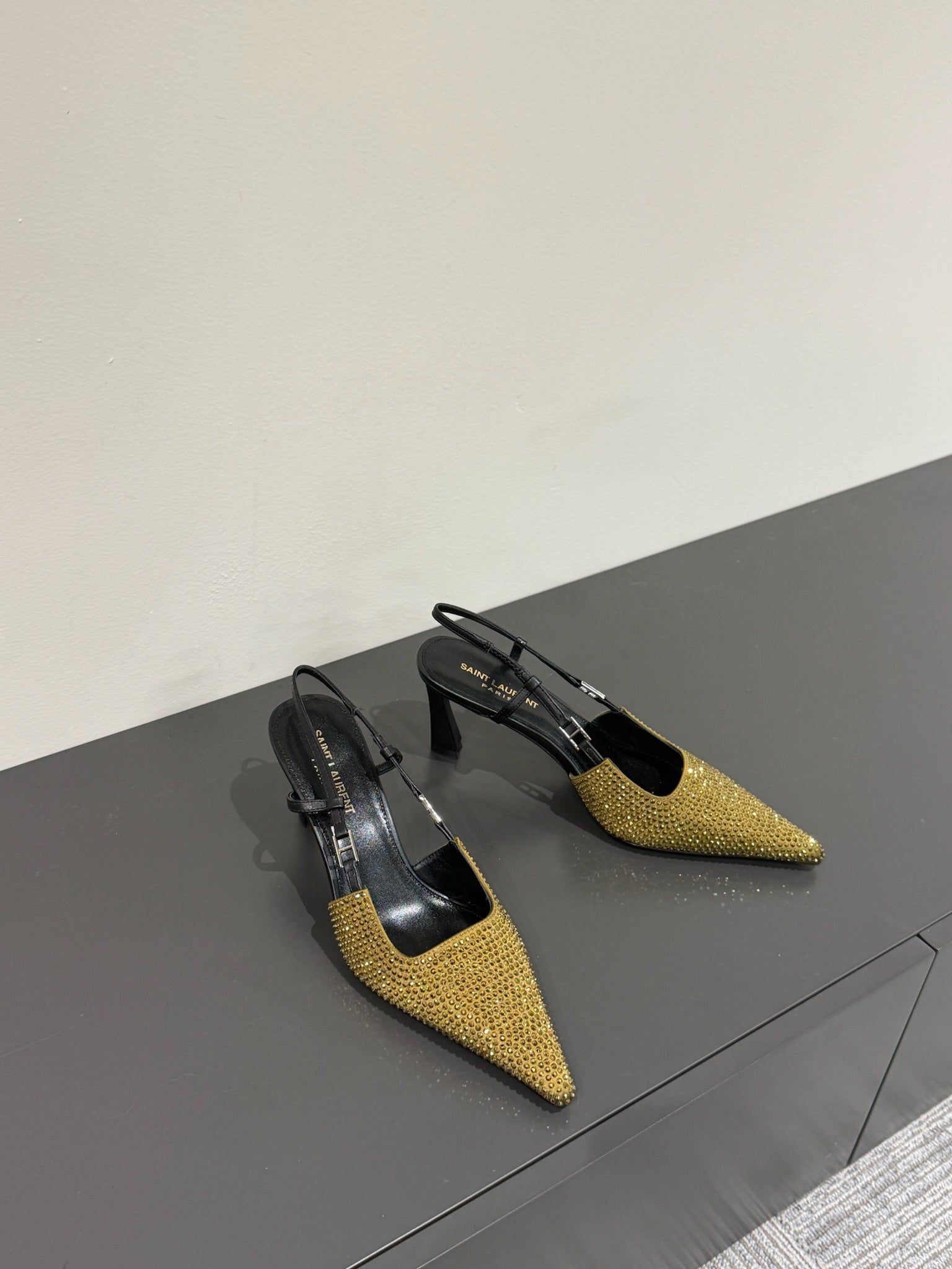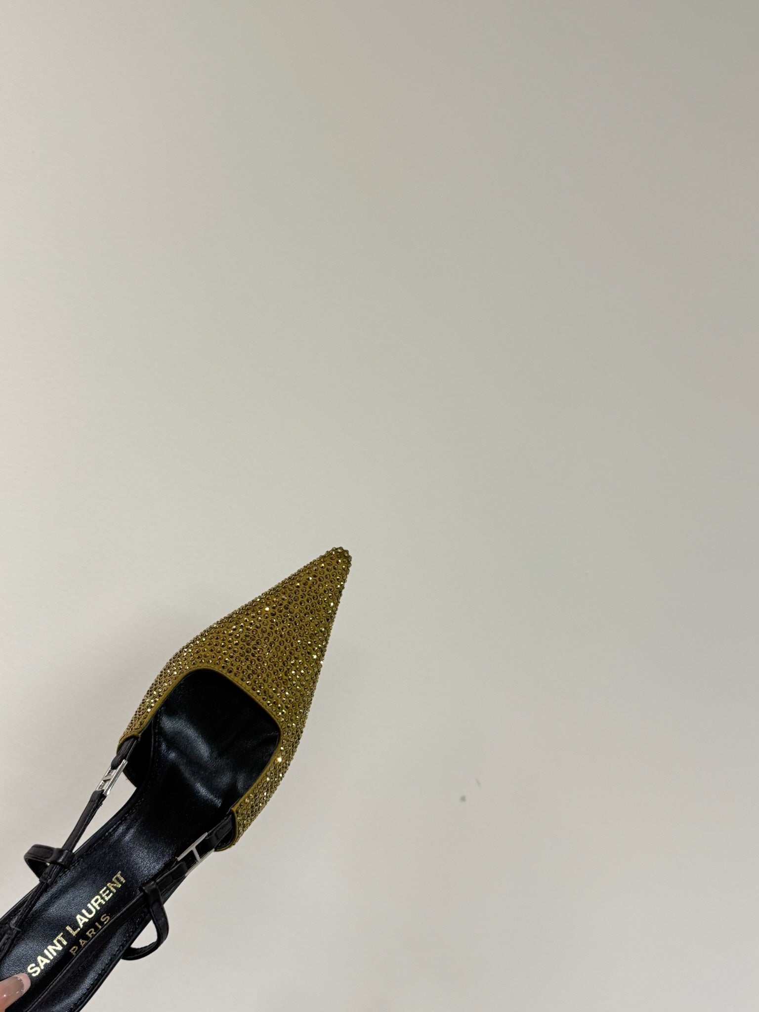 HIGH SLINGBACKS POINTED-TOE IN METALLIC GOLD LAMBSKIN WITH CRYSTALS