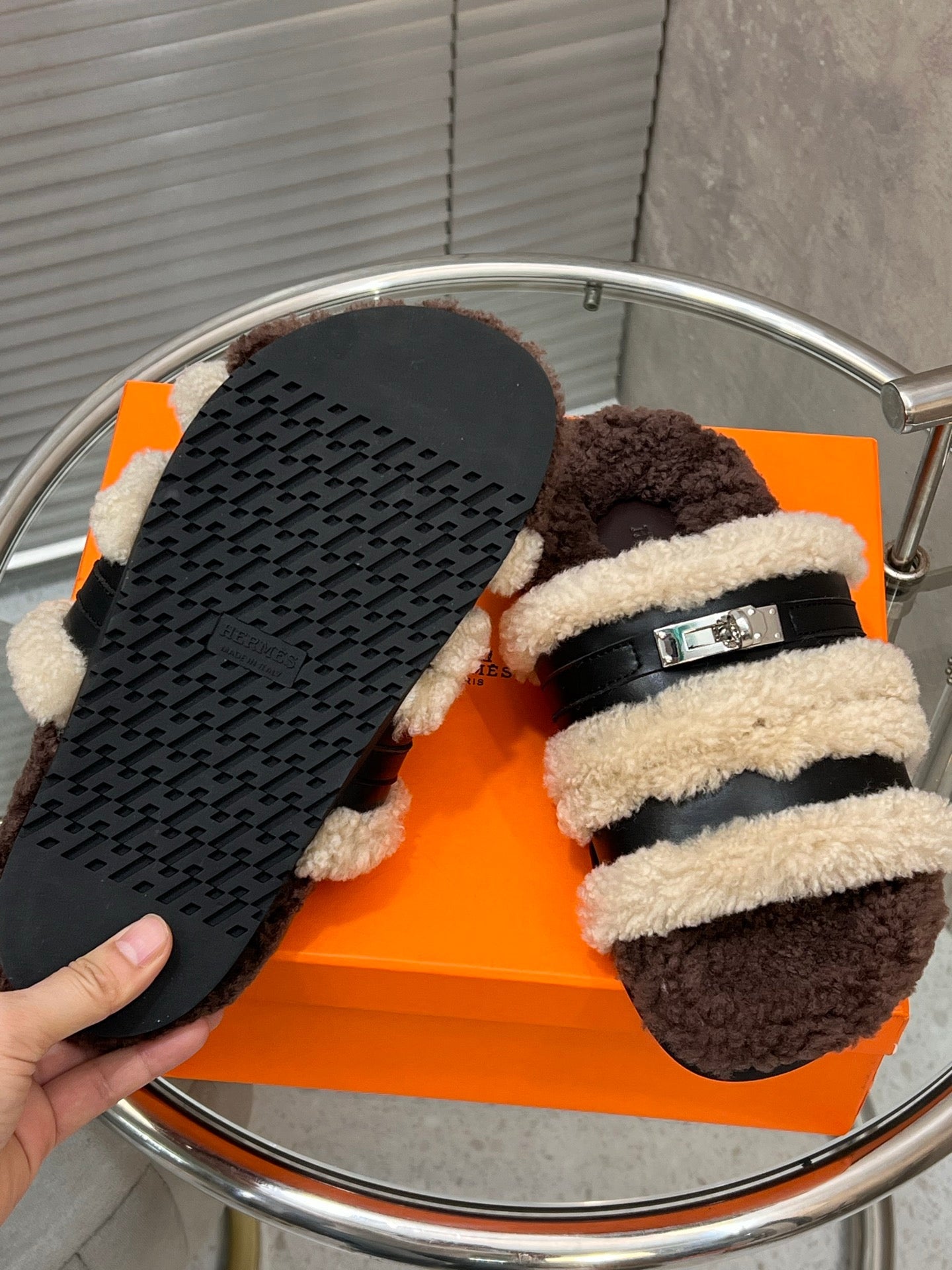 HM 25S SANDAL IN BEIGE WOOL AND BLACK LAMBSKIN WITH SILVER HARDWARE