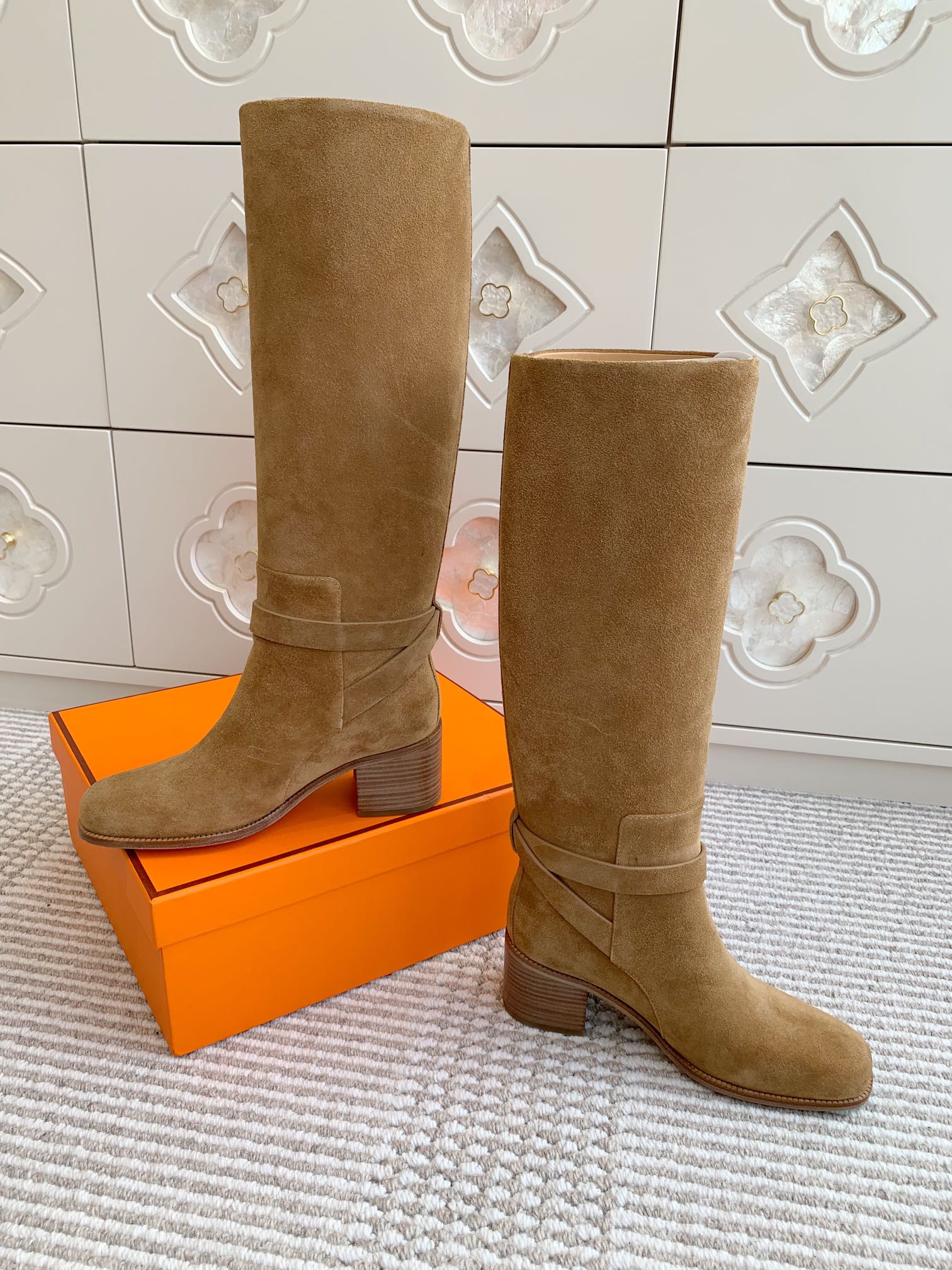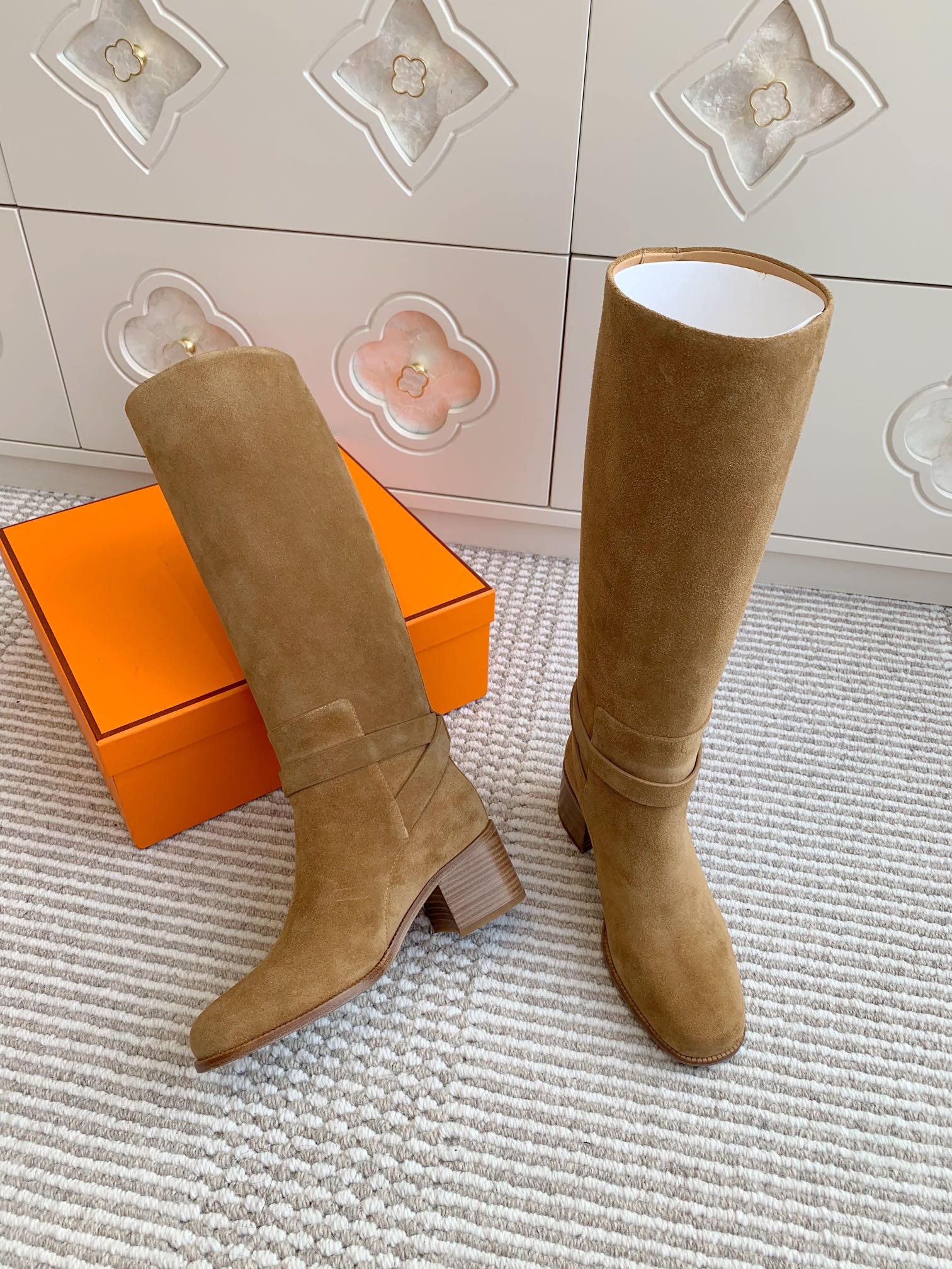 HM 25S TALL BOOTS 50 MM IN BROWN SUEDE WITH GOLD HARDWARE
