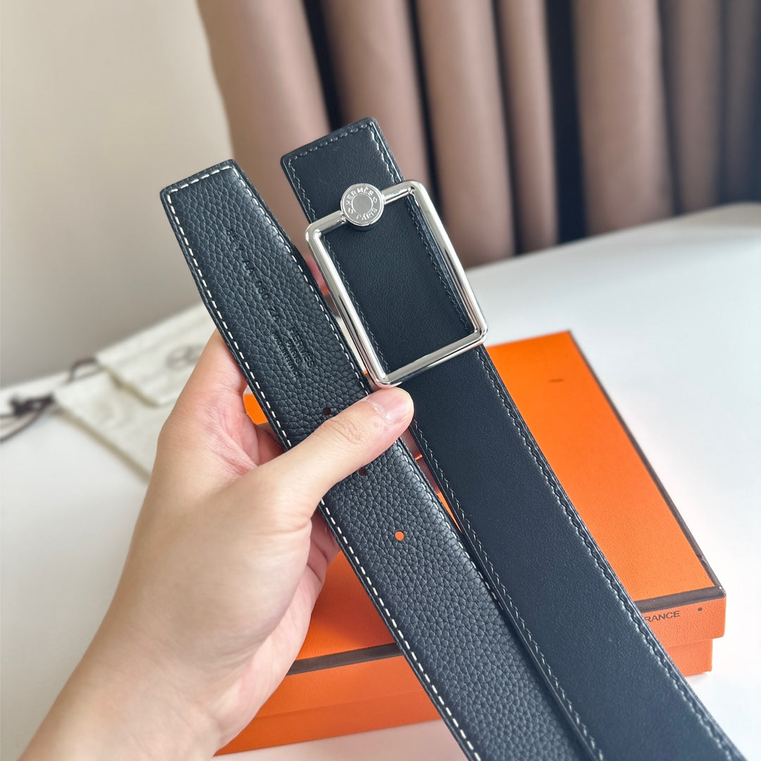 HM OSCAR BELT BUCKLE & REVERSIBLE BLACK LEATHER STRAP 38MM SILVER HARDWARE