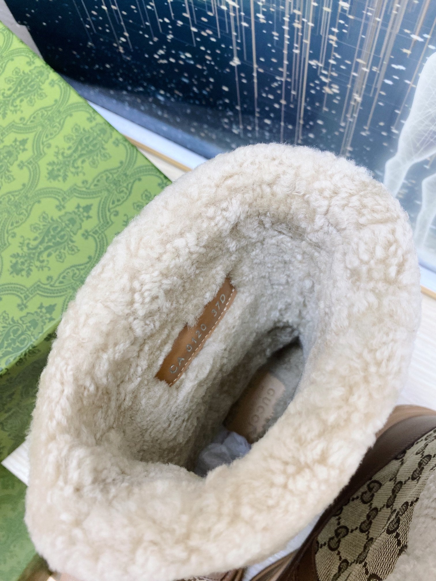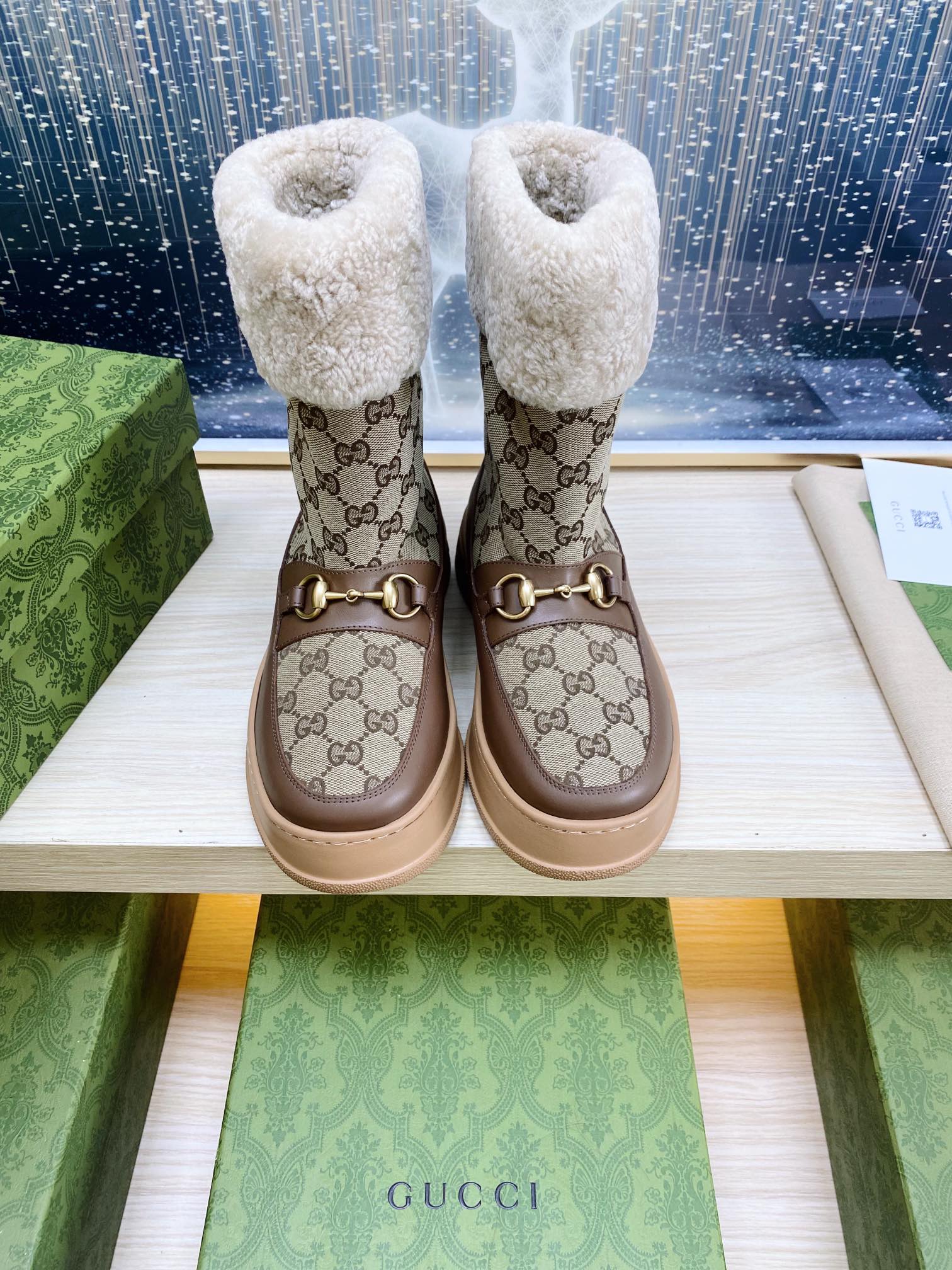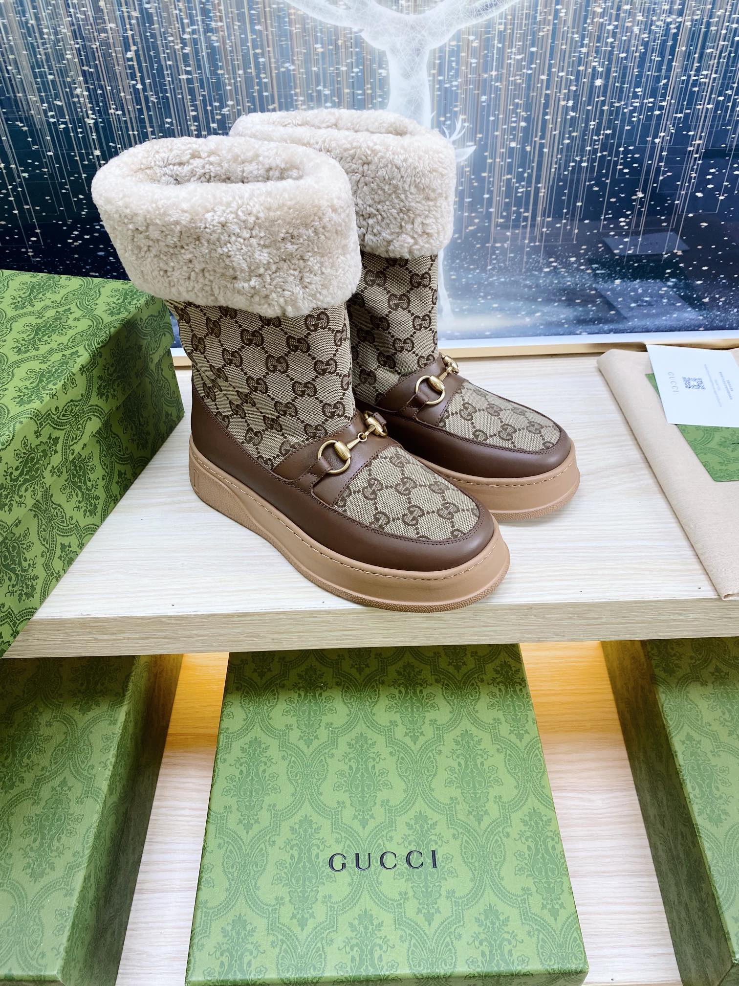 HORSEBIT ANKLE BOOTS WITH MERINO TRIM IN BEIGE JACQUARD FABRIC MIX BROWN CALFSKIN