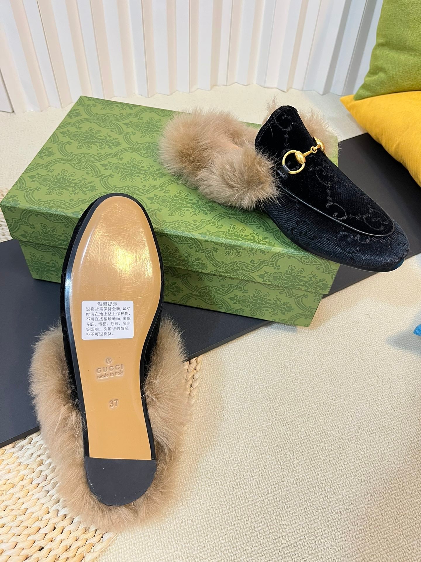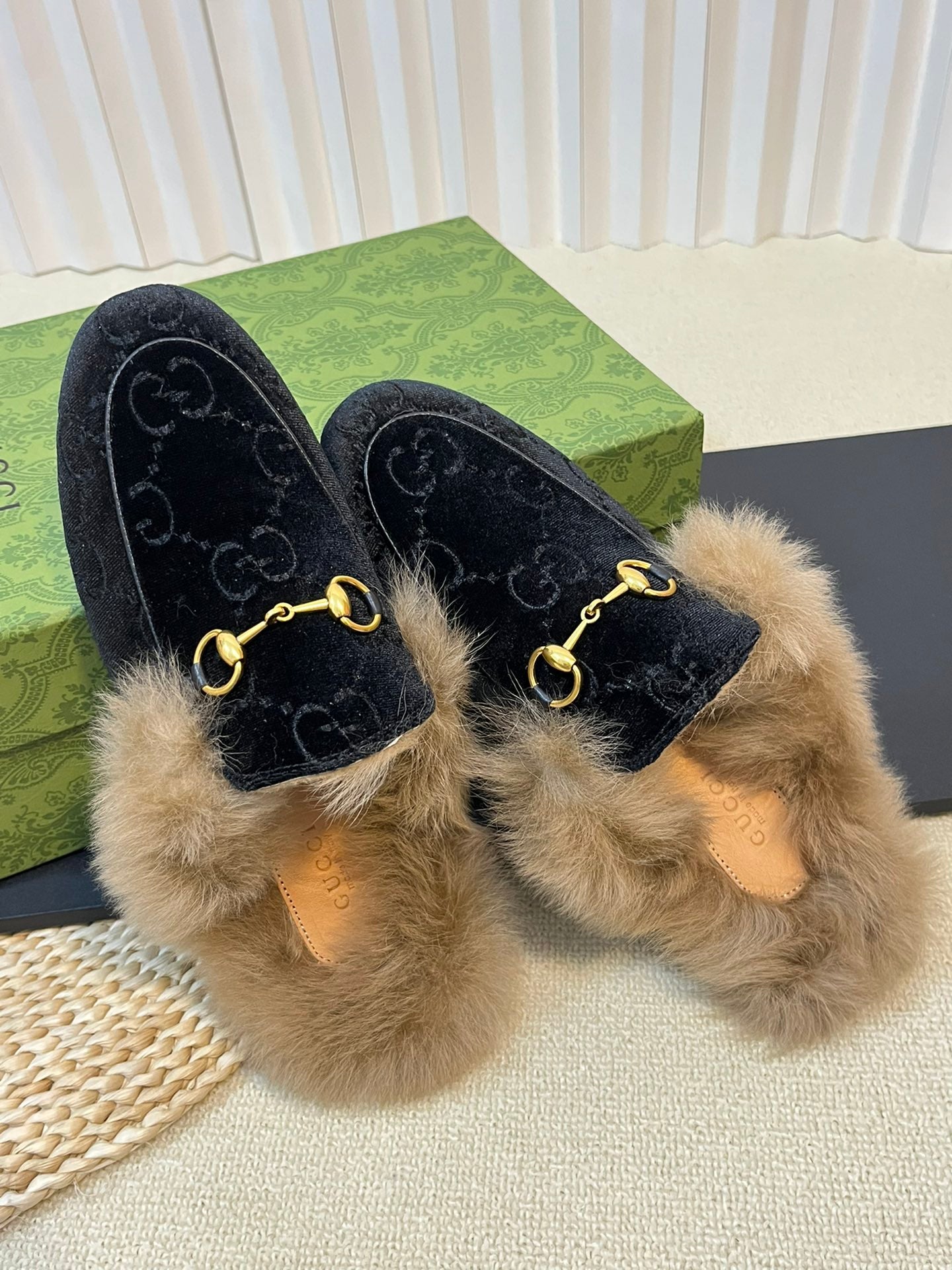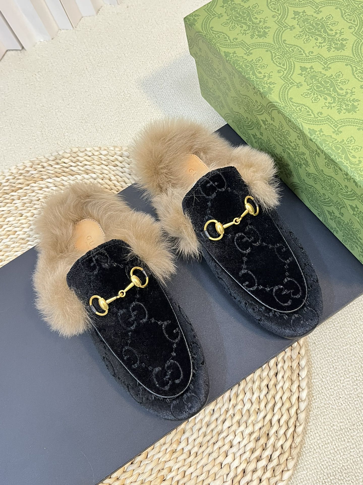 HORSEBIT MULE IN BLACK MONOGRAM VELVET AND LAMB WOOL LINING