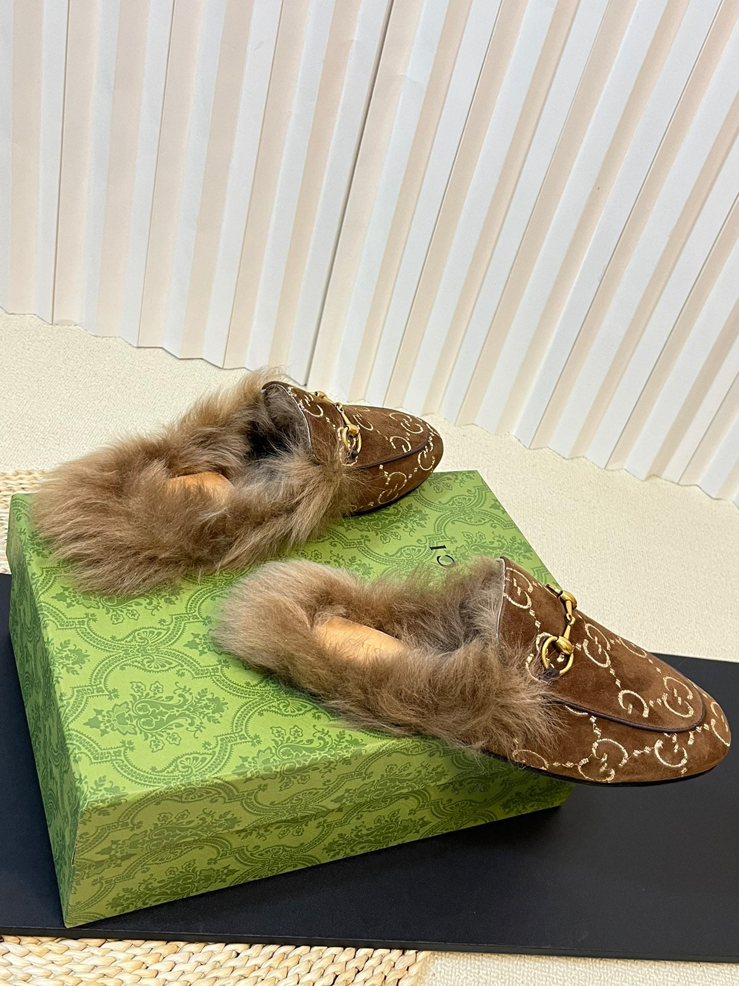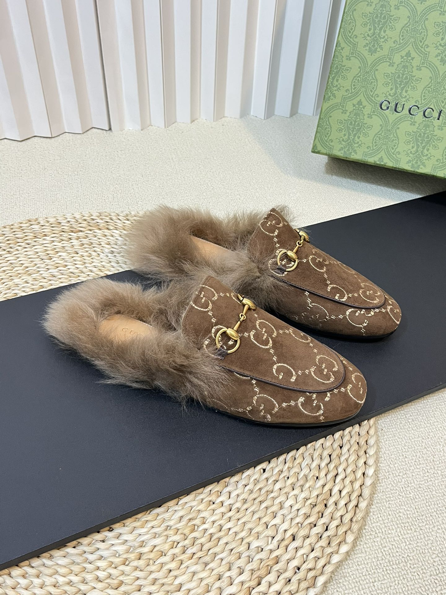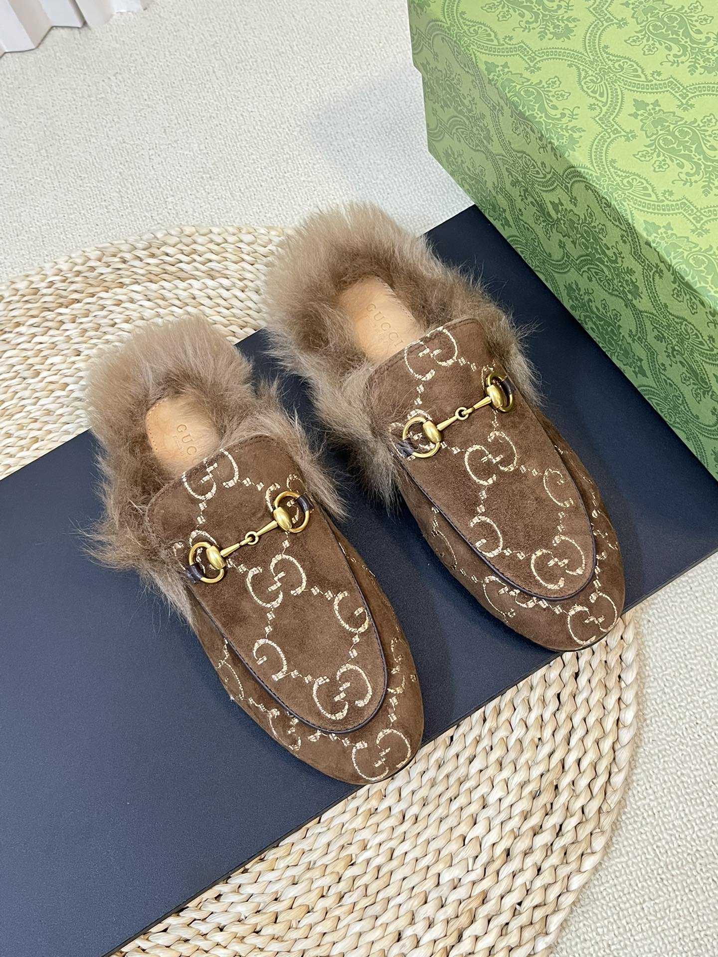 HORSEBIT MULE IN COCOA BROWN MONOGRAM VELVET AND LAMB WOOL LINING