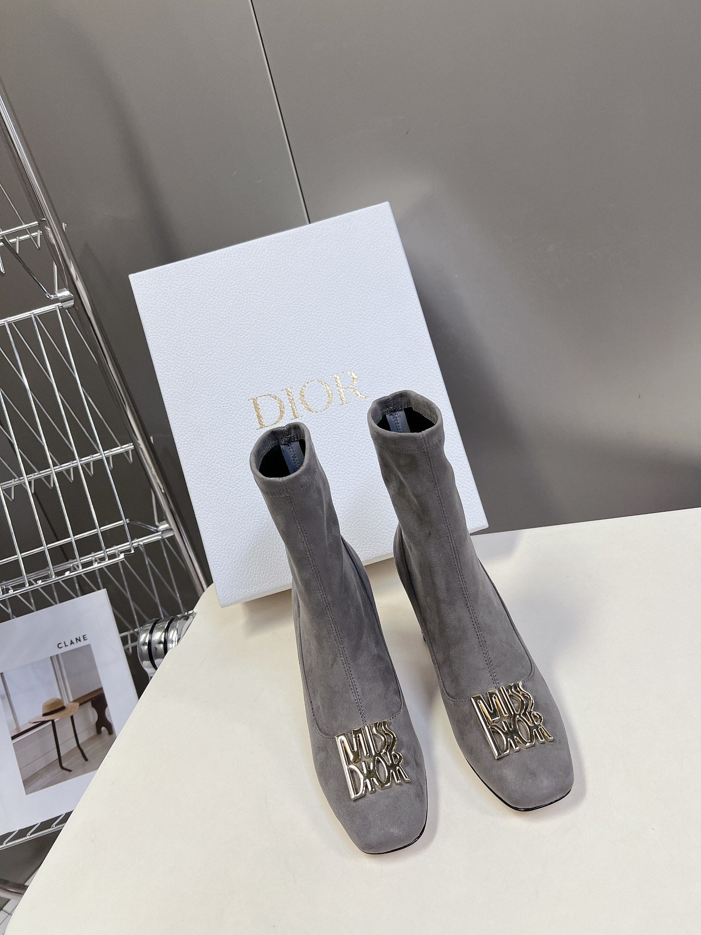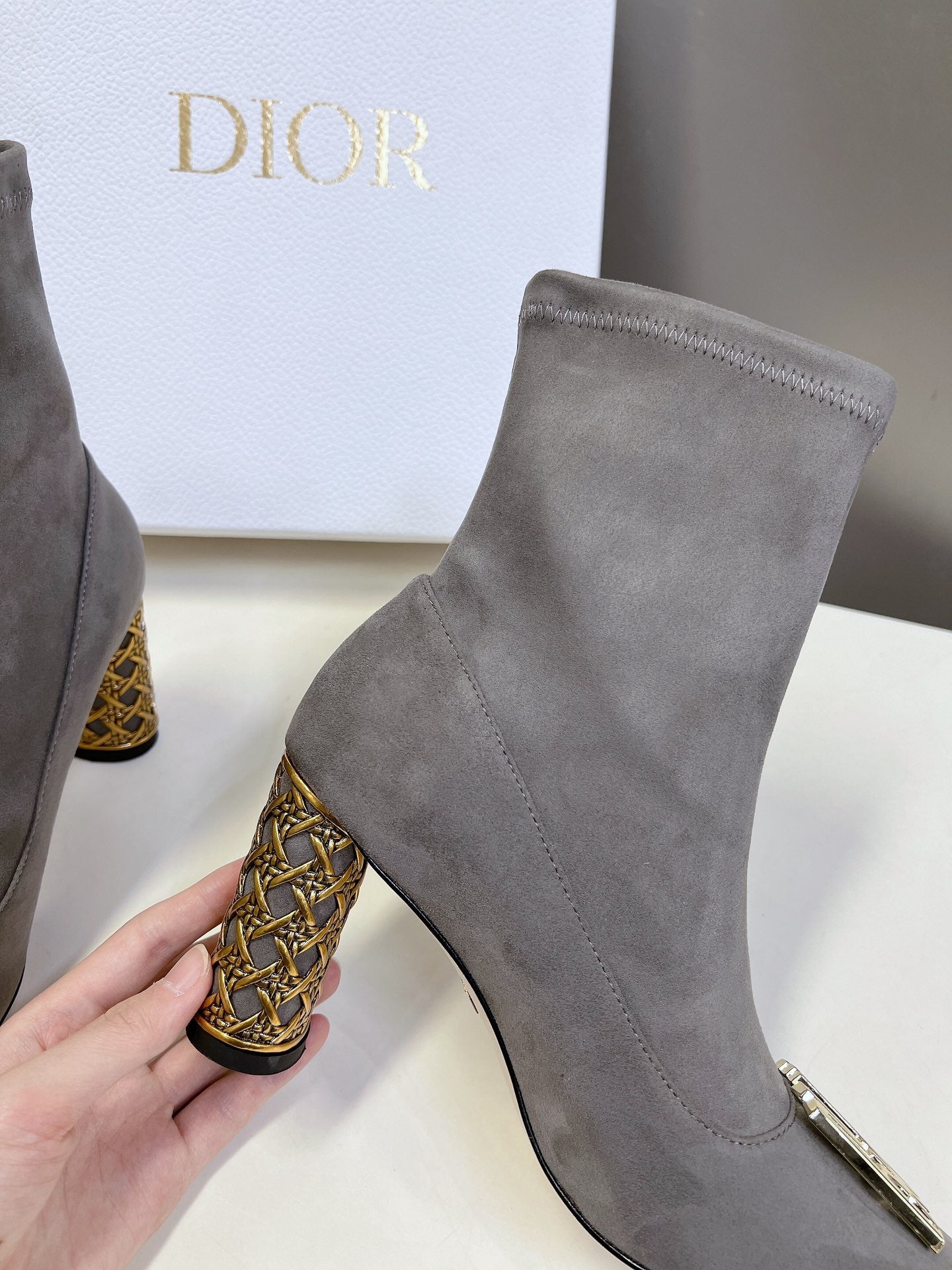 ICON HEELED ANKLE BOOT DOVE GRAY SUEDE 8 CM WITH GOLD LOGO