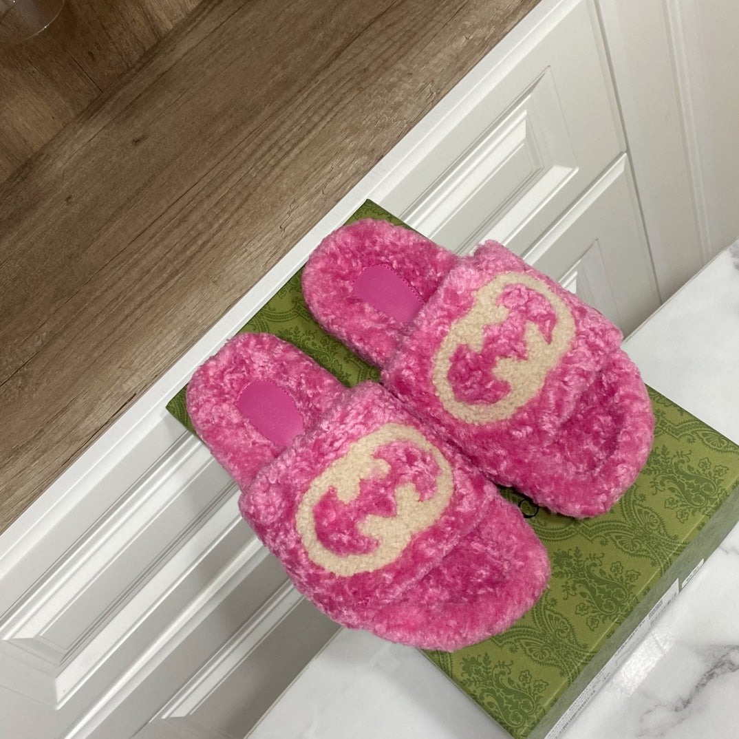 INTERLOCKING G SLIDE SANDAL IN PINK LAMB WOOL