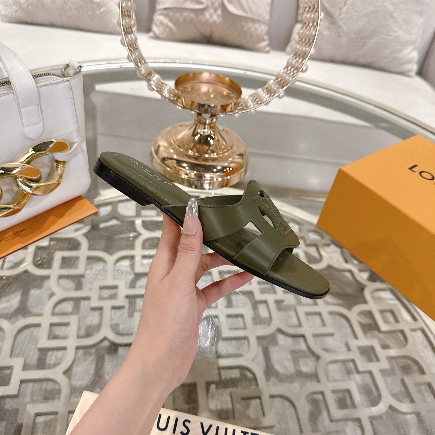 ISOLA FLAT SLIDE IN ARMY GREEN CALFSKIN