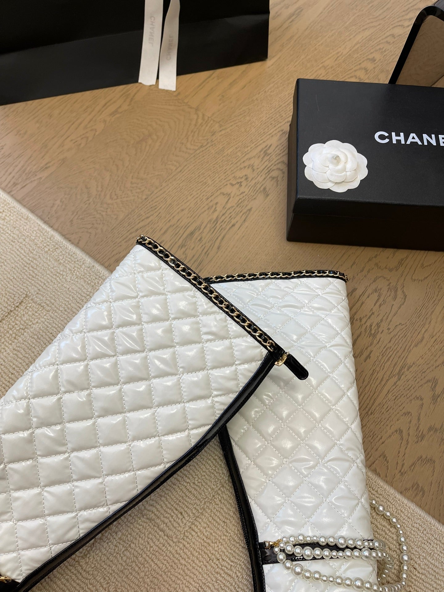 KNEE HIGH BOOTS 8 CM IN WHITE MIX BLACK CALFSKIN WITH PEARL CHAIN