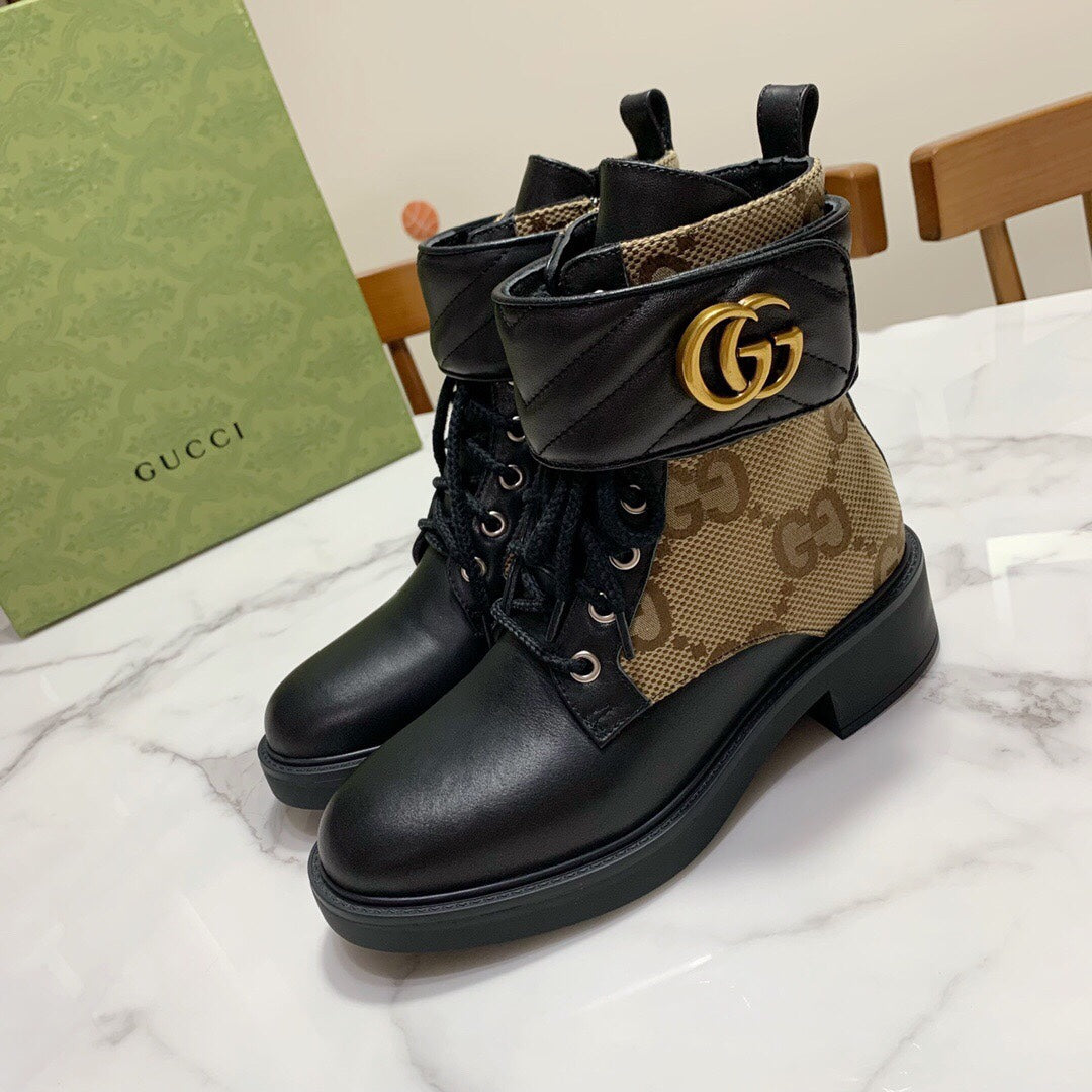 LACE-UP ANKLE BOOTS WITH DOUBLE G BUCKLE IN BEIGE CANVAS AND BLACK SHEEPSKIN