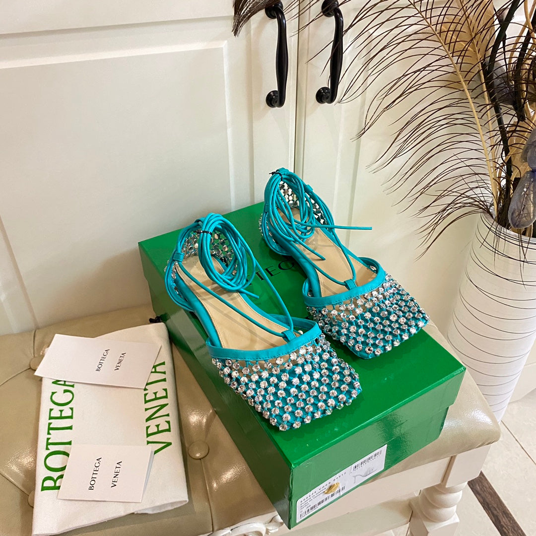 LACE-UP FLAT SANDAL IN CERULEAN BLUE METALLIZED MESH AND LEATHER WITH RHINSTONES