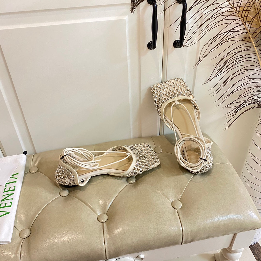 LACE-UP FLAT SANDAL IN WHITE CREAM METALLIZED MESH AND LEATHER WITH RHINSTONES