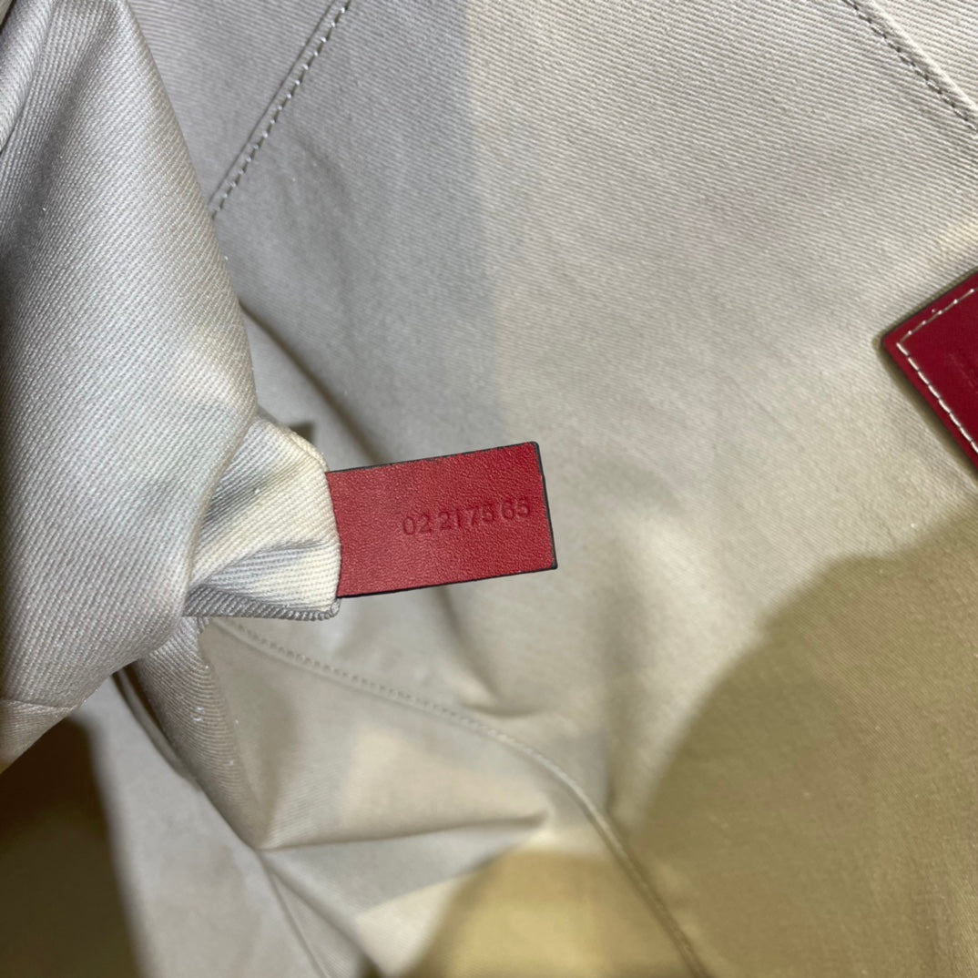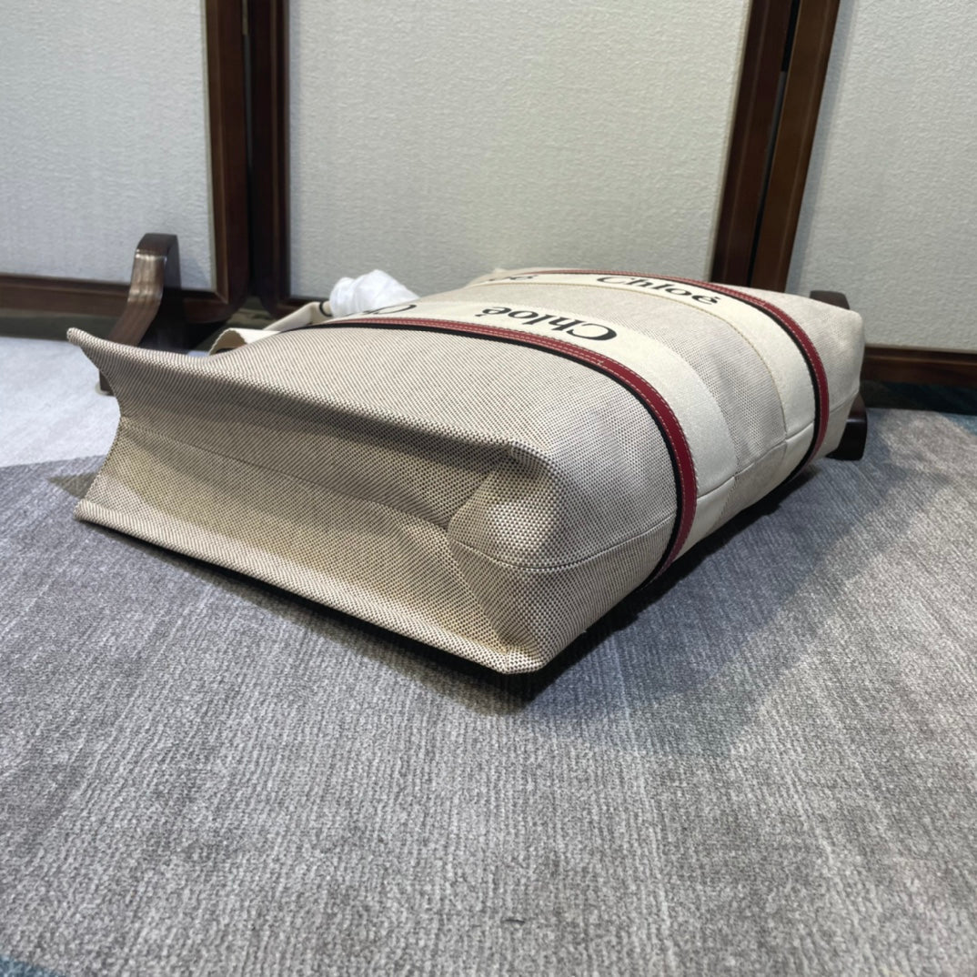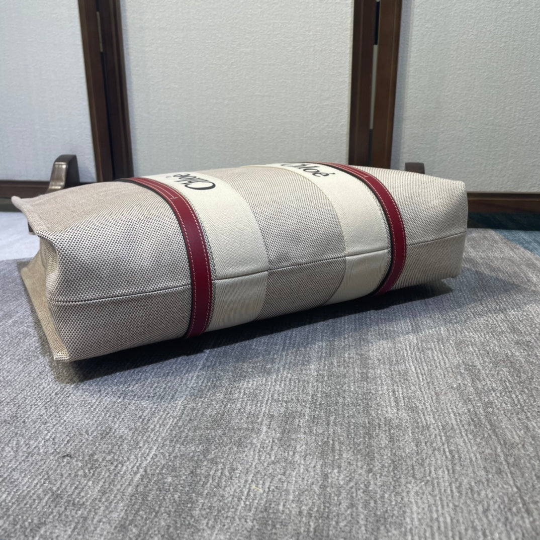 LAGRE WOODY TOTE BAG 45 IN BEIGE LINEN CANVAS BLACK WEBBING LOGO EMBROIDER RED CALFSKIN