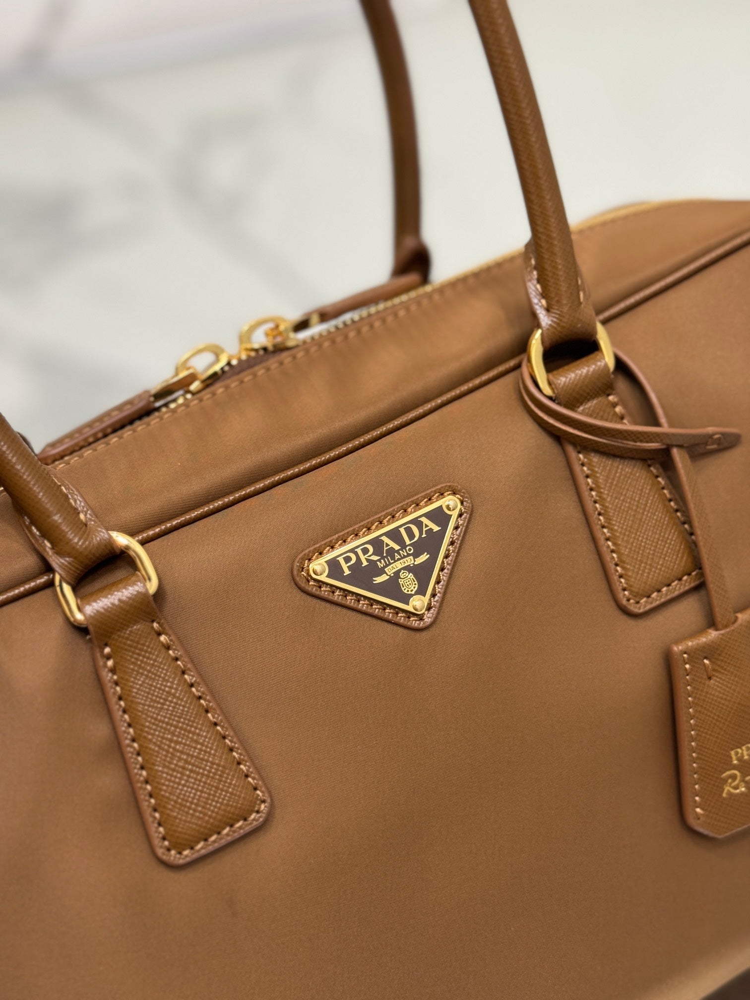 LARGE TOP HANDLE BAG 35 IN CHERRY WOOD NYLON AND CALFSKIN TRIM