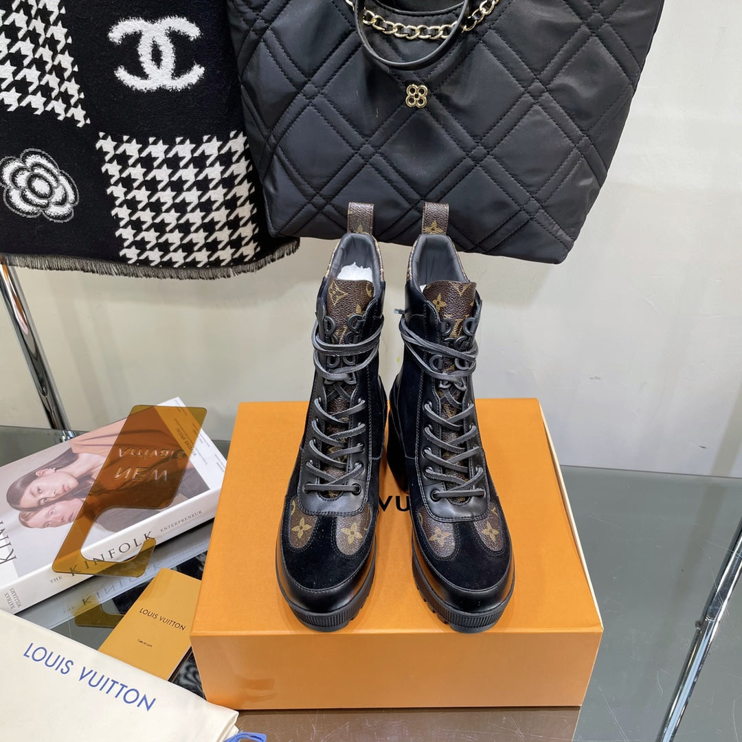 LAUREATE PLATFORM BOOTS IN BLACK SUEDE AND CHOCOLATE BROWN CALFSKIN
