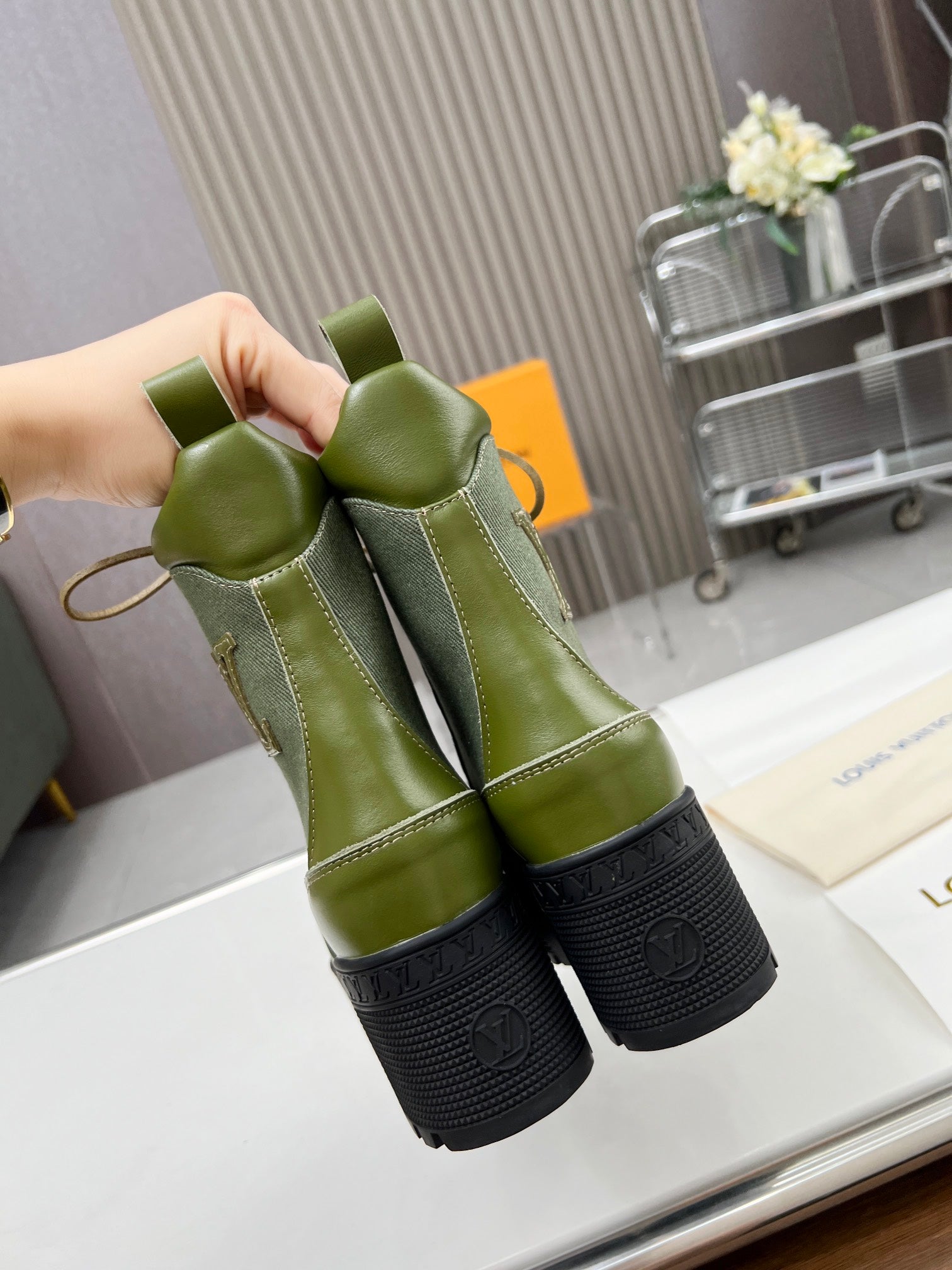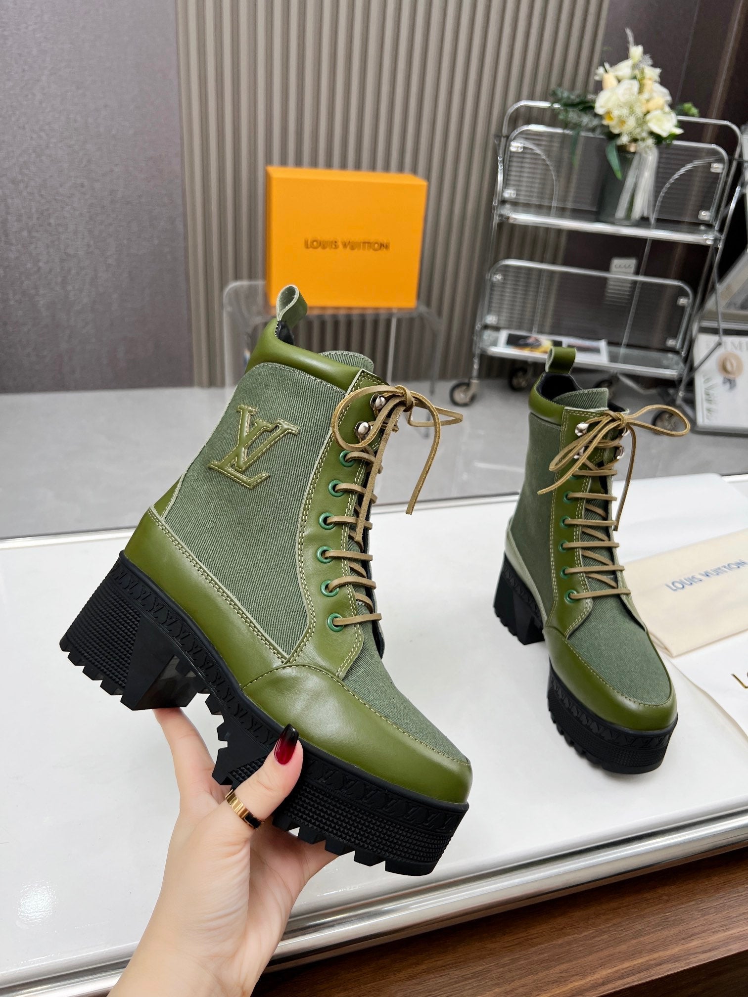 LAUREATE PLATFORM DESERT BOOT IN DARK OLIVE GREEN JACQUARD AND CALFSKIN