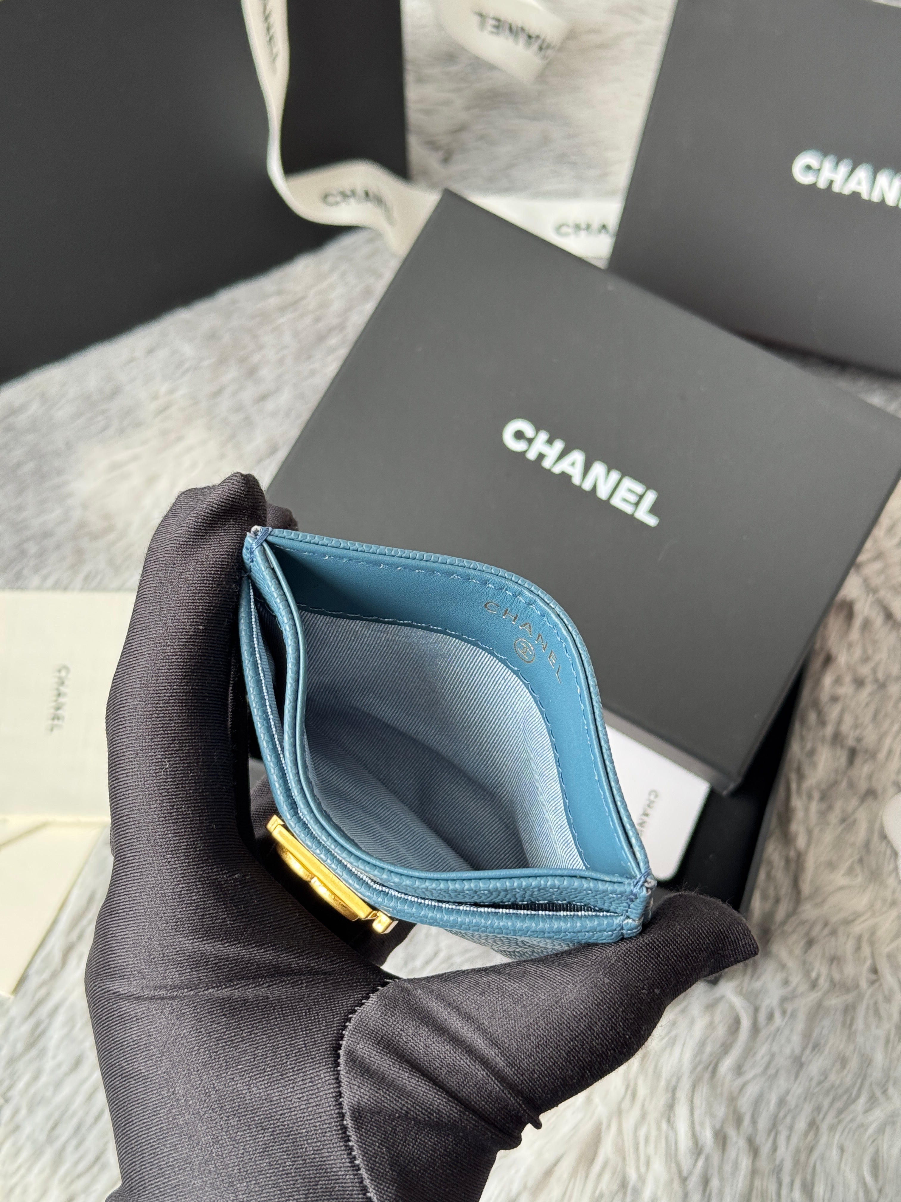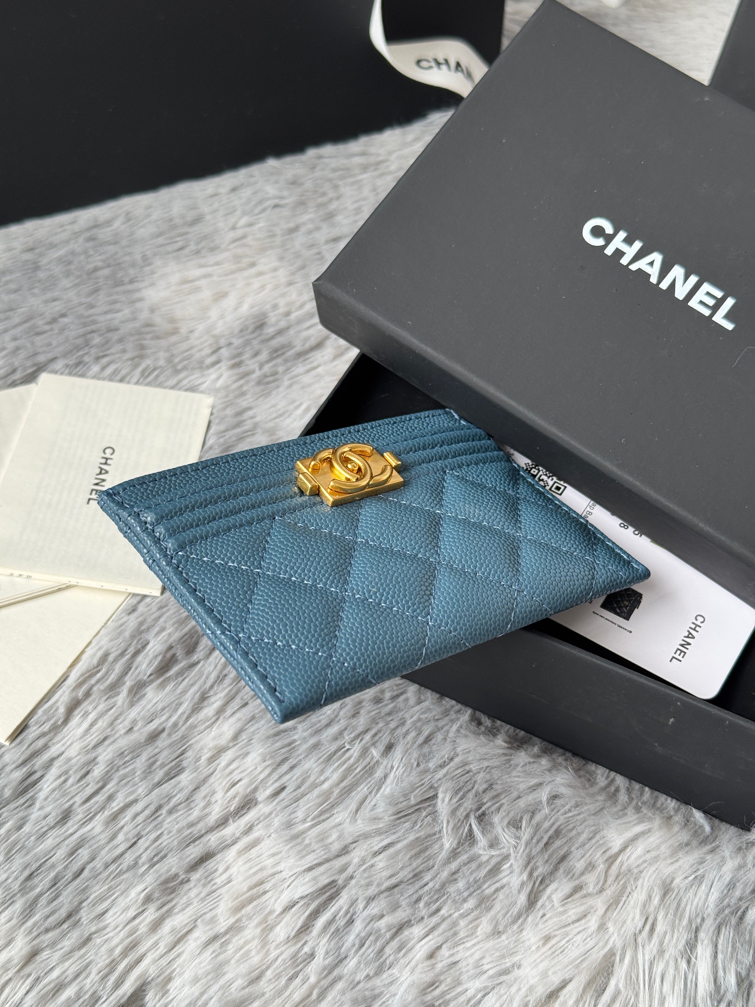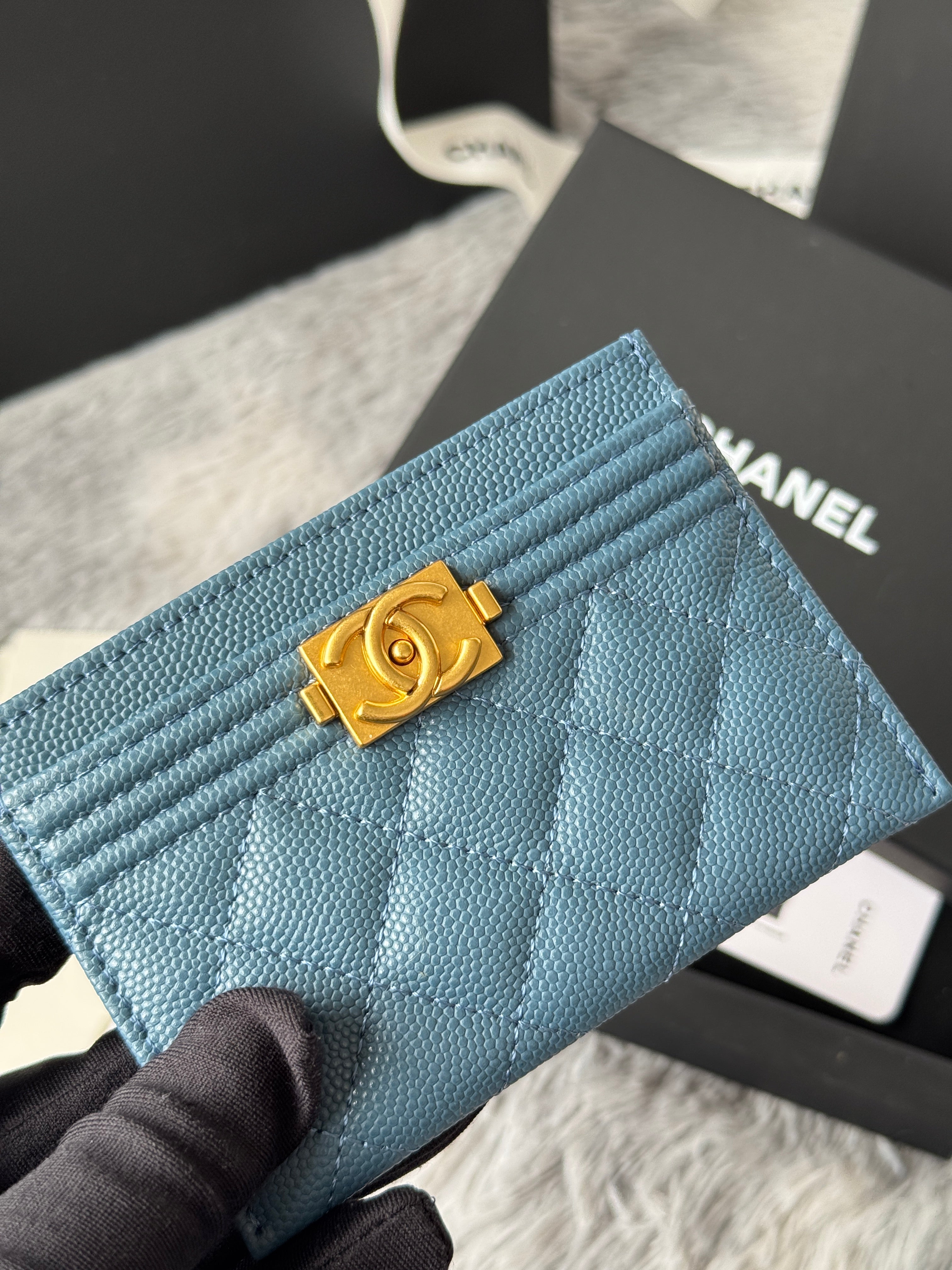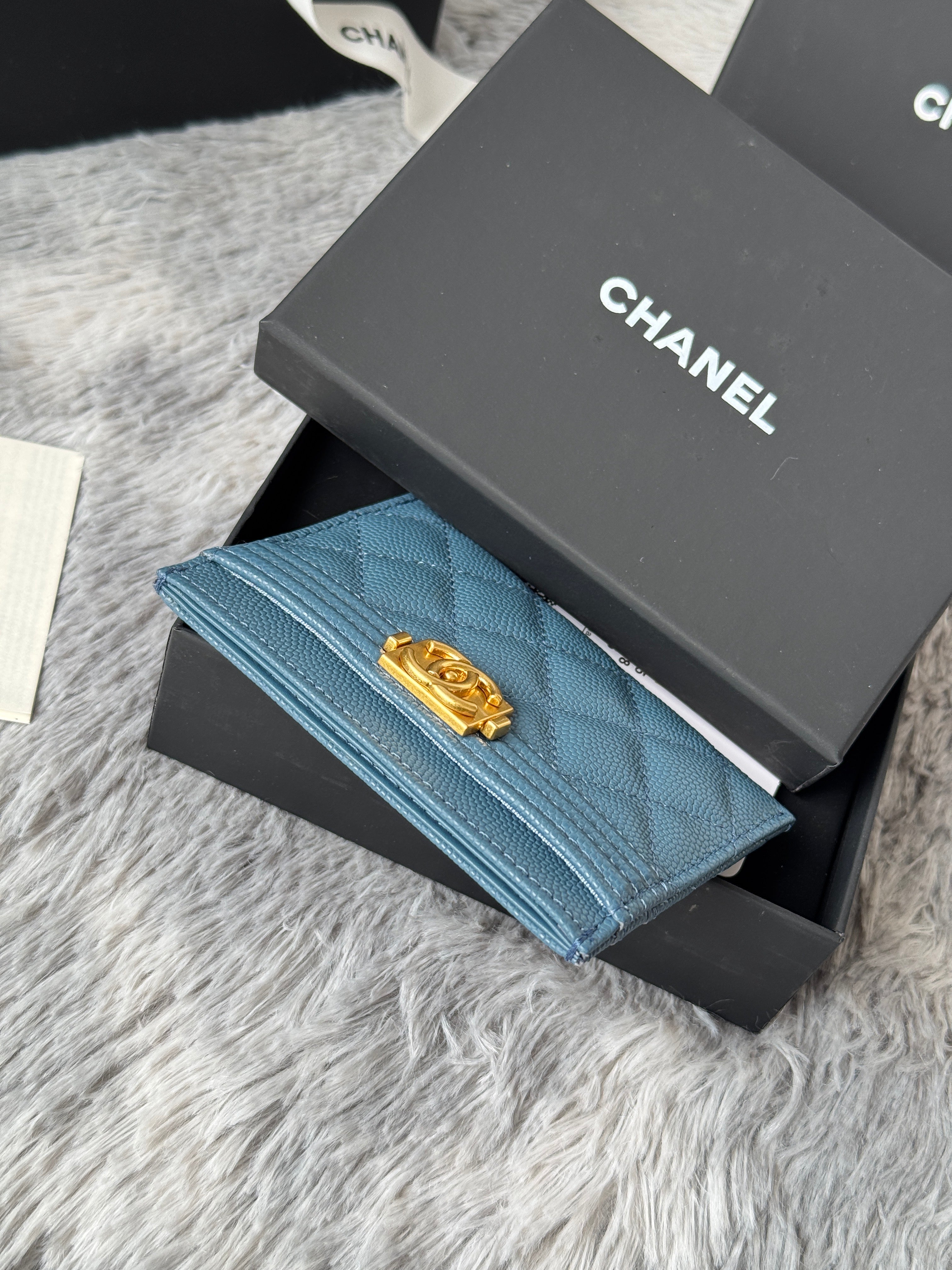LEBOY CARD HOLDER 11 IN NEPAL BLUE GRAINED CALFSKIN GOLD-TONE HARDWARE