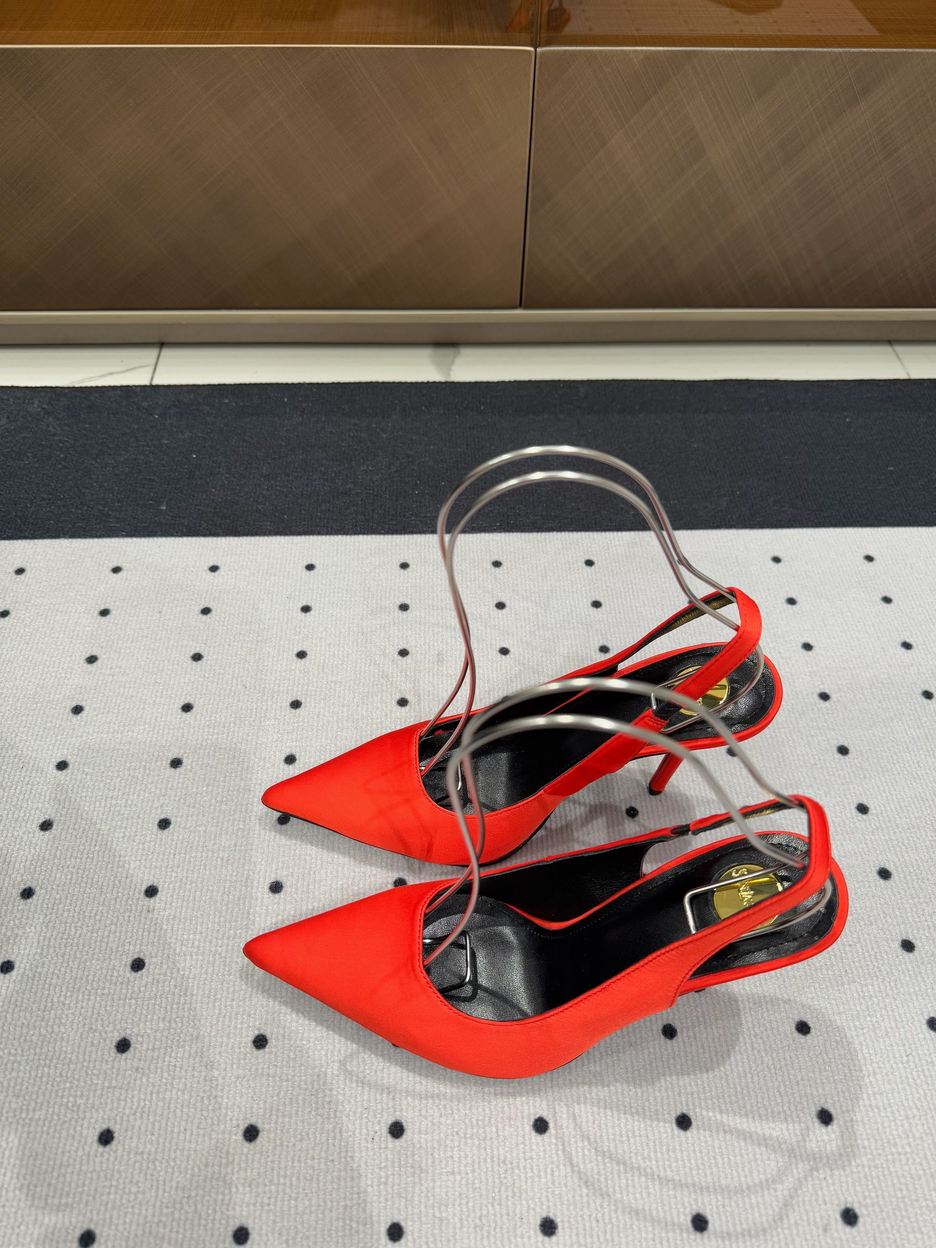 L'ENTRACTE SLINGBACK PUMPS IN RED SATIN