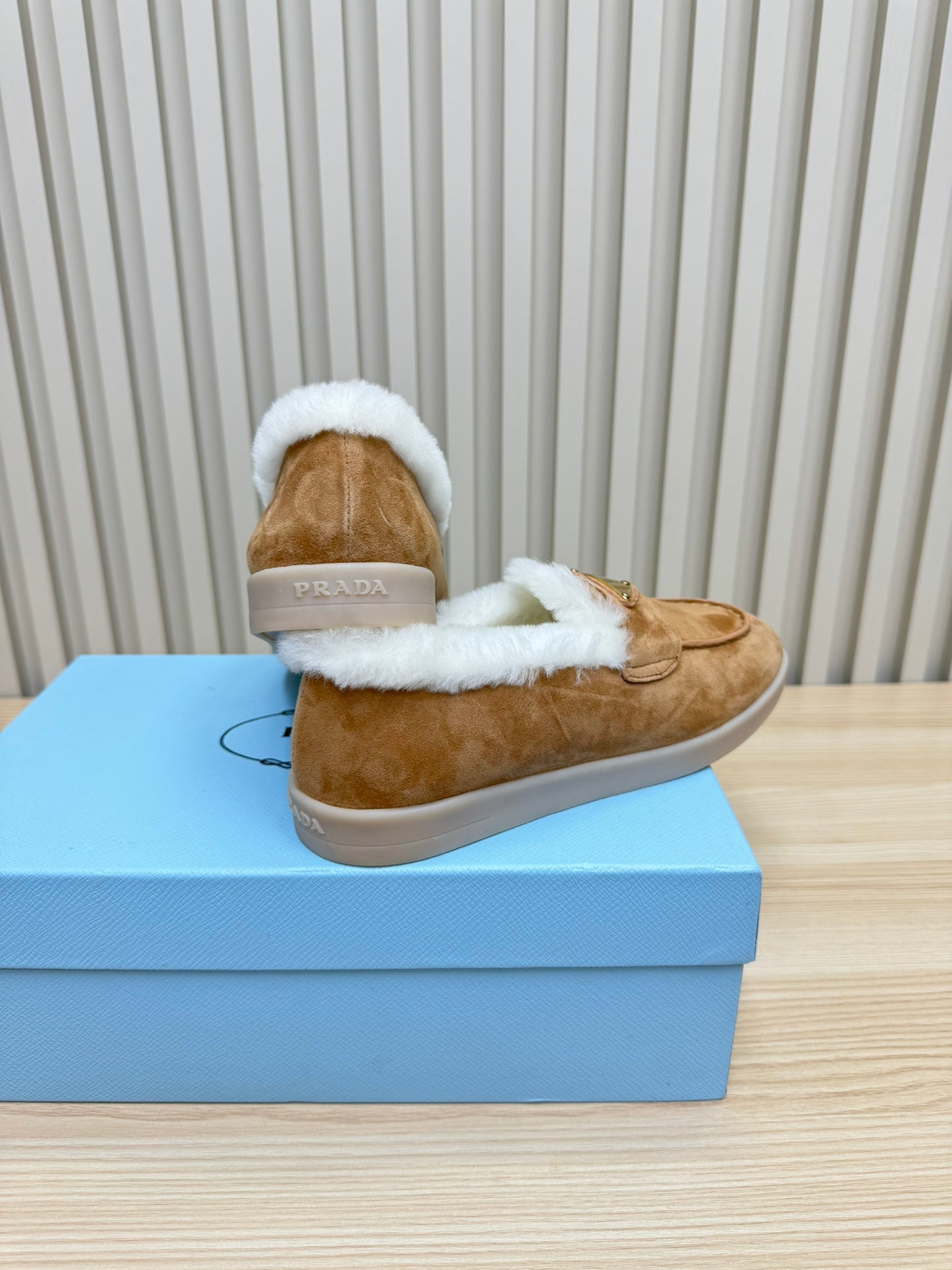 LOAFER IN CAMEL SUEDE AND FUR LINING ATTACHED TRIANGLE LOGO