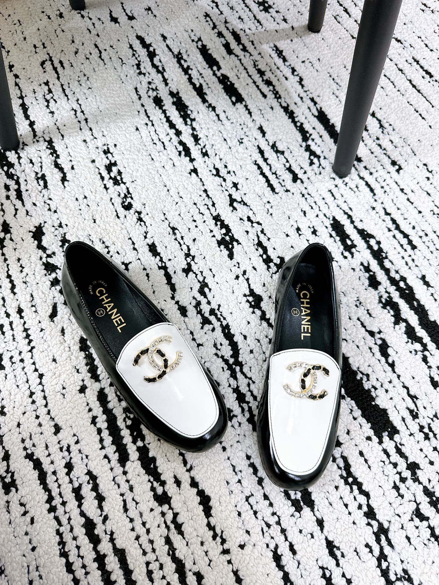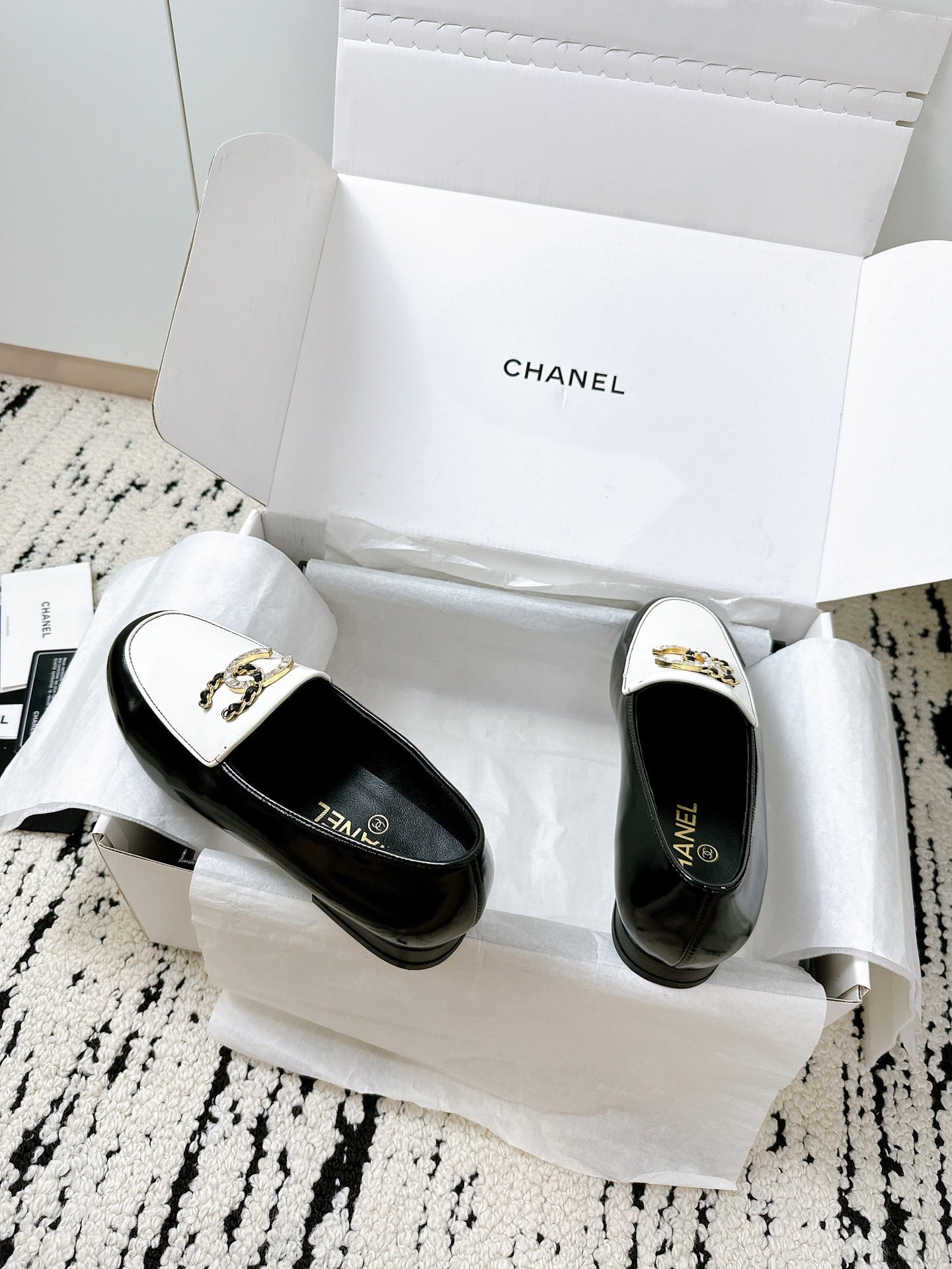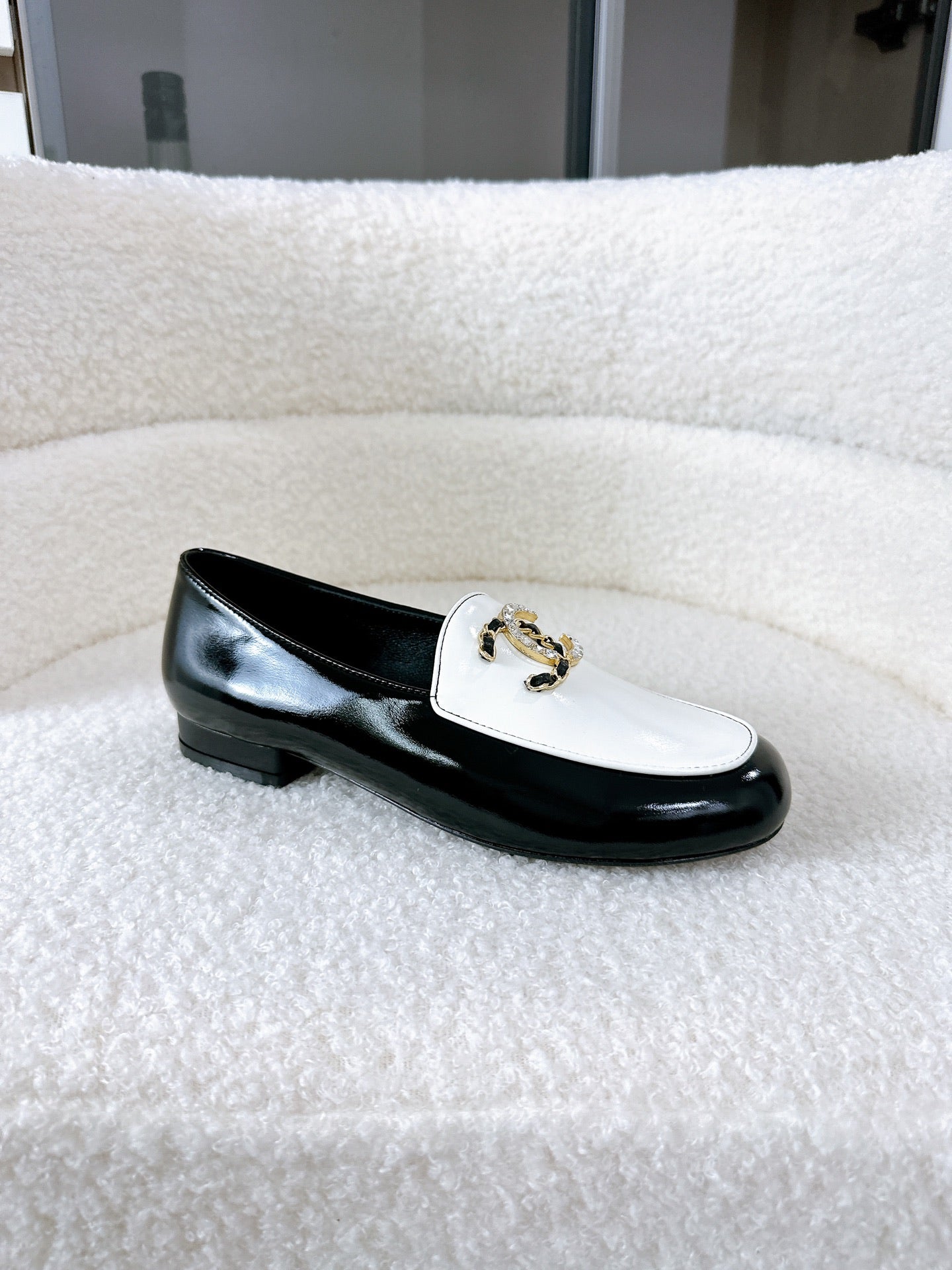 LOAFERS IN WHITE AND BLACK CALFSKIN HARDWARE WITH ROCK MIX CHAIN
