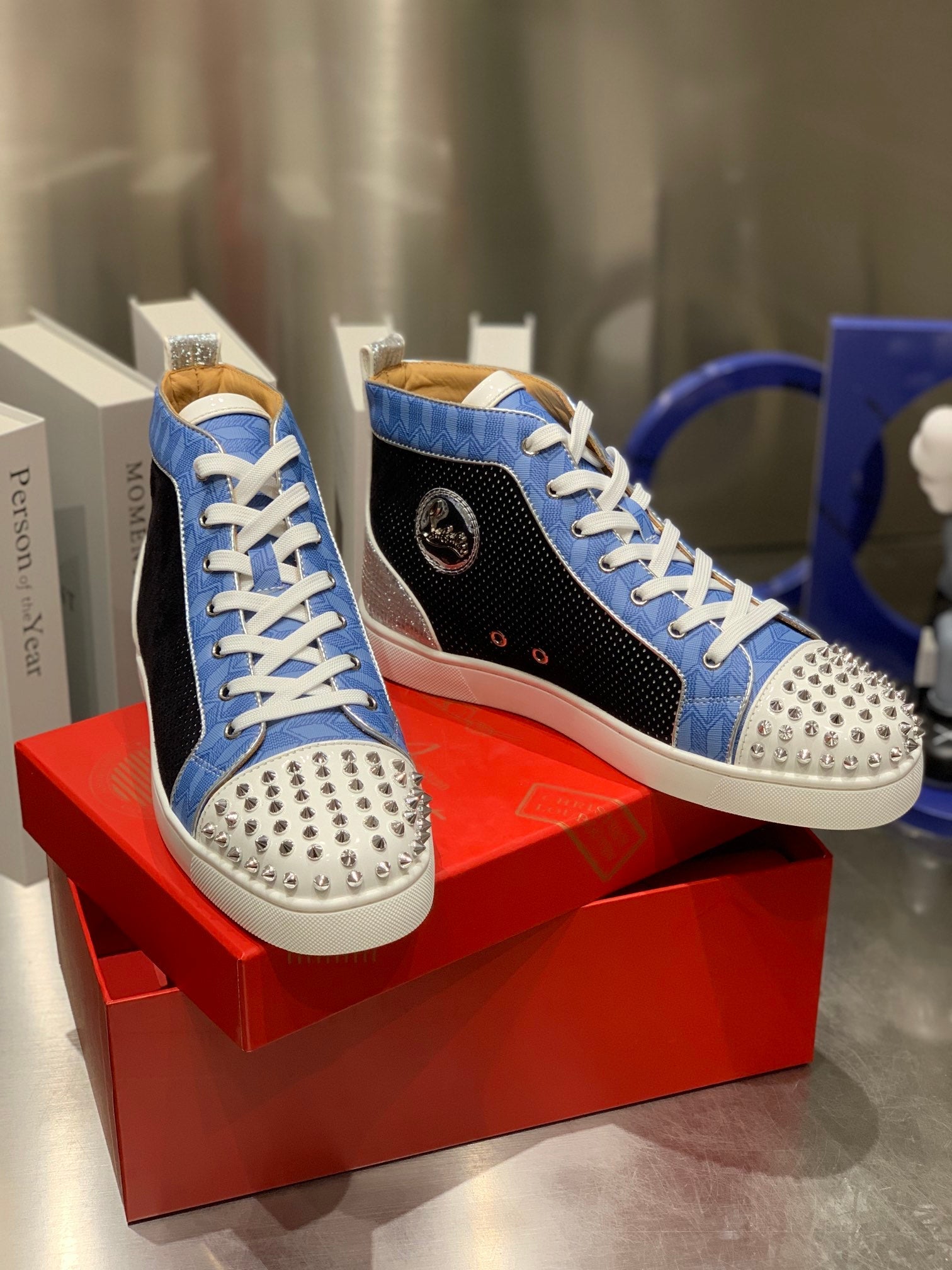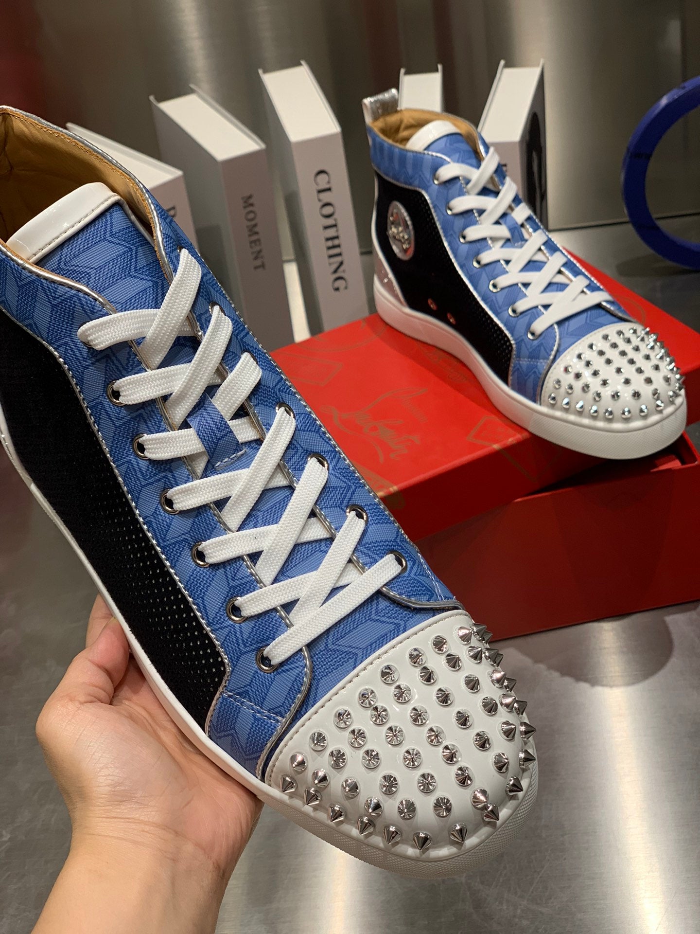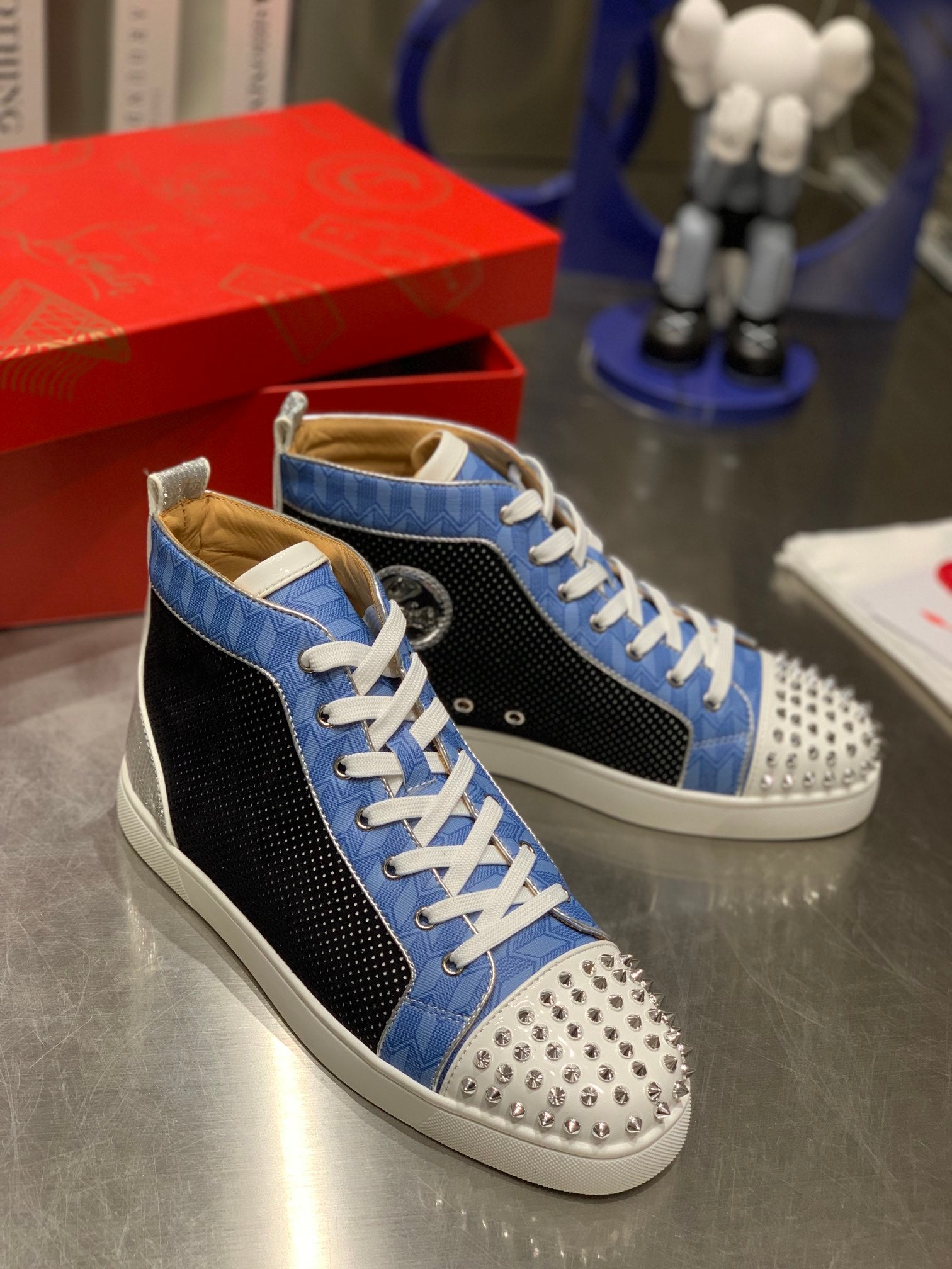 LOU SPIKES STUDDED HIGH-TOP SNEAKERS IN BLUE AND BLACK FABRIC MIX CALFSKIN