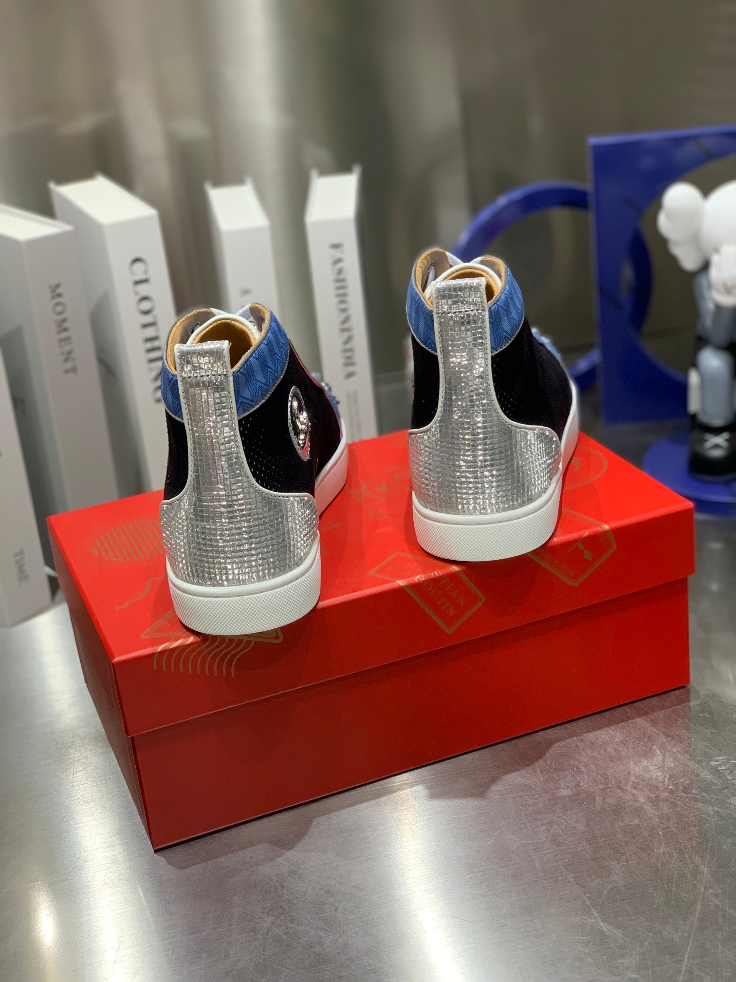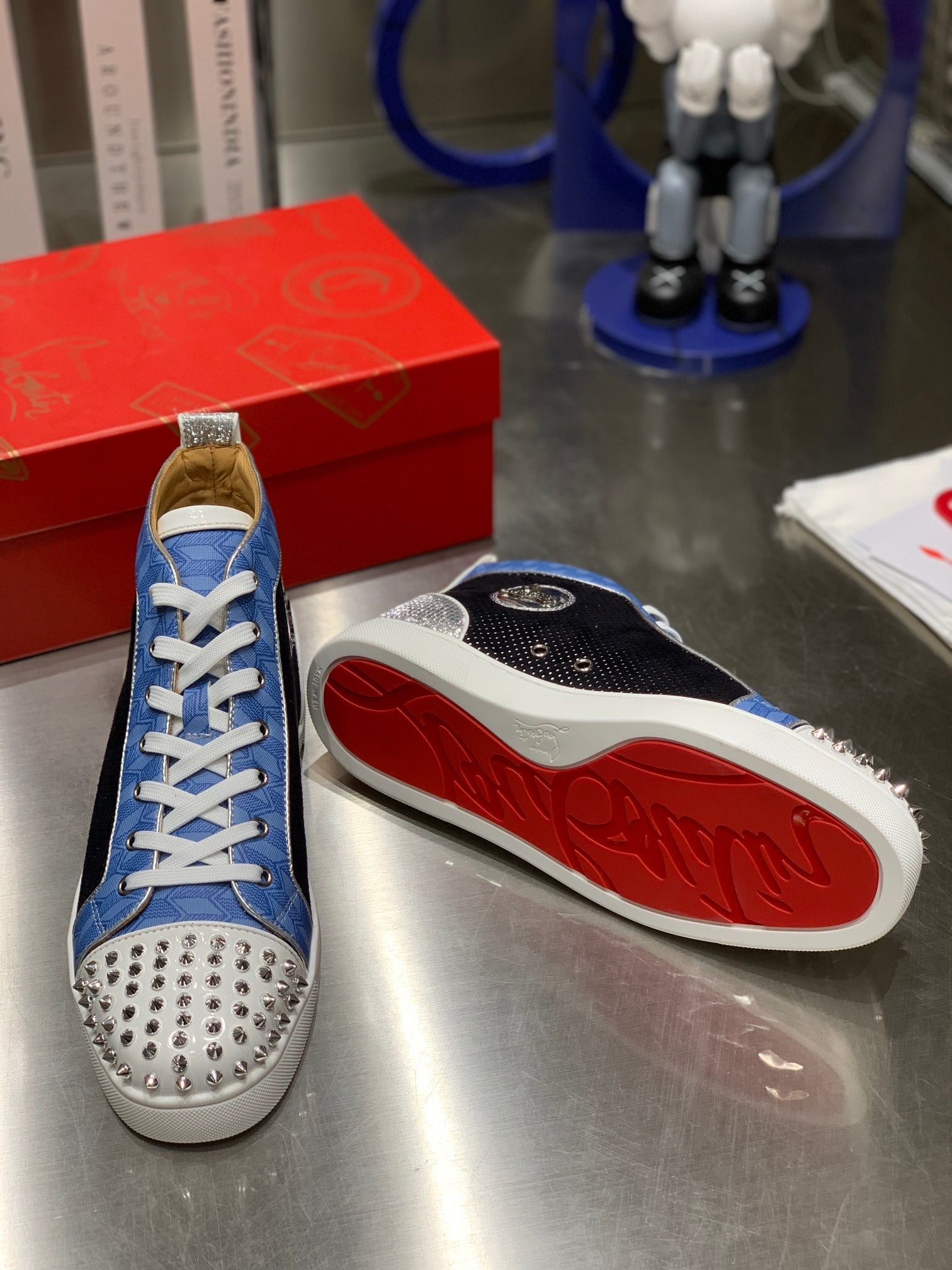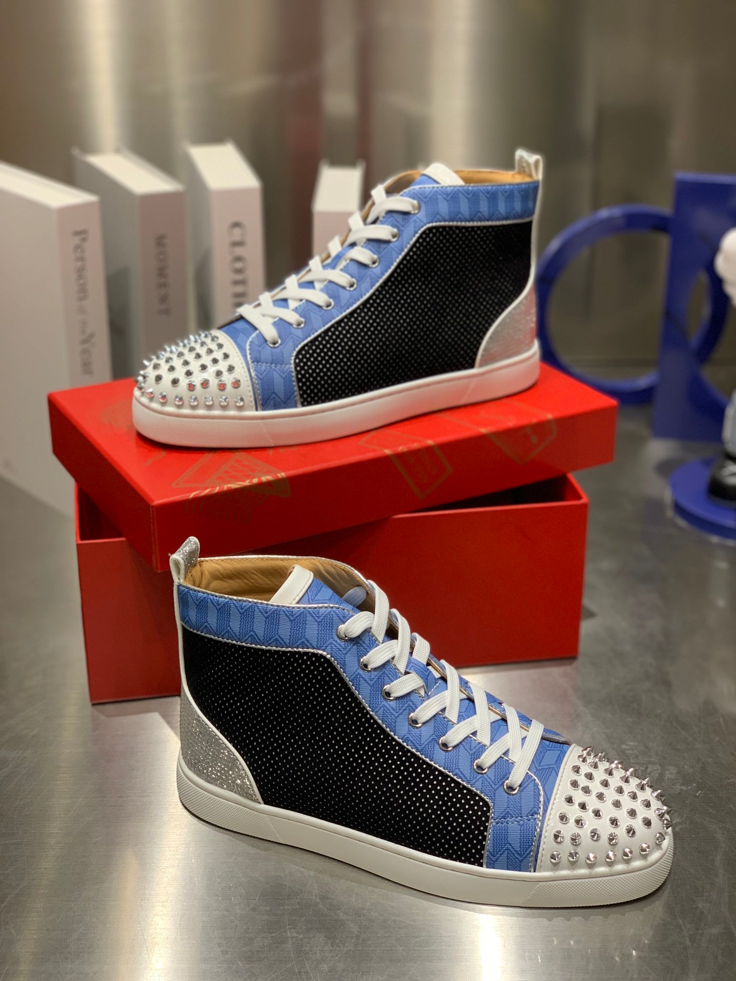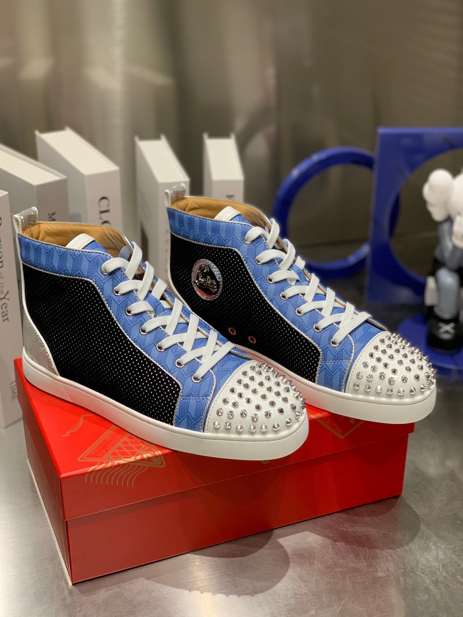 LOU SPIKES STUDDED HIGH-TOP SNEAKERS IN BLUE AND BLACK FABRIC MIX CALFSKIN