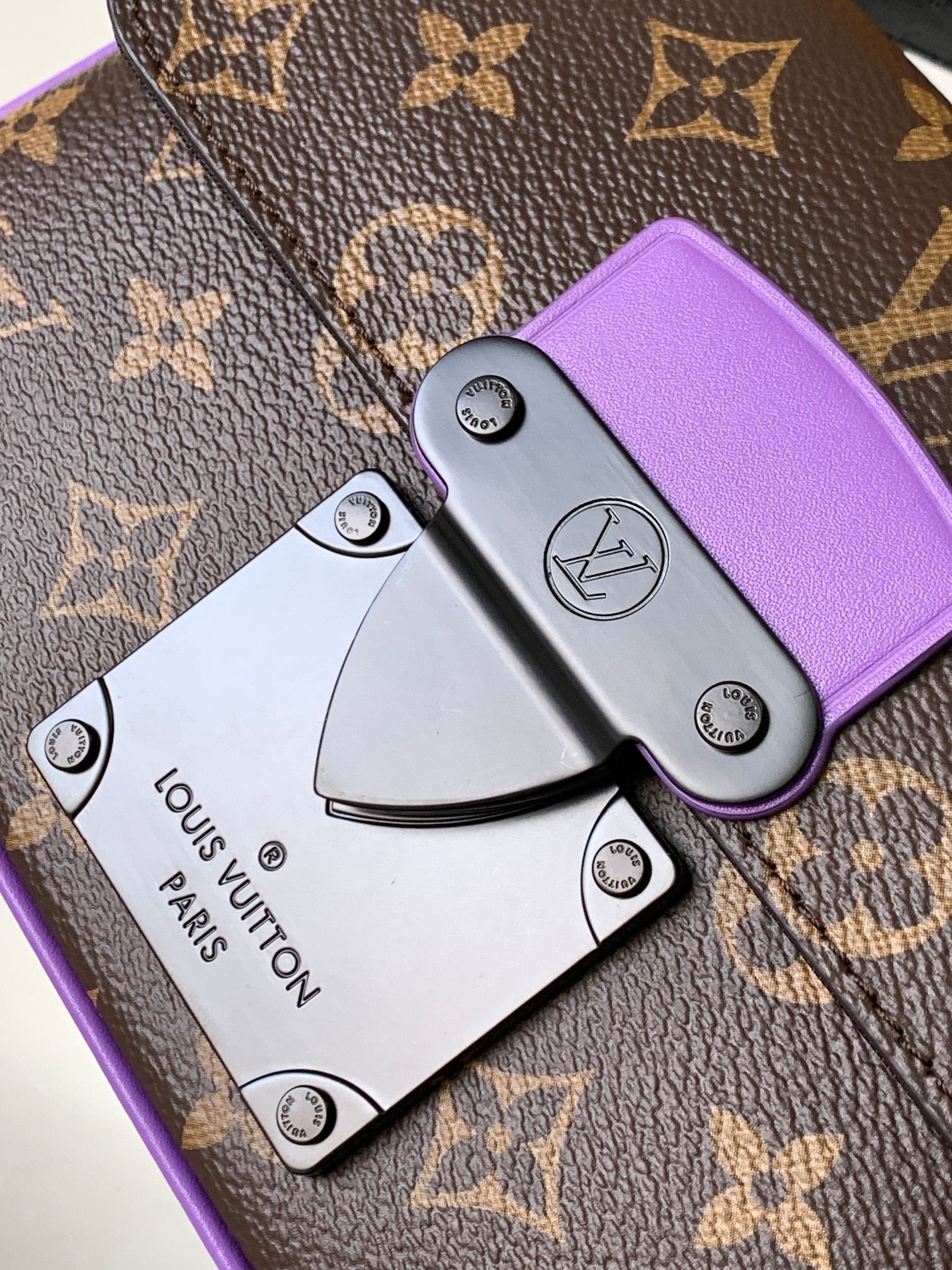 LV 25S S LOCK MESSENGER BAG 21 IN PURPLE AND BROWN MONOGRAM MACASSAR CANVAS