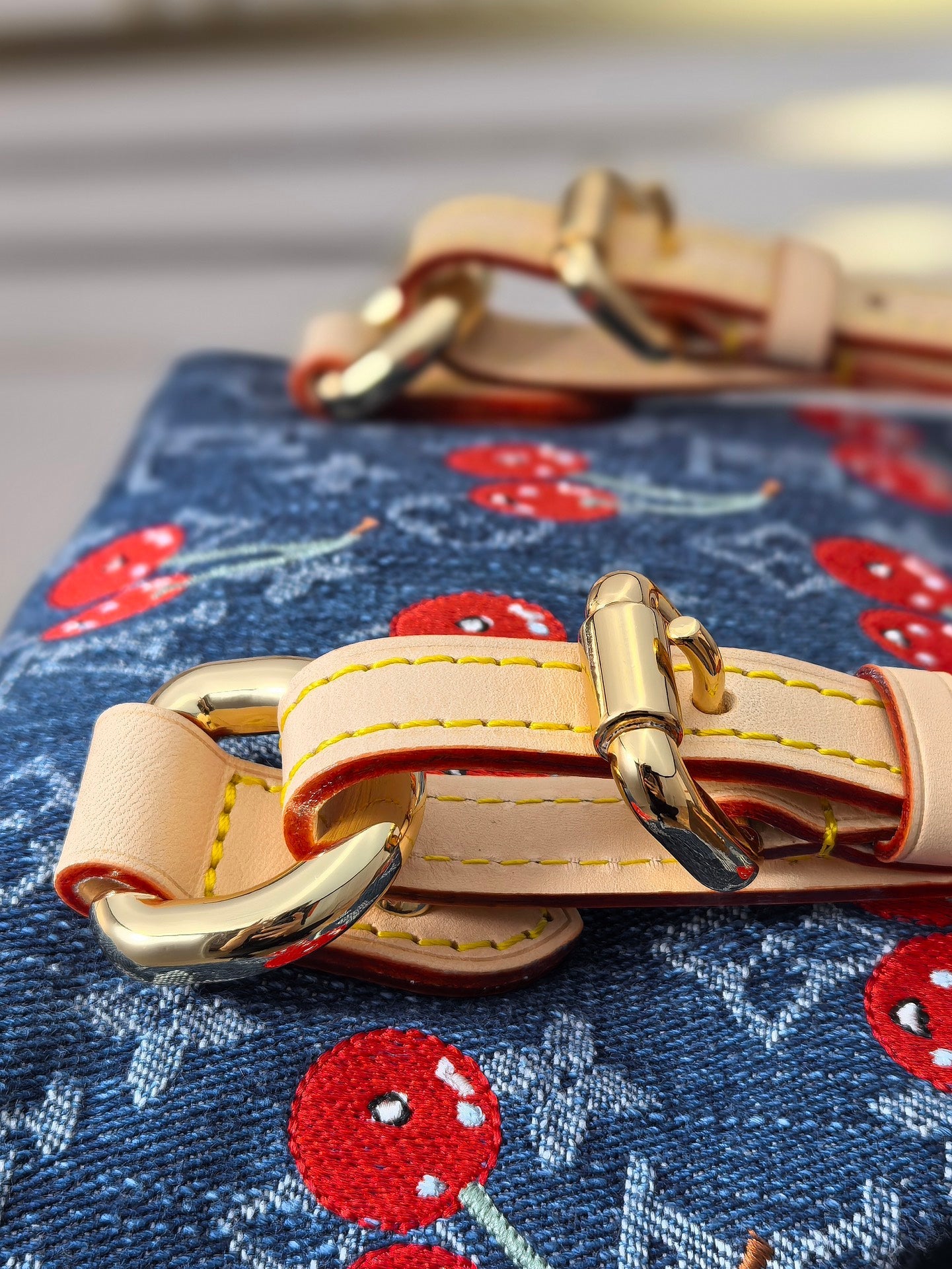 LV 25S VENICE BACKPACK 26 IN BLUE DENIM MONOGRAM CHERRY GOLD HARDWARE