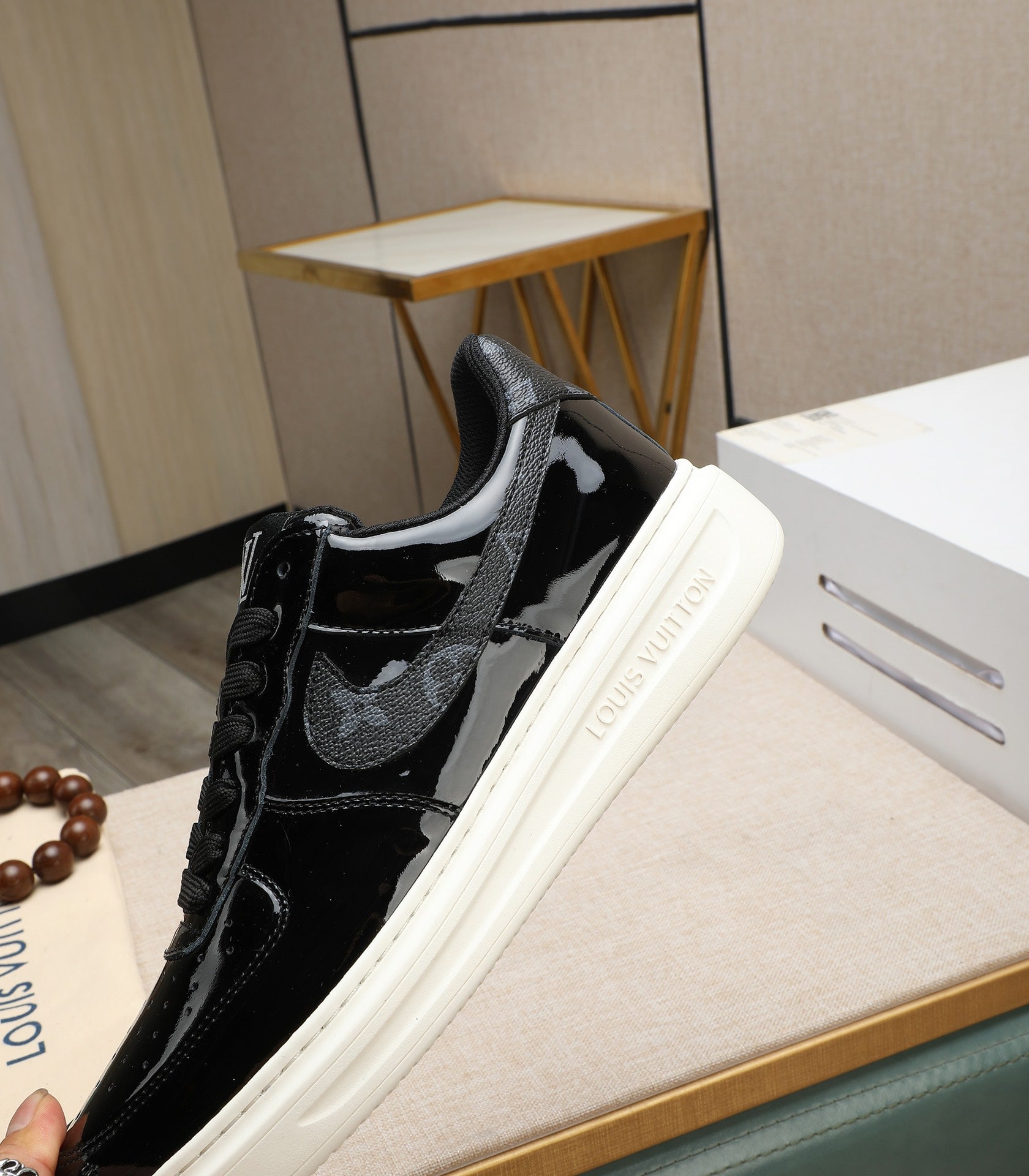 LV AIR FORCE 1 GLOSSY BLACK CALFSKIN WITH MONOGRAM LOGO