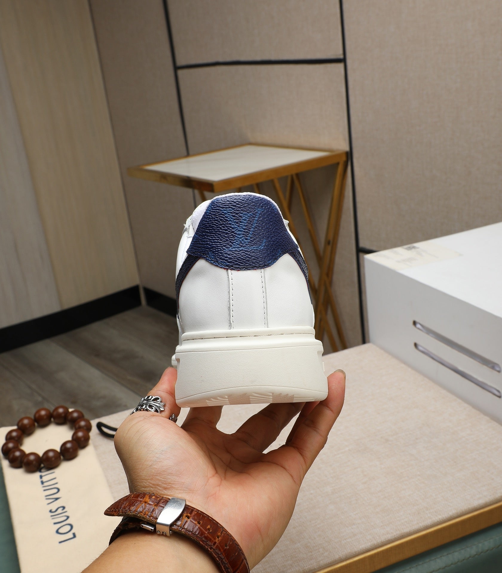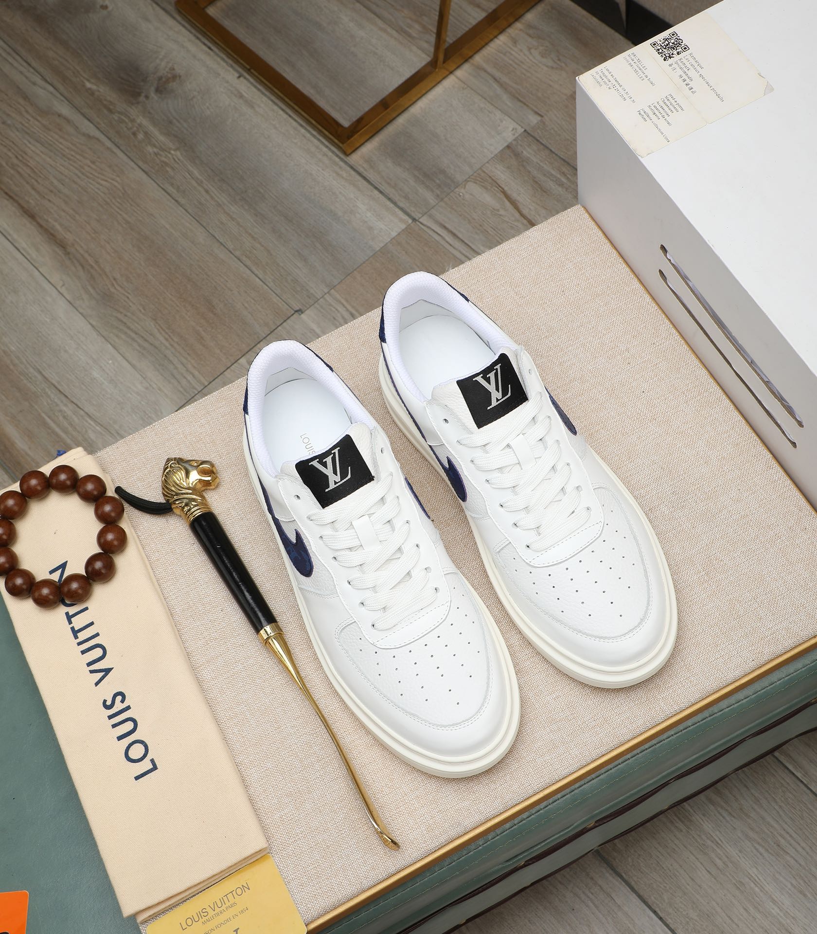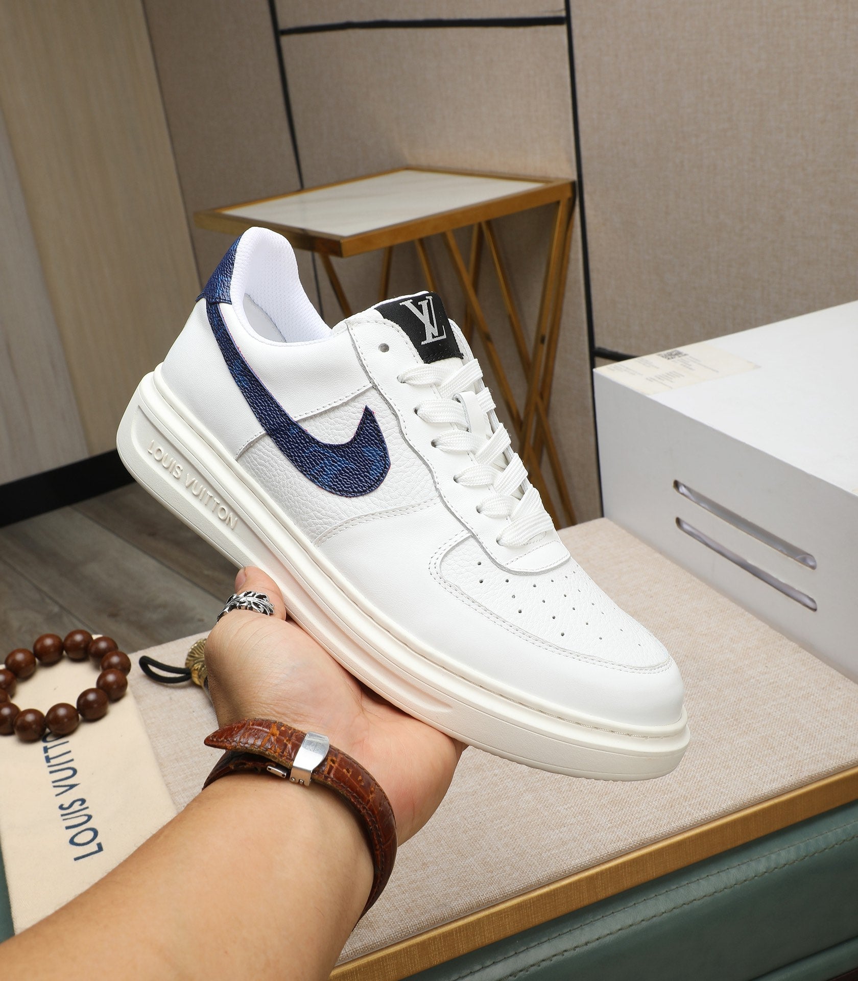 LV AIR FORCE 1 GLOSSY WHITE CALFSKIN WITH BLUE MONOGRAM LOGO