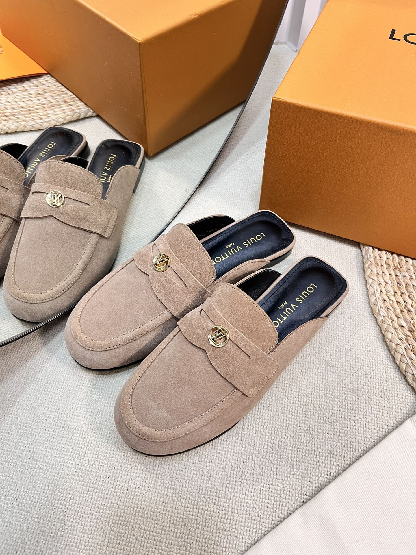 LV CAPRI OPEN BACK LOAFERS IN MEDIUM BROWN SUEDE