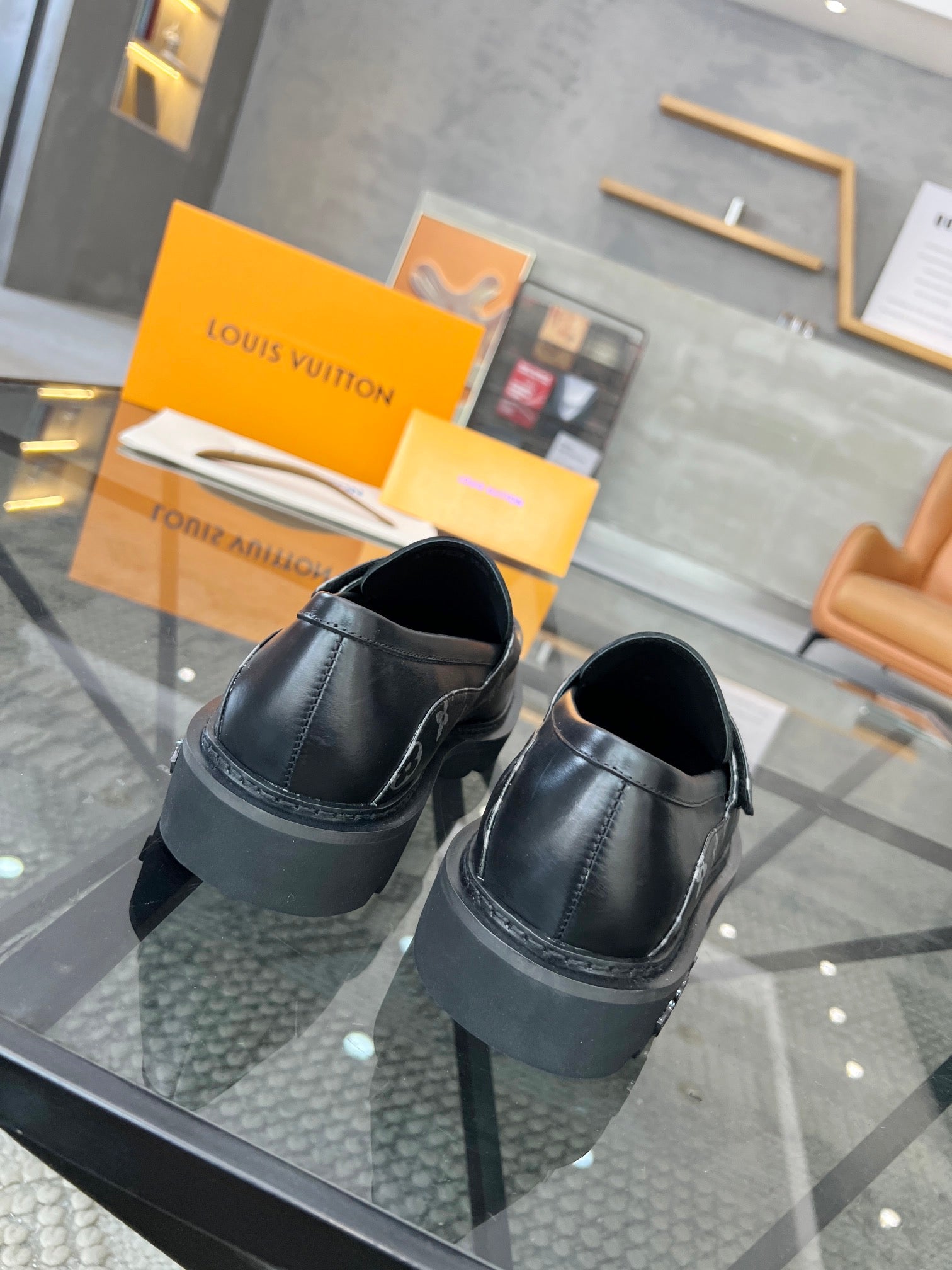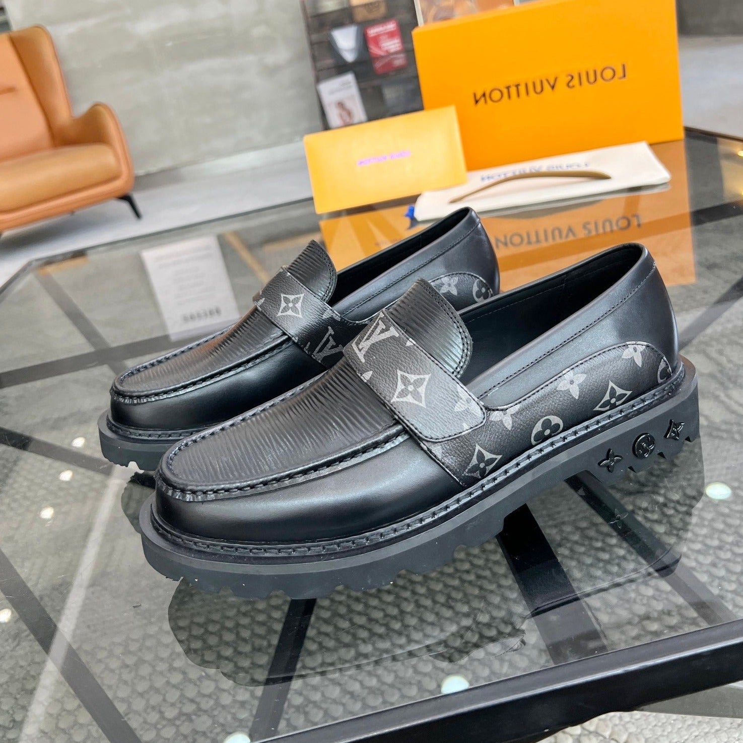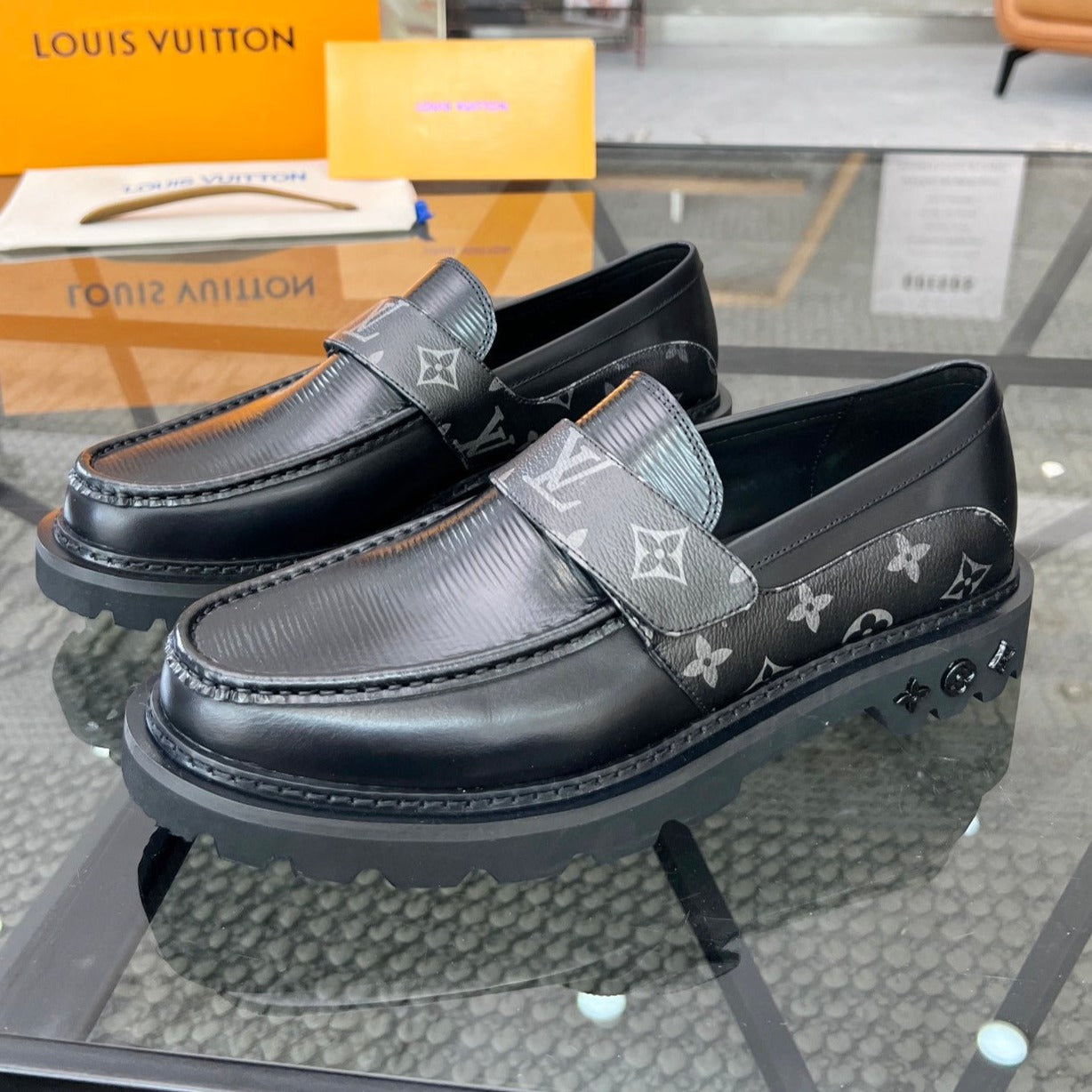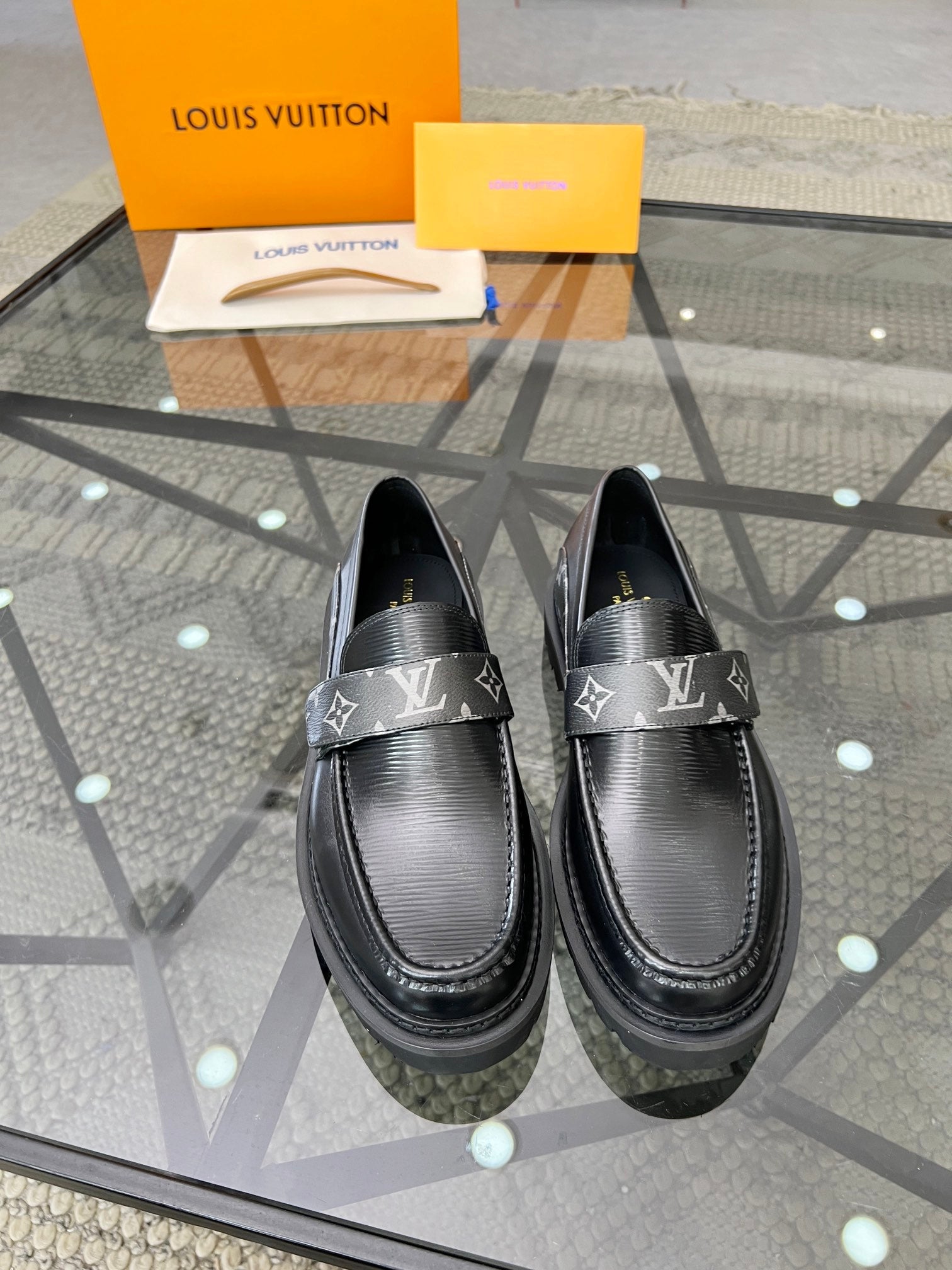 LV LOAFERS BLACK PLAIN CALFSKIN WITH MONOGRAM STRAP