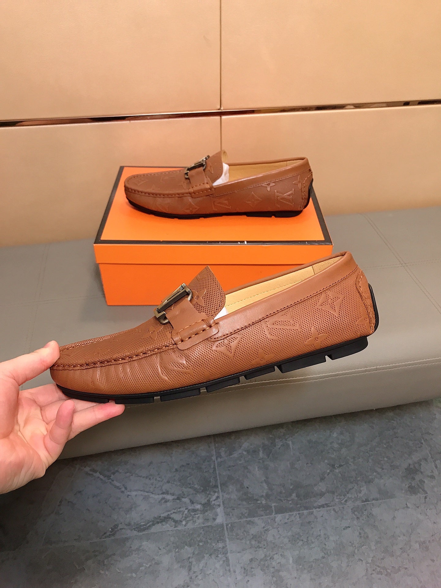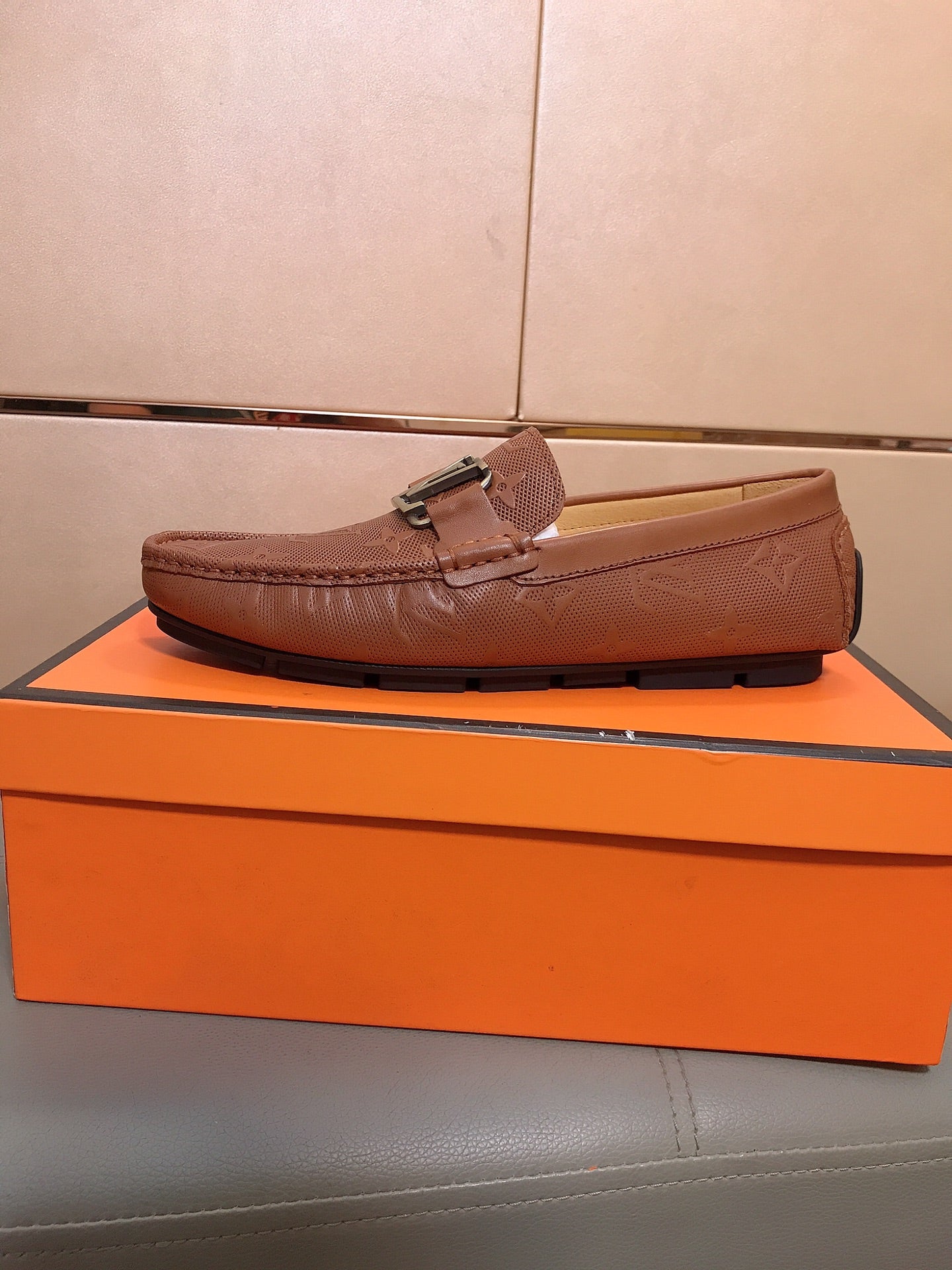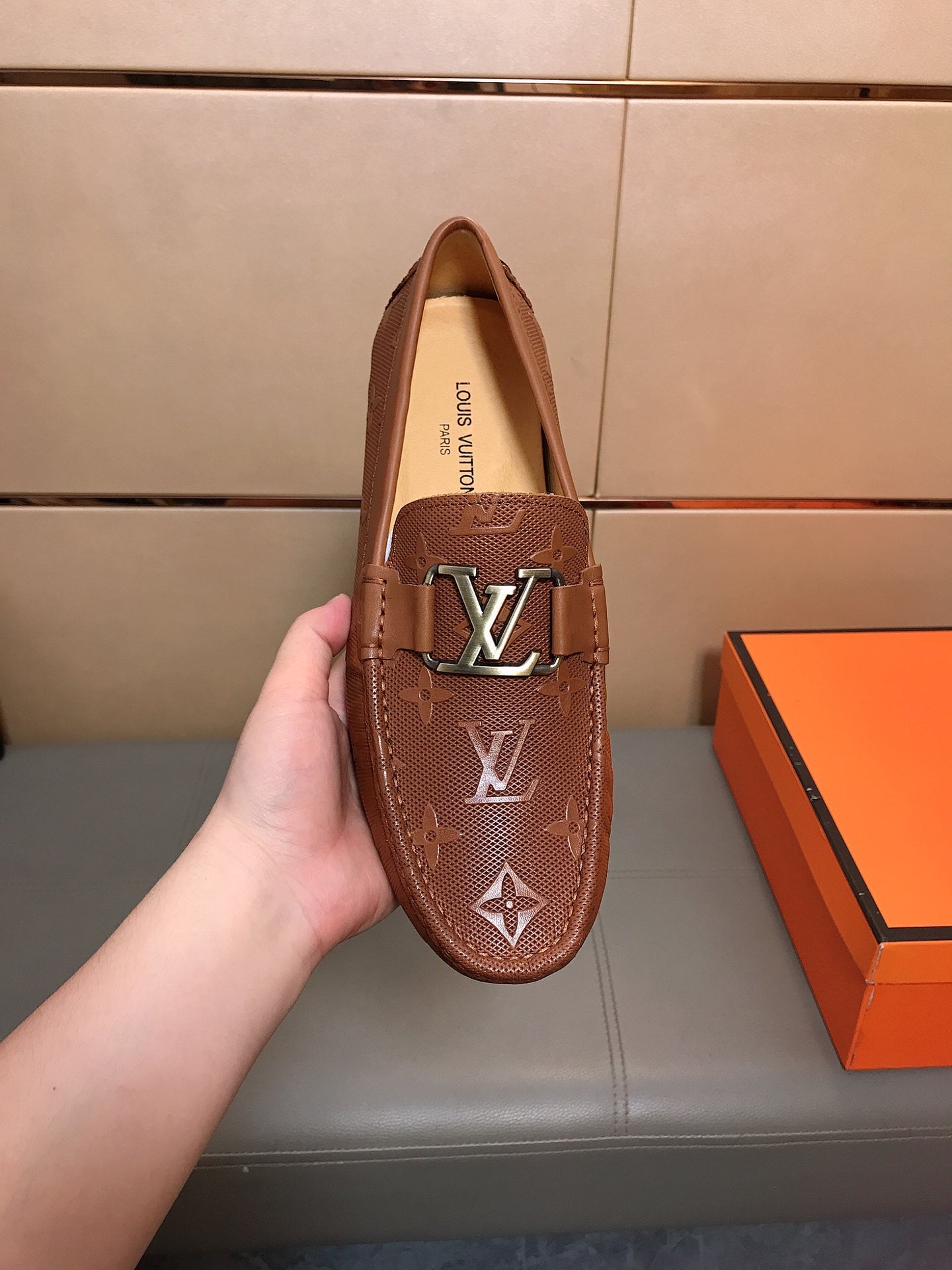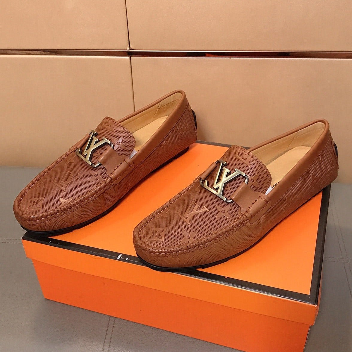 LV LOAFERS IN RUSSET BROWN CALFSKIN WITH BRANDED EMBOSSING