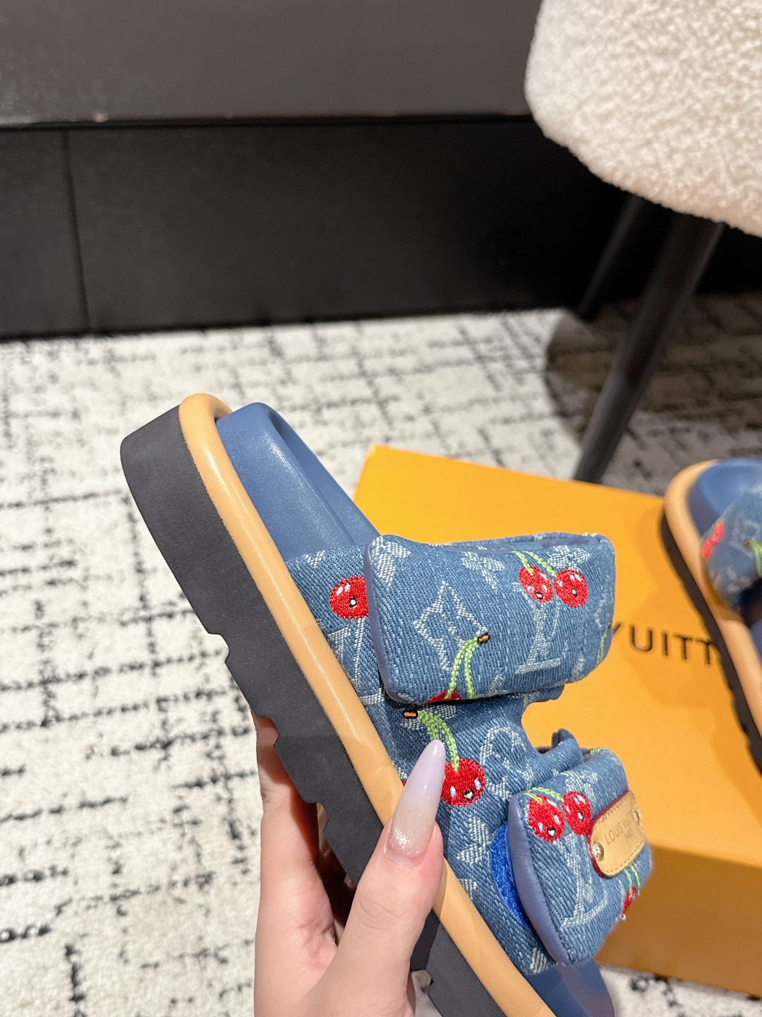 LV MIAMI DOUBLE-STRAP SANDALS 25S IN BLUE DENIM AND CALFSKIN