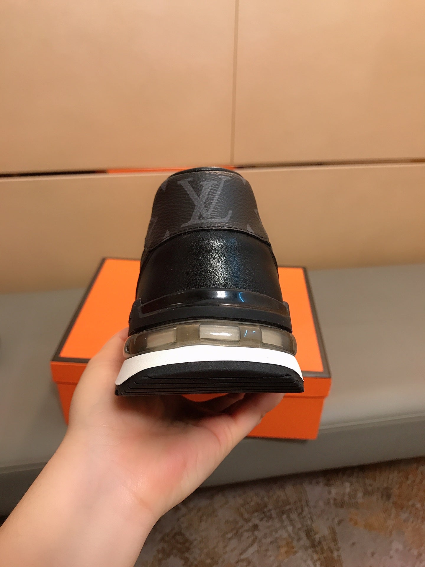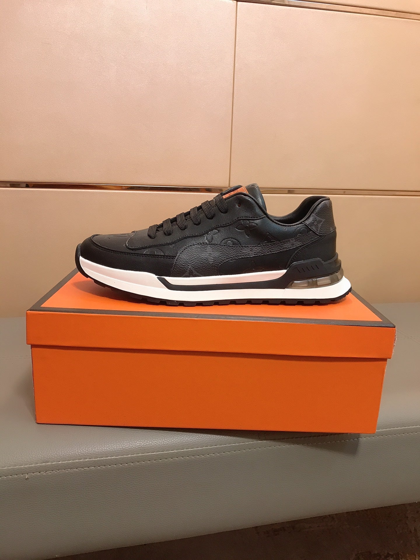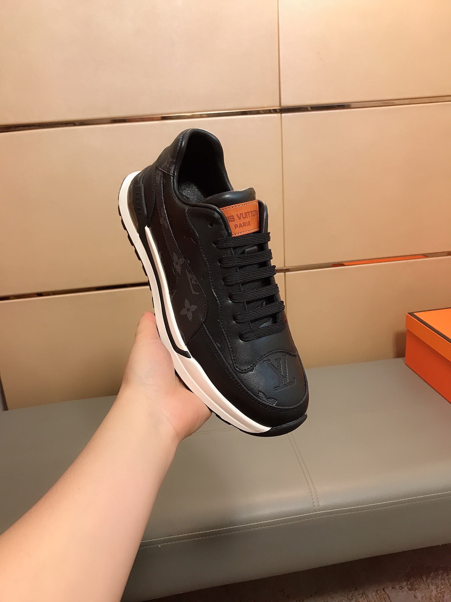 LV SNEAKERS IN BLACK CALFSKIN AND BRANDED PRINTED FABRIC