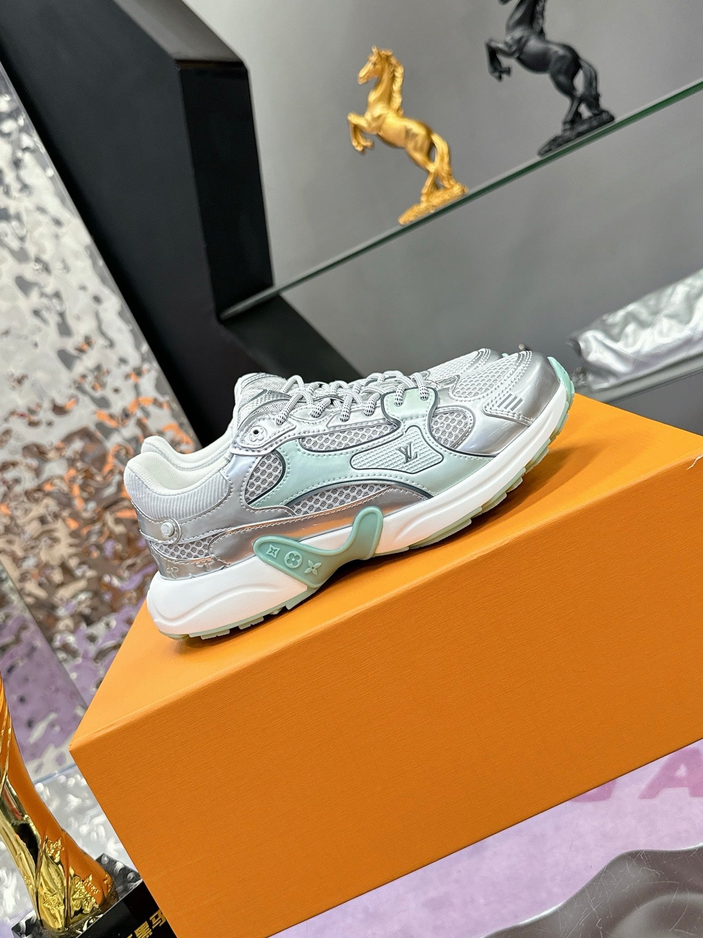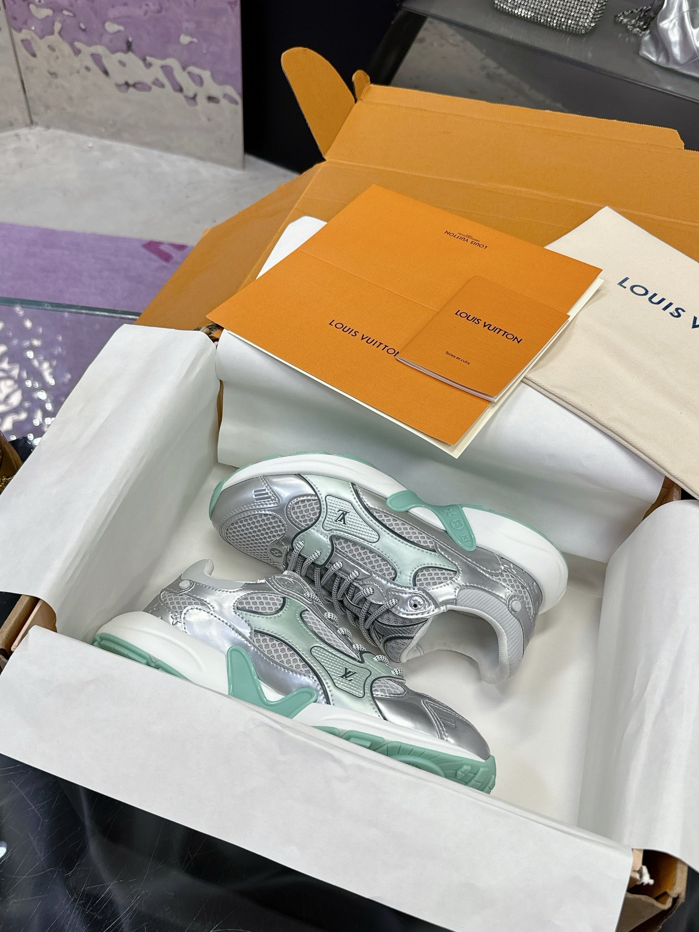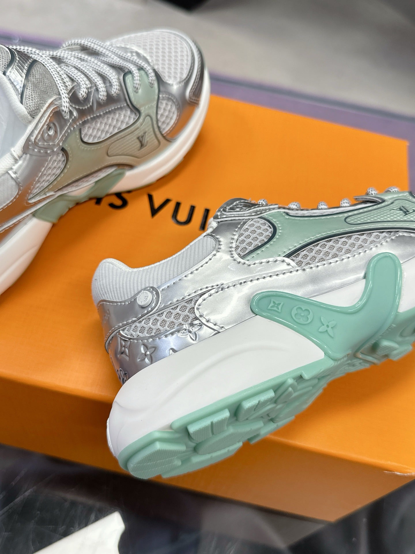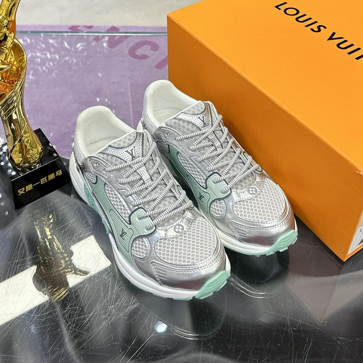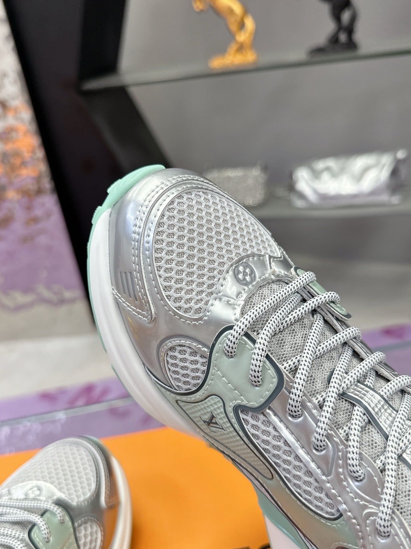 LV SNEAKERS IN SILVER AND GREEN MESH MIX CALFSKIN