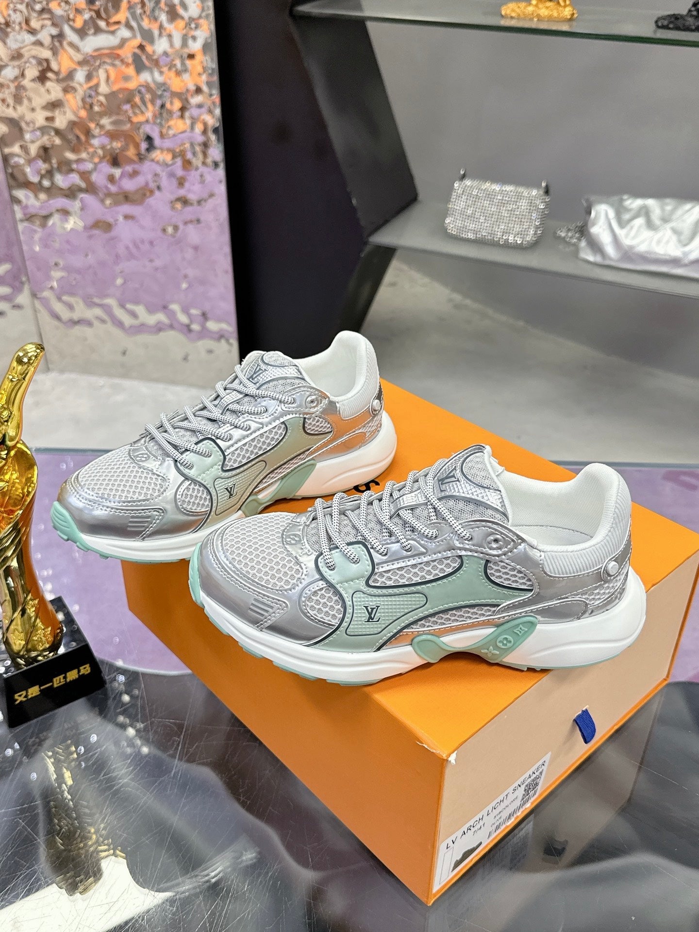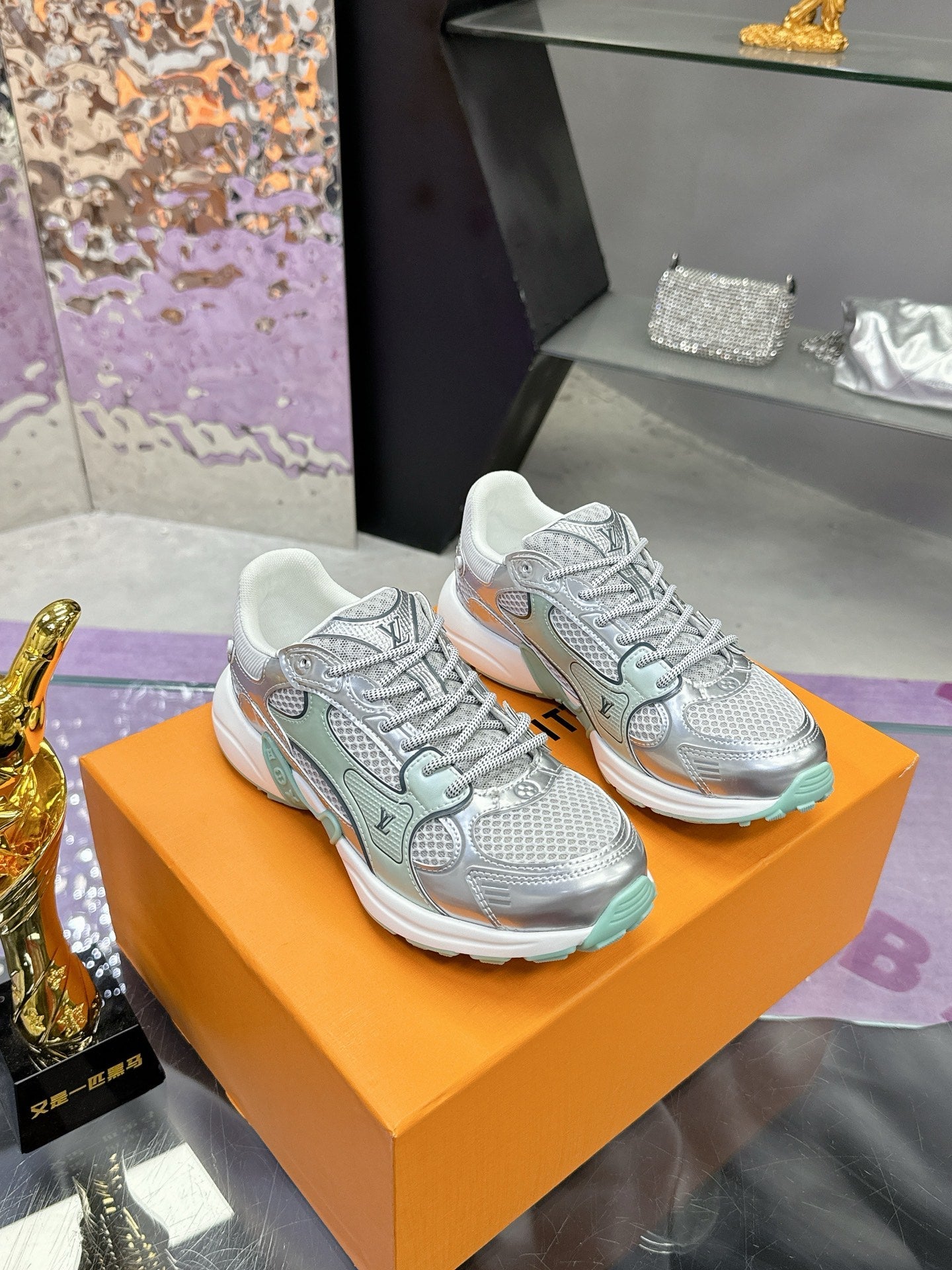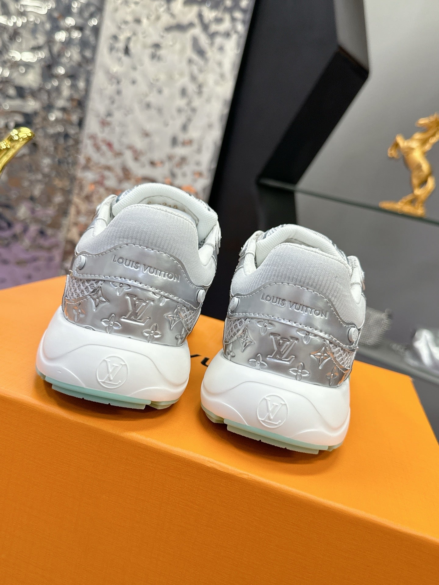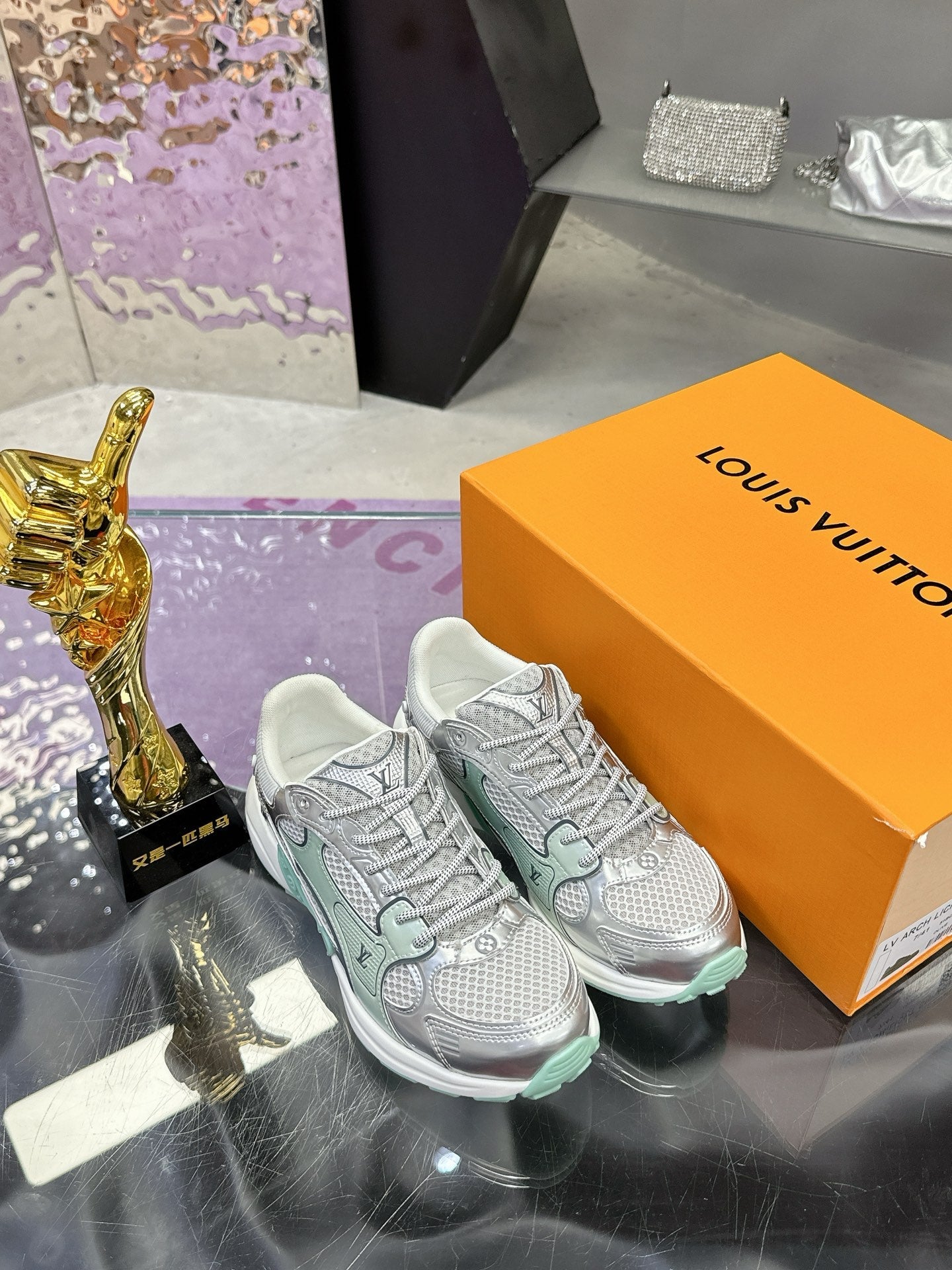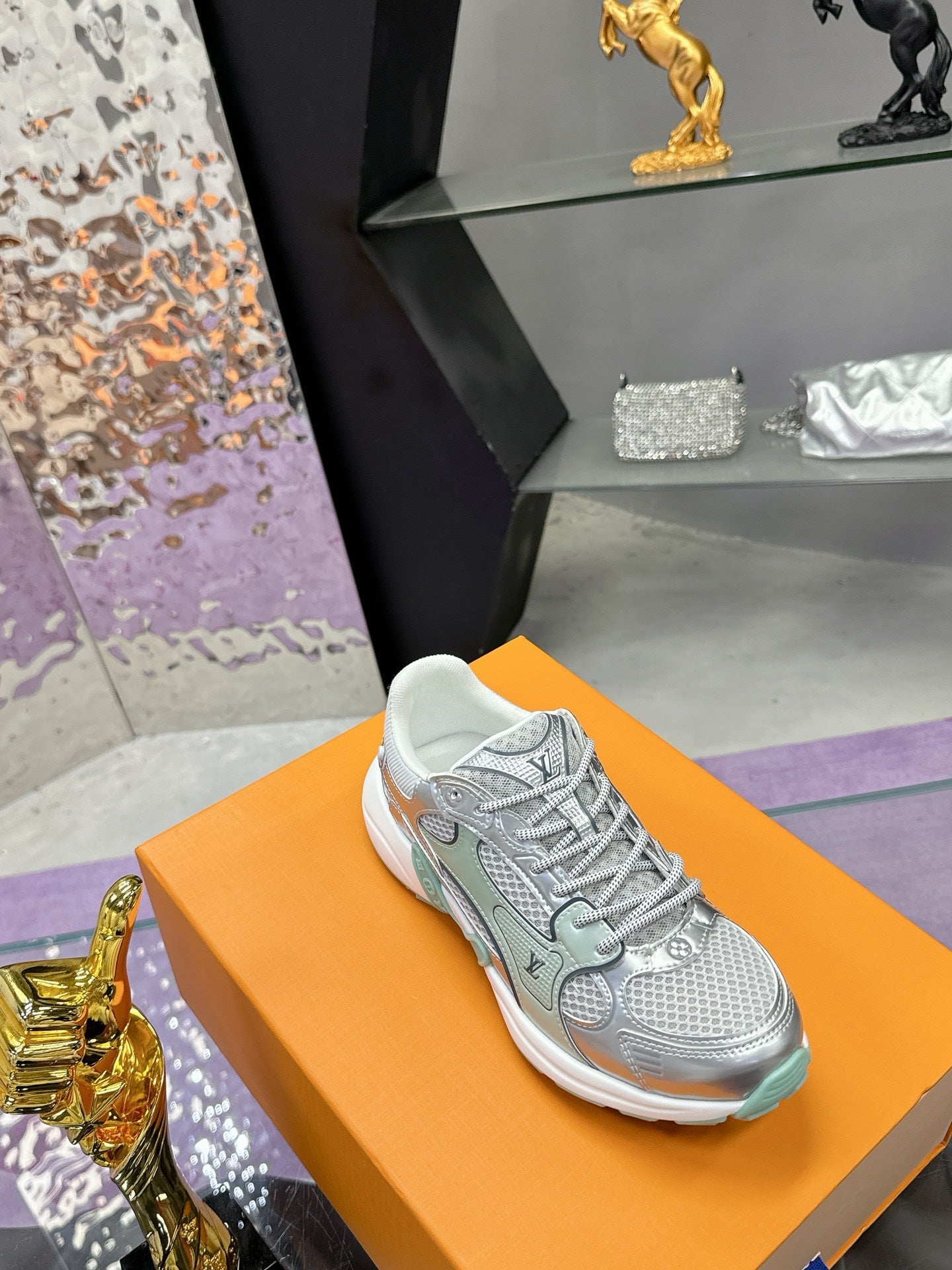 LV SNEAKERS IN SILVER AND GREEN MESH MIX CALFSKIN