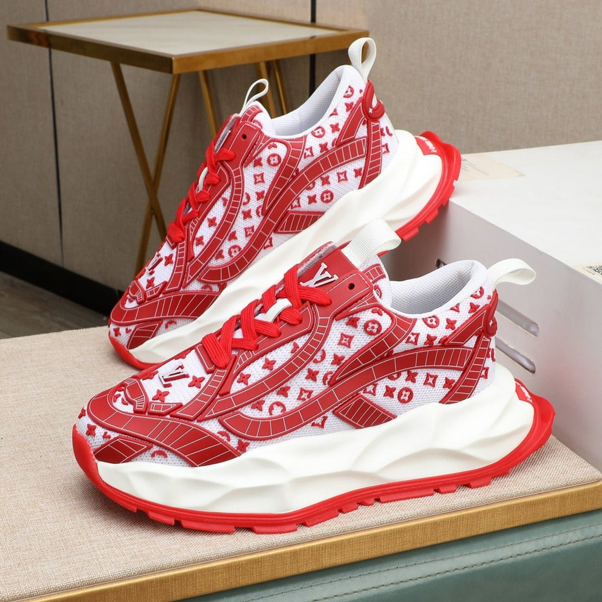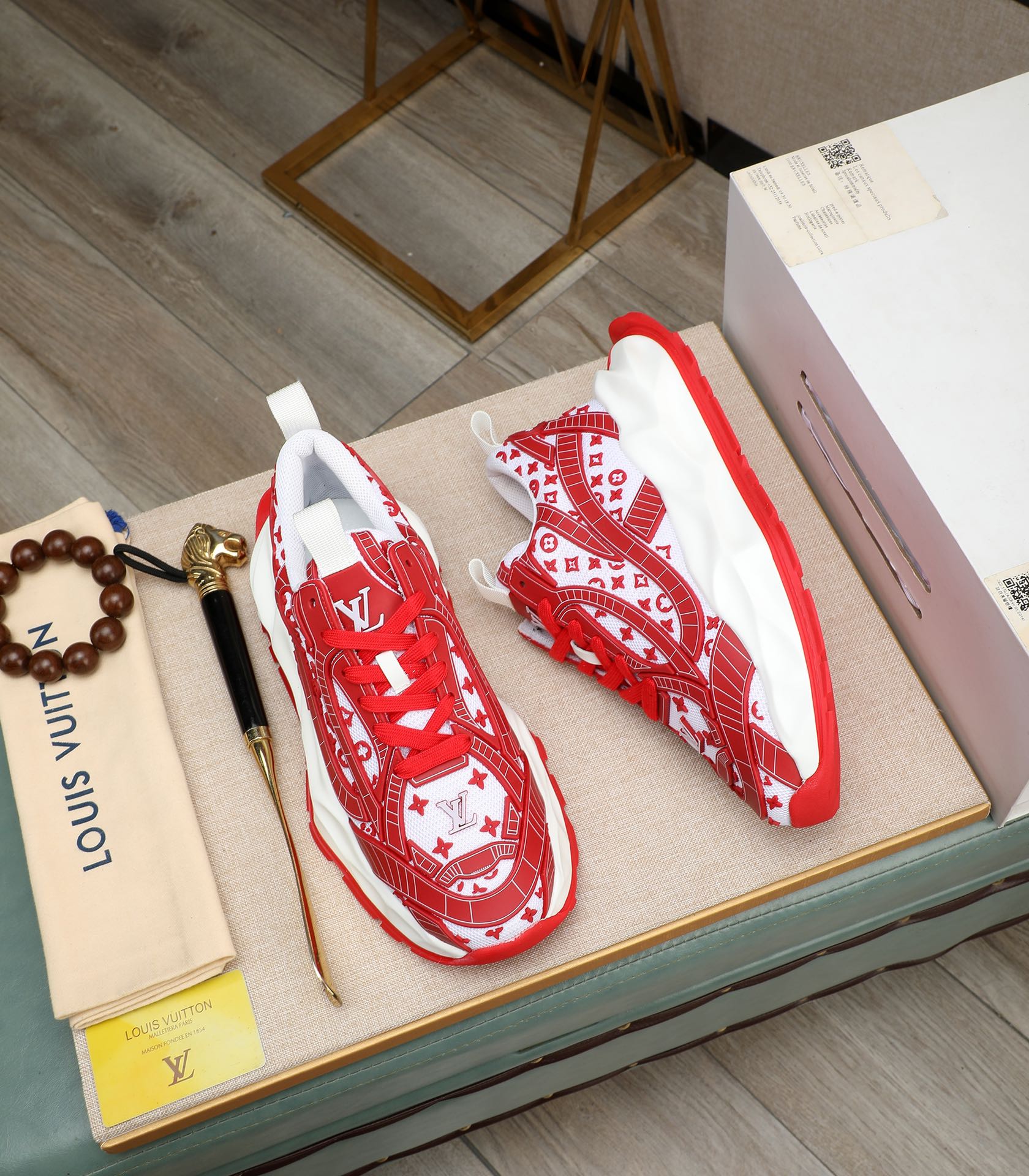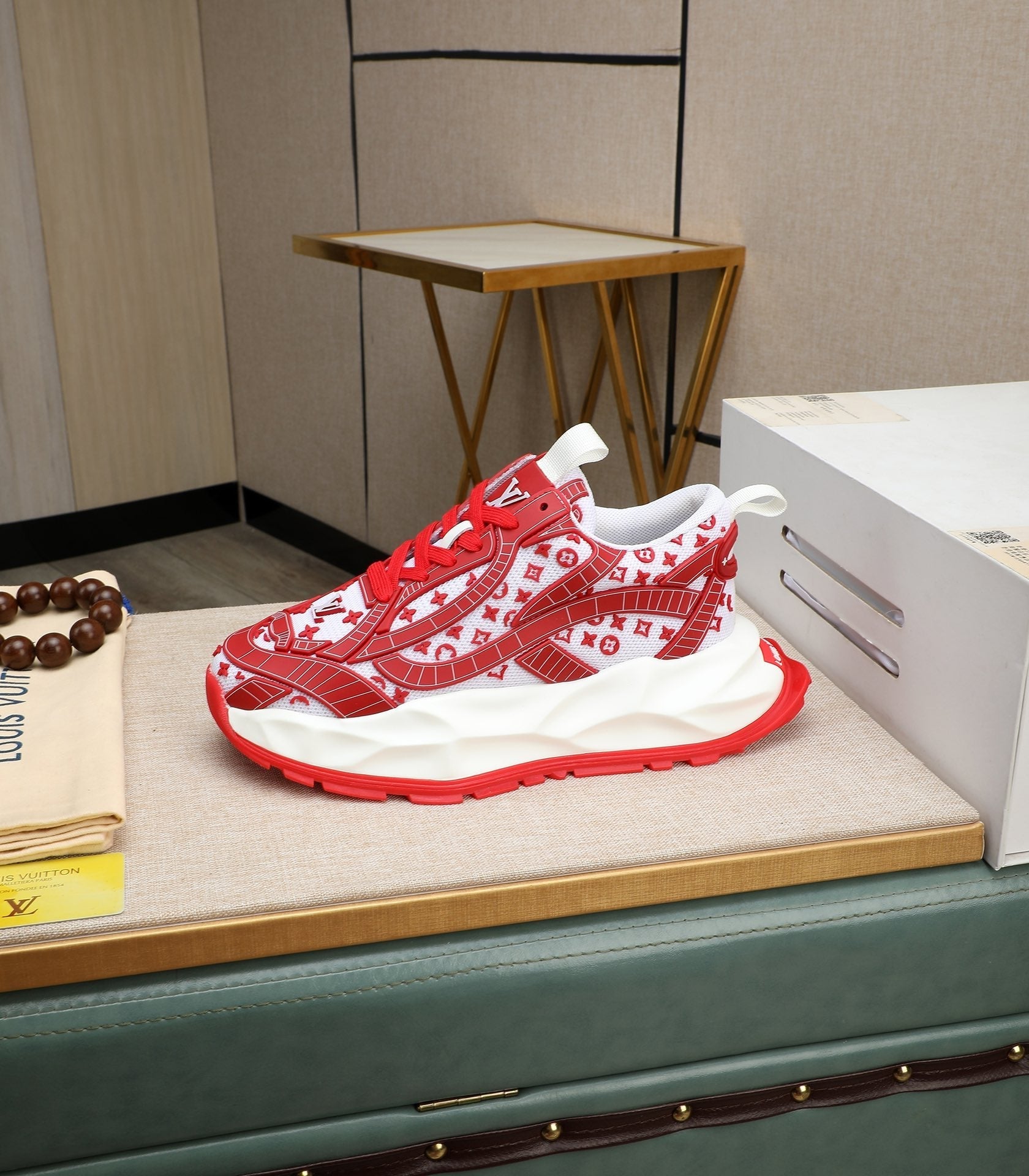 LV TRAINER WHITE MIX RED CALFSKIN AND BREATHABLE MESH