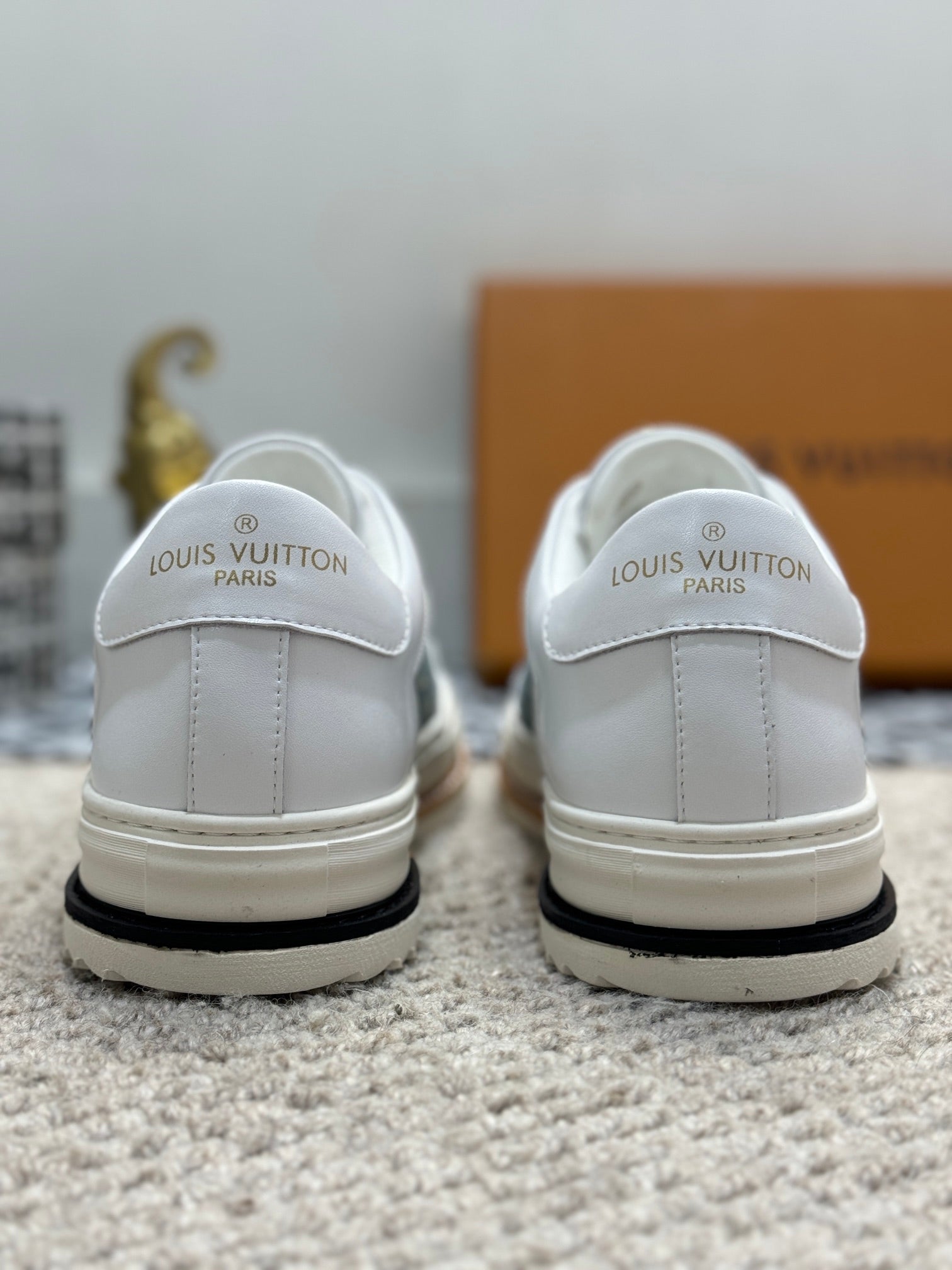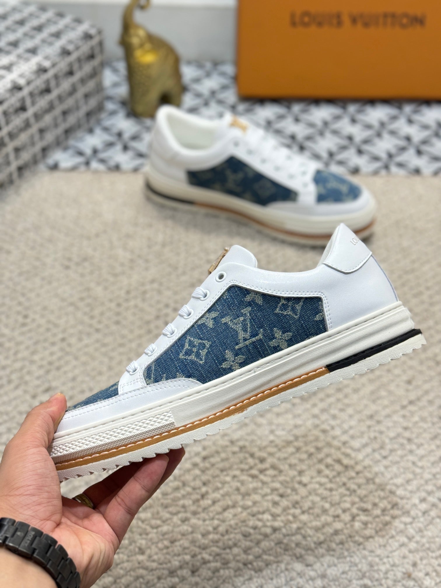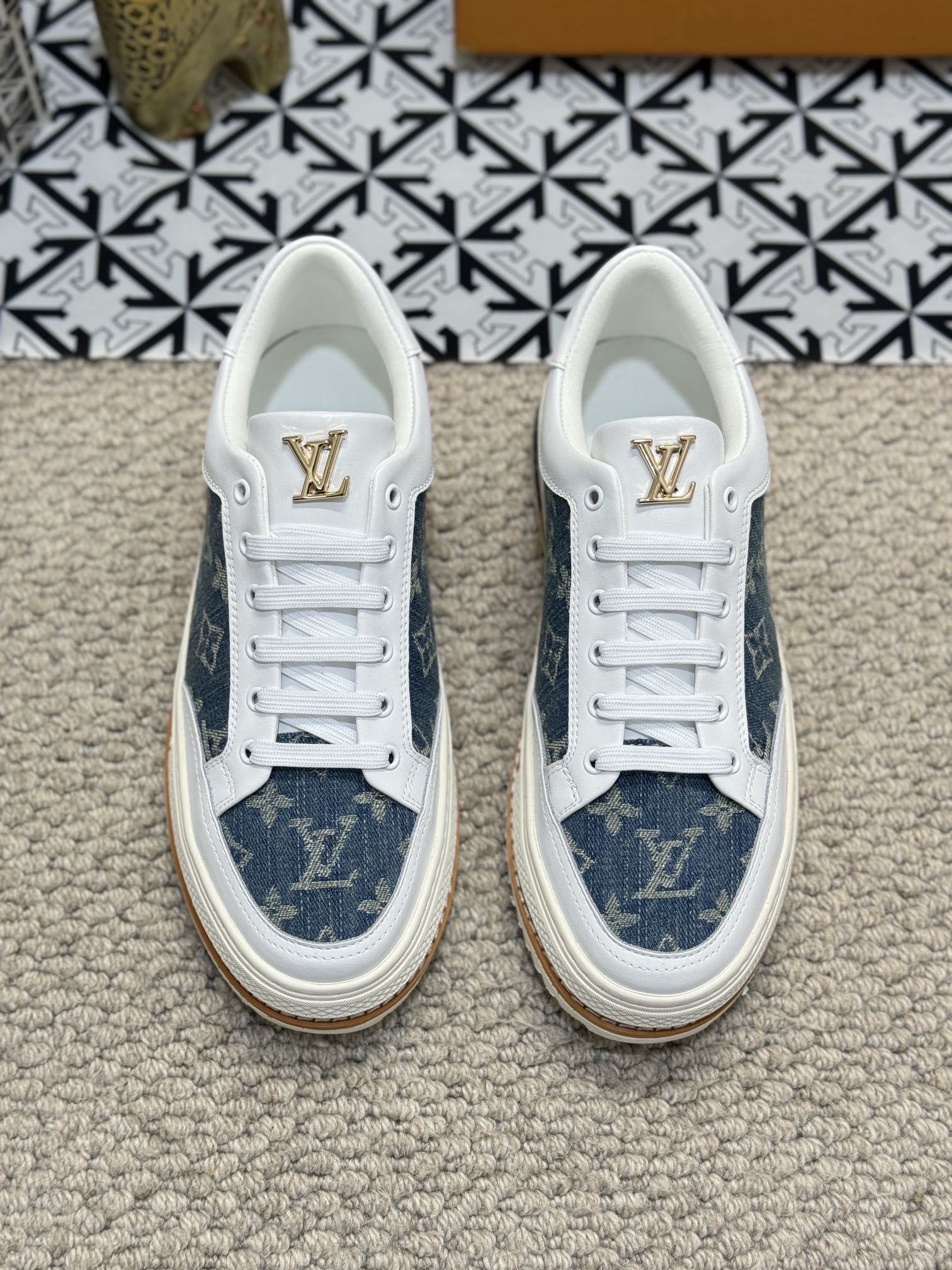 LV TRAINERS IN WHITE CALFSKIN AND BLUE DENIM JACQUARD