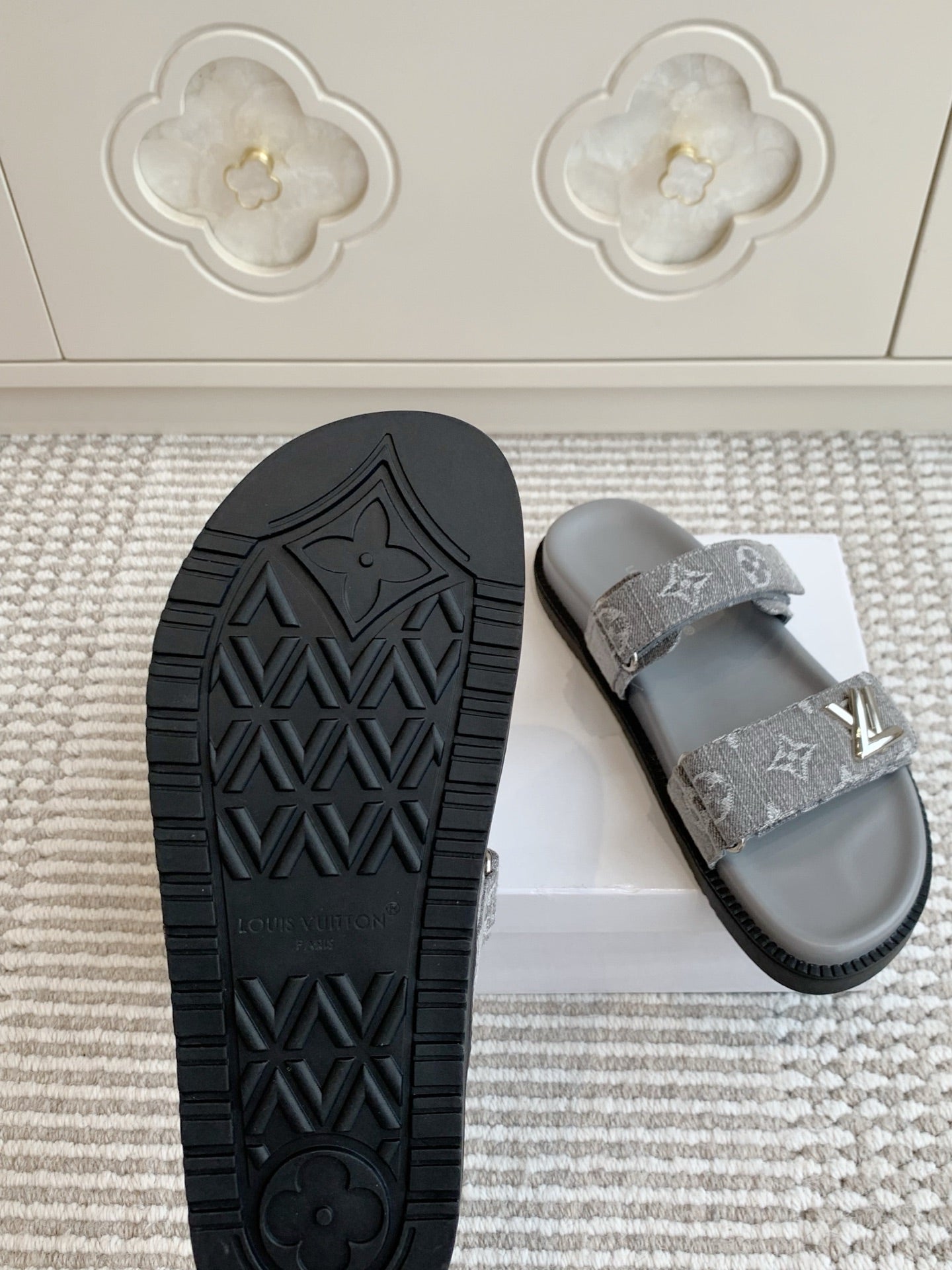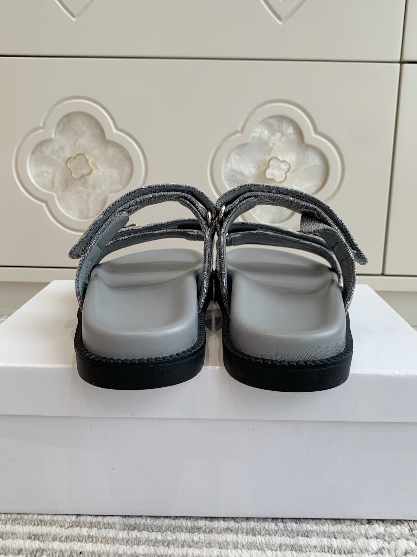 LV TWO-STRAP SANDALS 25S IN GREY DENIM AND CALFSKIN WITH SILVER HARDWARE