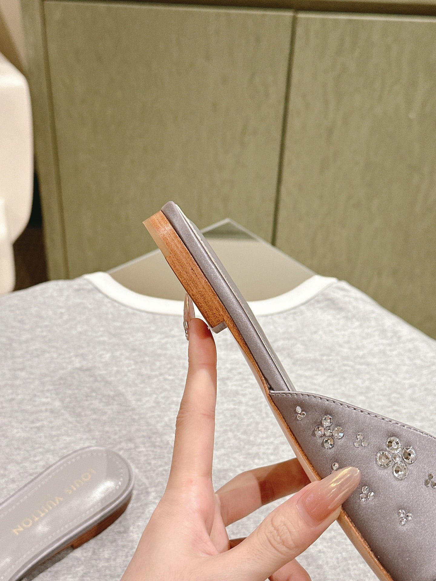 LV WOMEN FLAT MULE IN PASTEL PURPLE SATIN WITH RHINESTONE