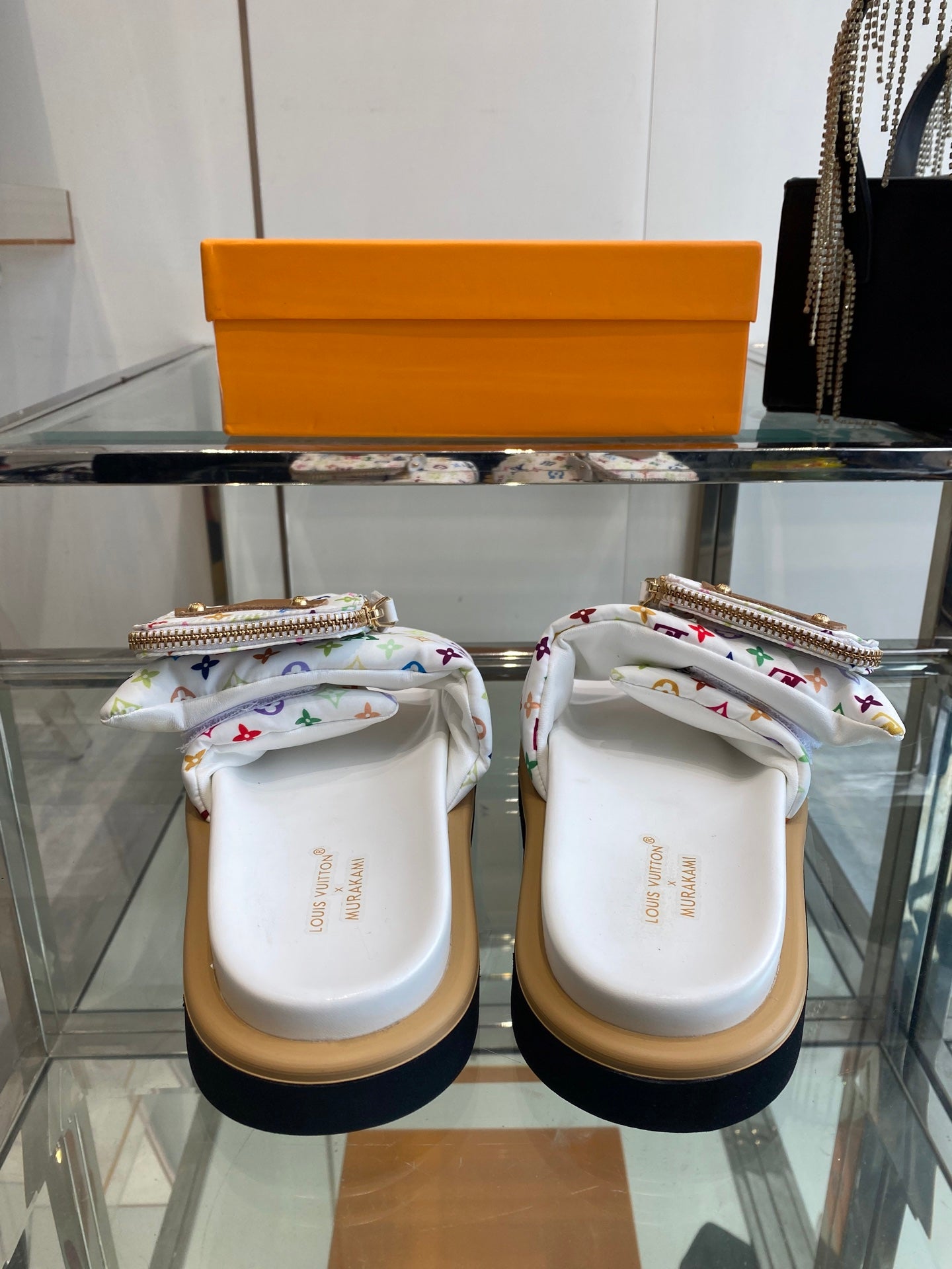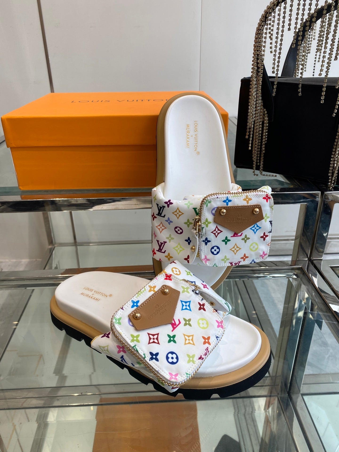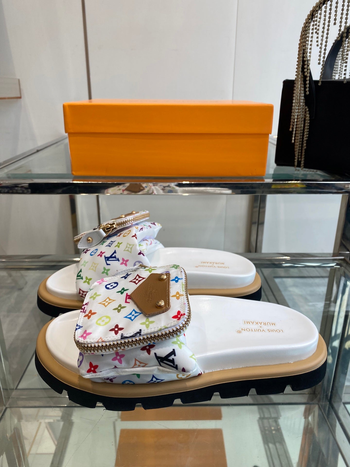 LV x TAKASHI MURAKAMI SLIDES IN MULTICOLOR FABRIC WITH ZIP POCKET STRAP