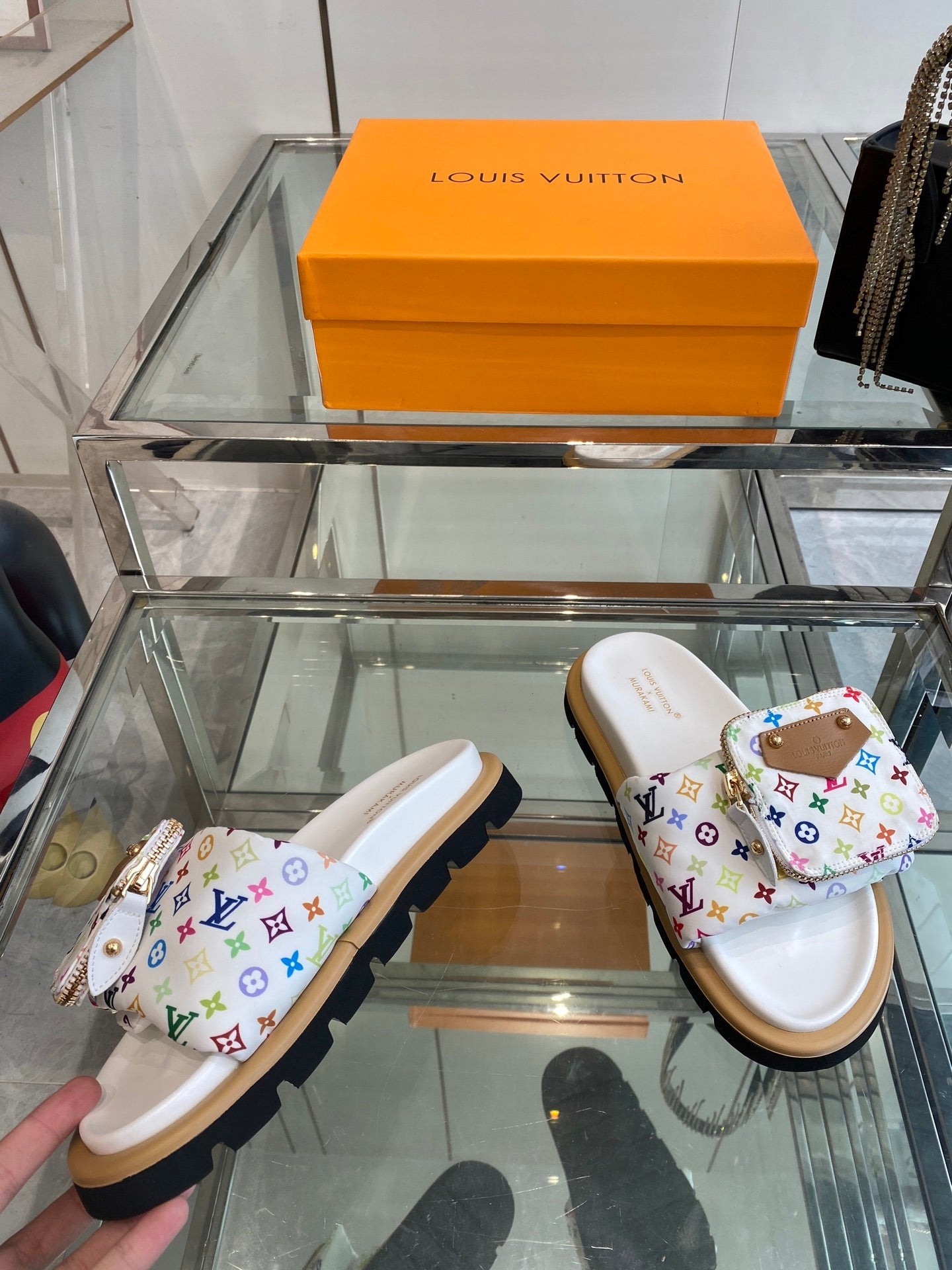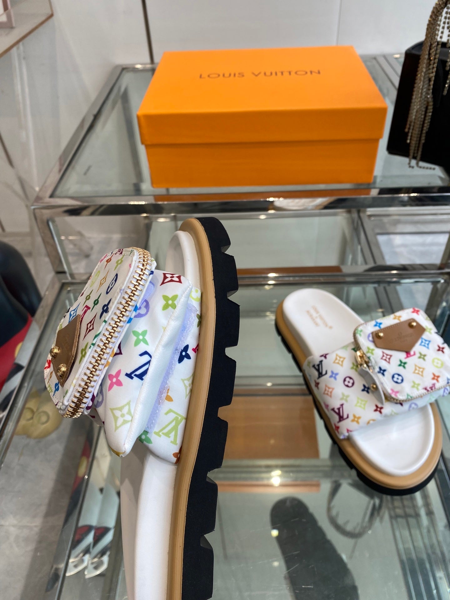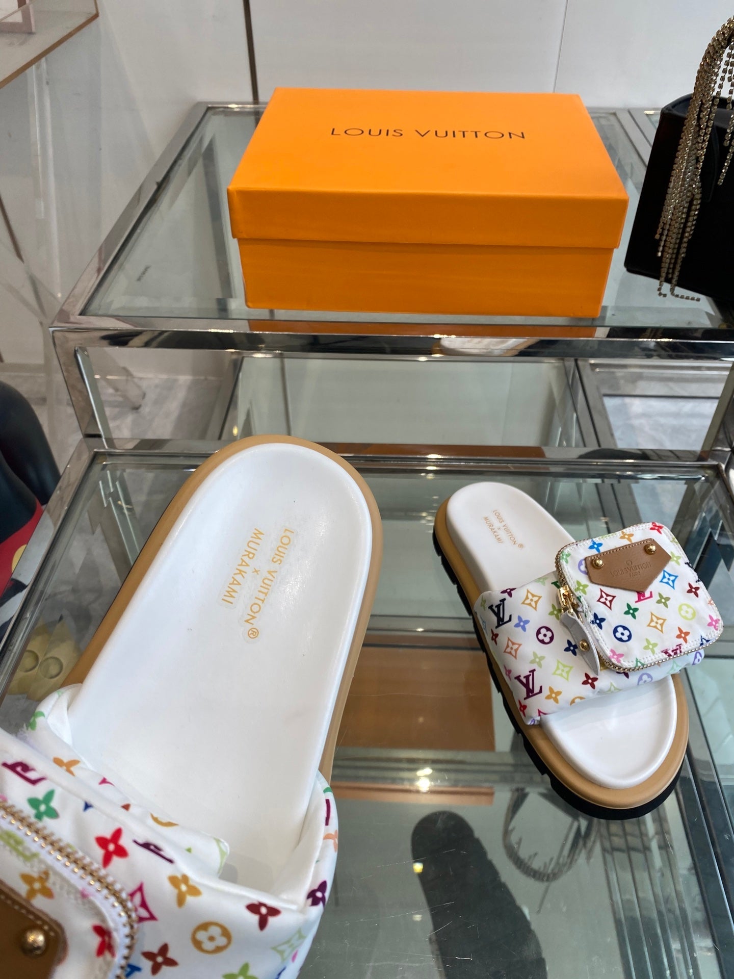 LV x TAKASHI MURAKAMI SLIDES IN MULTICOLOR FABRIC WITH ZIP POCKET STRAP
