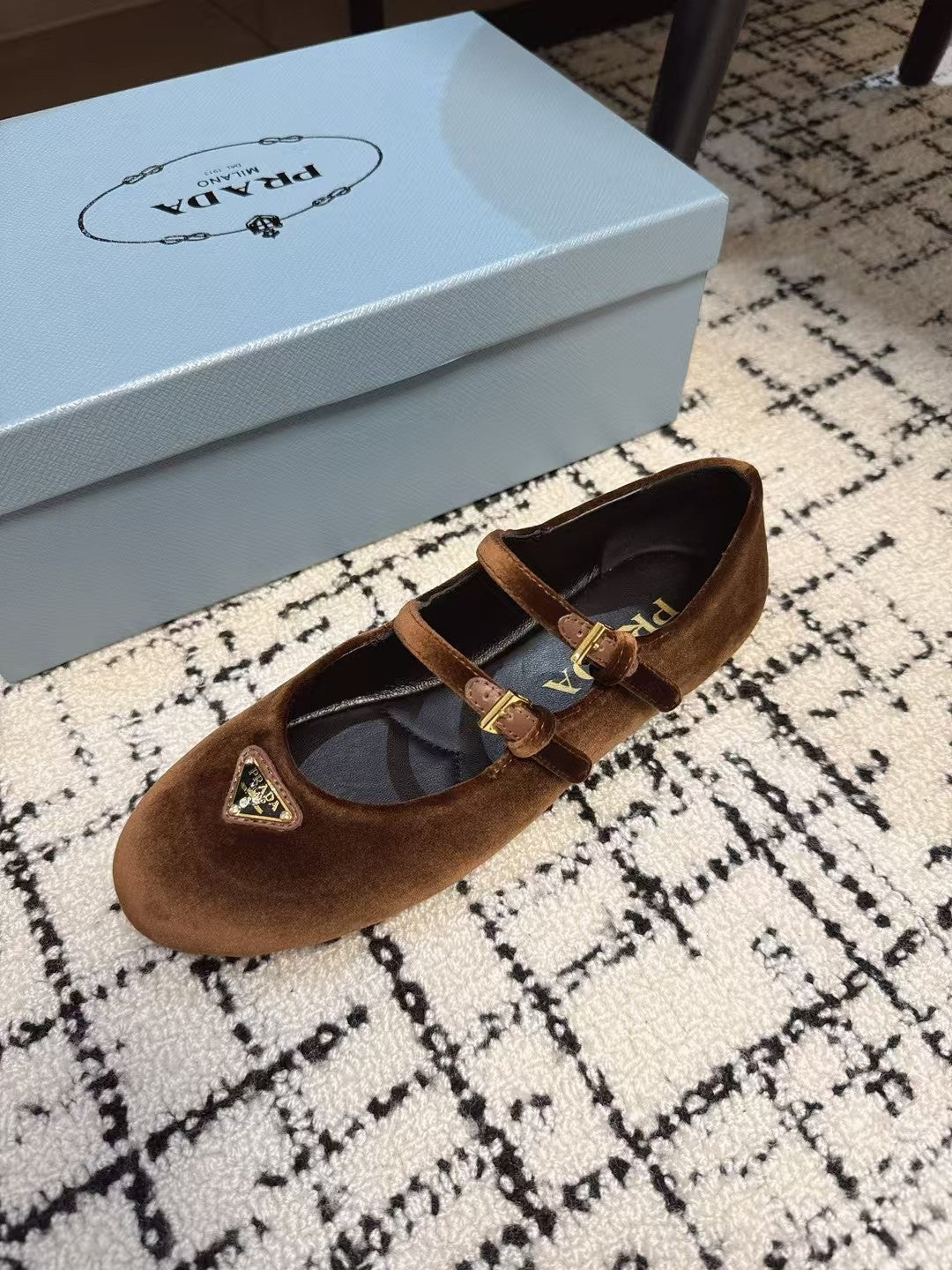 MARY JANE FLAT WITH TRIANGLE LOGO IN RUSSET BROWN VELVET