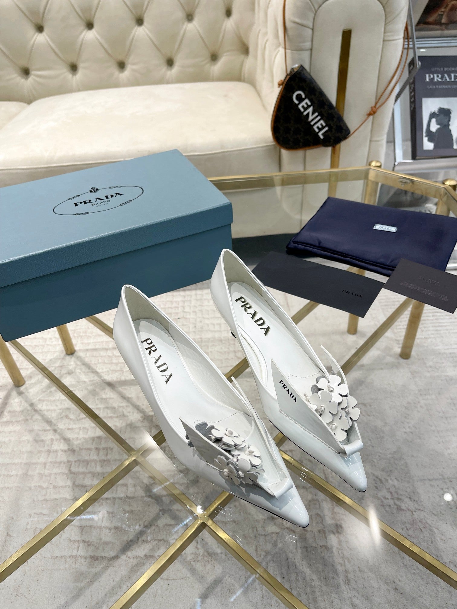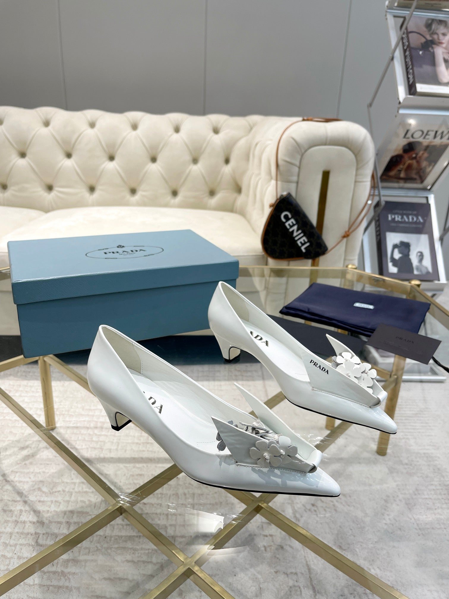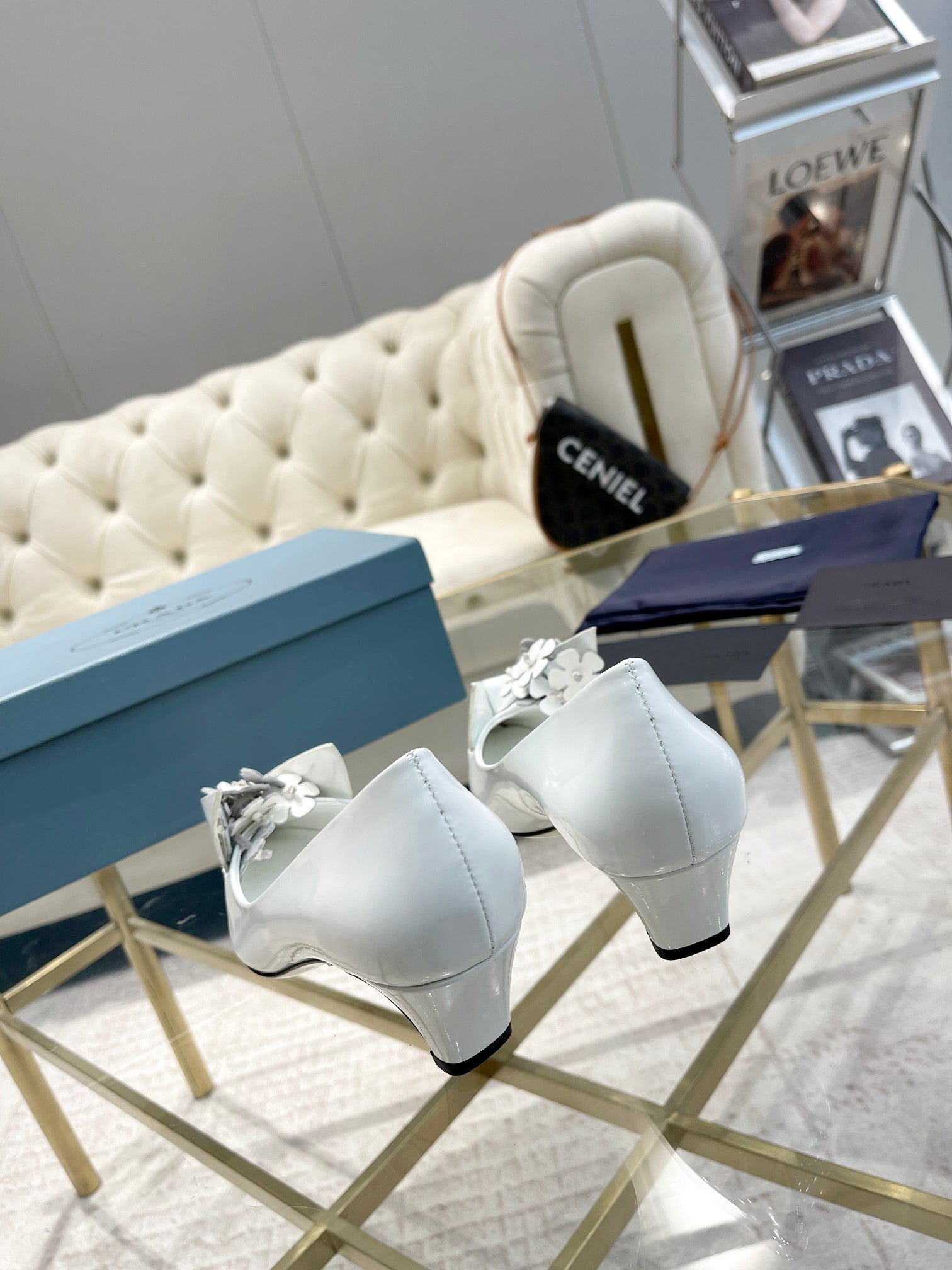 MEDIUM HEEL PUMPS IN WHITE PATENT CALFSKIN ATTACHED CREATIVE FLOWERS